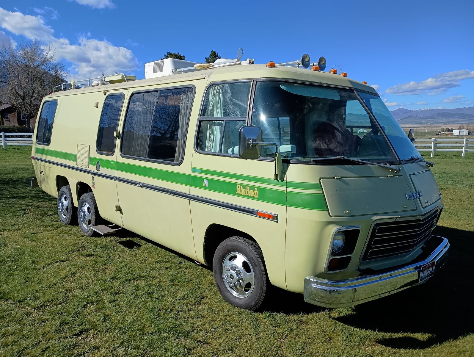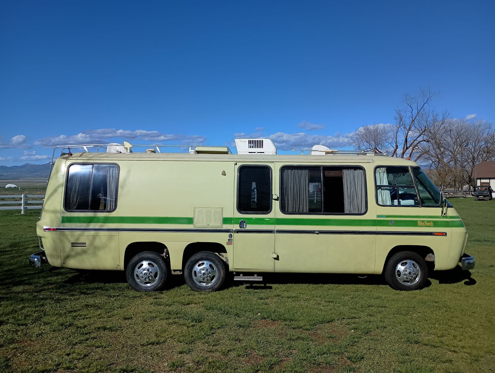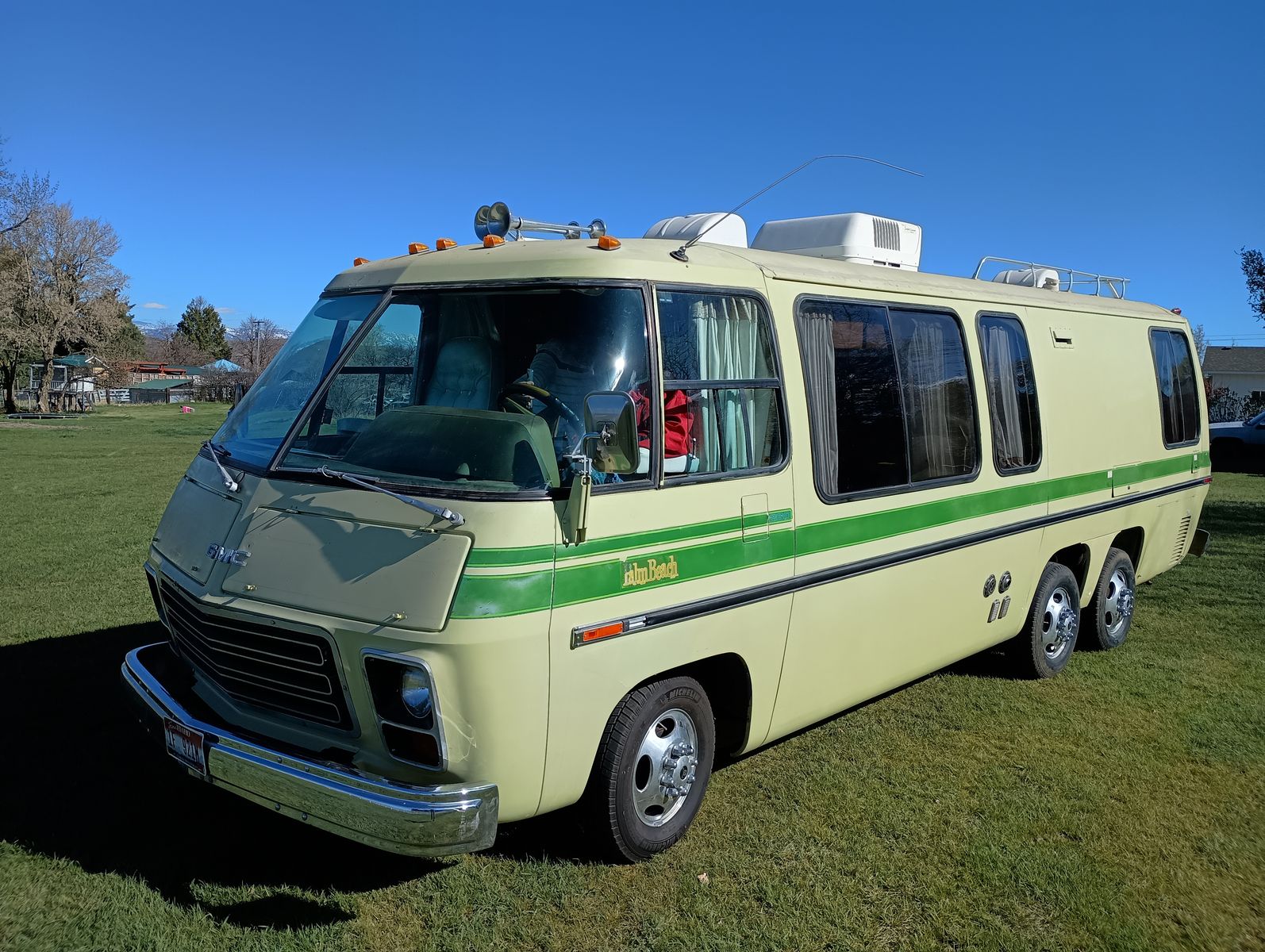 1976 GMC Palm Beach Motorhome for sale. True collector. Starts well, runs well and drives well. Brakes are good. Has an air bag ride system. Has a dinette that converts into a bed and two sofas in the rear that convert into one bed. Some modifications have been made to better move air through the radiator. Has Michelin tires with aluminum rims. It gets used every year for several trips. These motorhomes have an Oldsmobile 455 front-wheel drive power train. Has been stored in a shop when not in use for 25 years. No leaks. Also has a working Onan generator. All of the plumbing works.