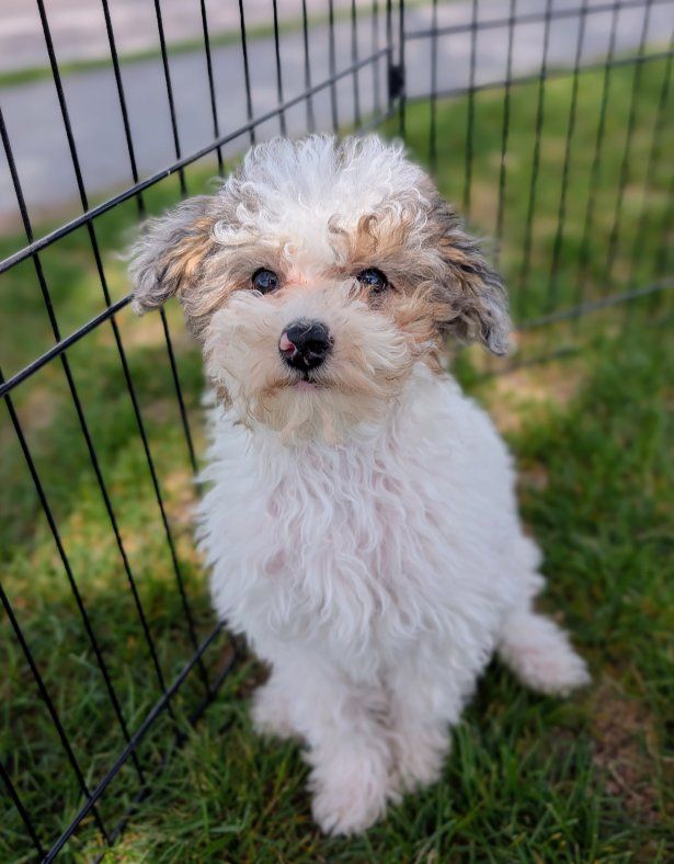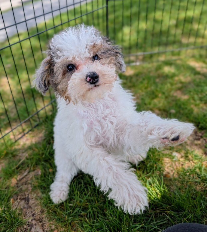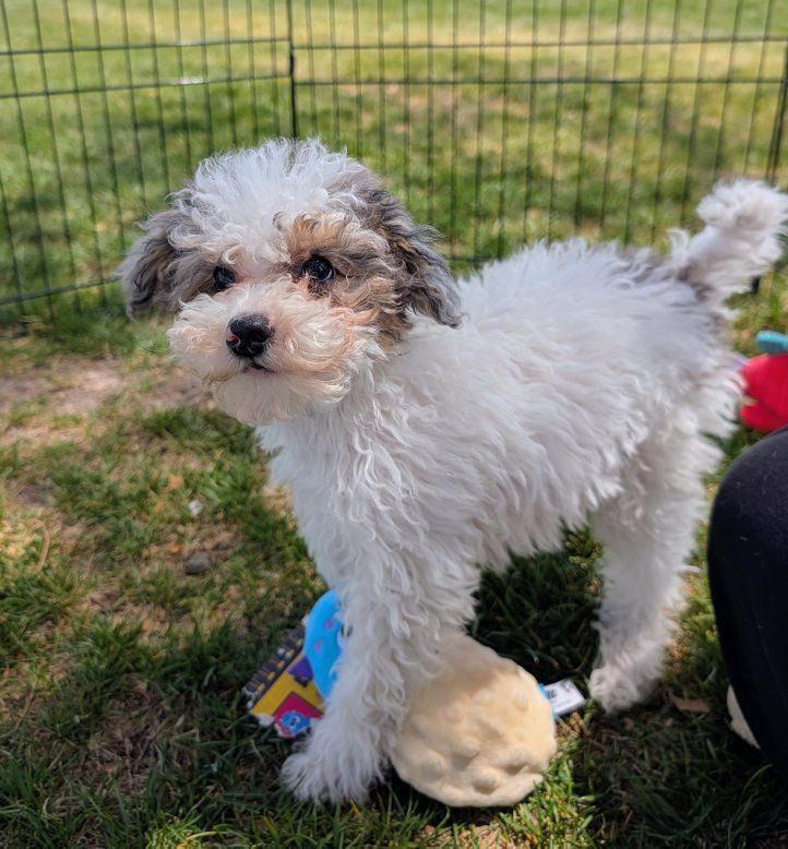Mini Labradoodle female Estimated 10–15 lbs fully grown F1BB - high poodle content, hypoallergenic coat Merle tricolor markings 10 weeks old - ready to go home now