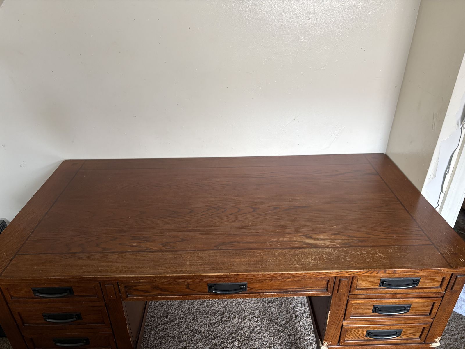 It features seven drawers total (three on each side plus a center drawer), offering generous storage while maintaining a clean, functional workspace. The wood grain is especially beautiful across the top, giving it a warm, traditional look that works in both home offices and cozy study spaces.