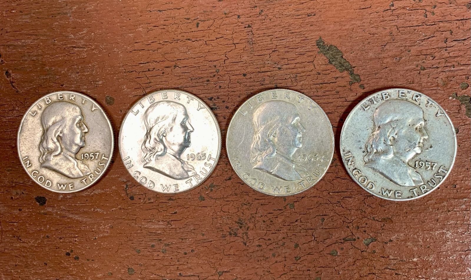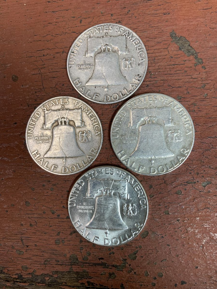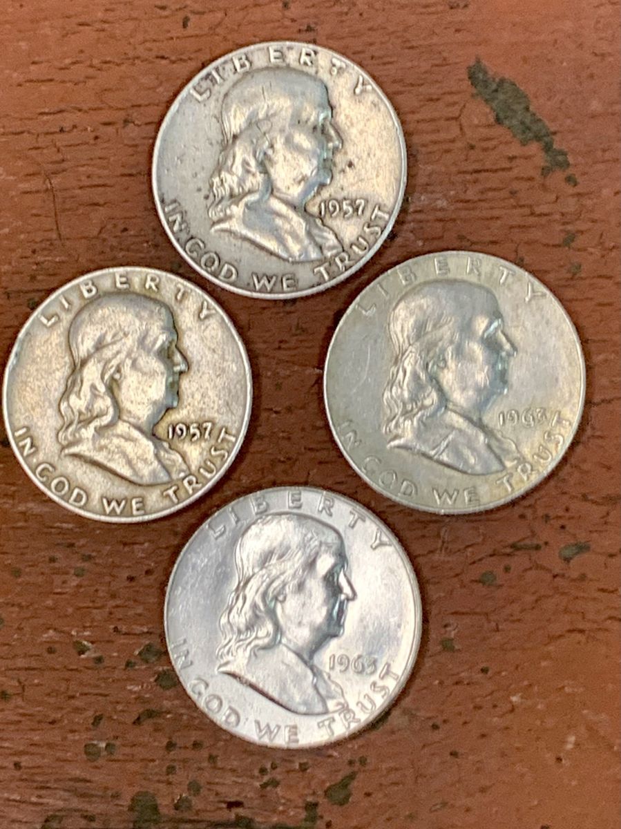 ApplePay4-Coin Lot Franklin Half Dollars 90% US Silver Coins 1957D 1963D 1963P 1957D Lot of 4 Franklin Half Dollars. 90% silver coins. Nice circulated condition. Please see photos for detail. The coins pictured are the coins you will receive. Please message with any questions