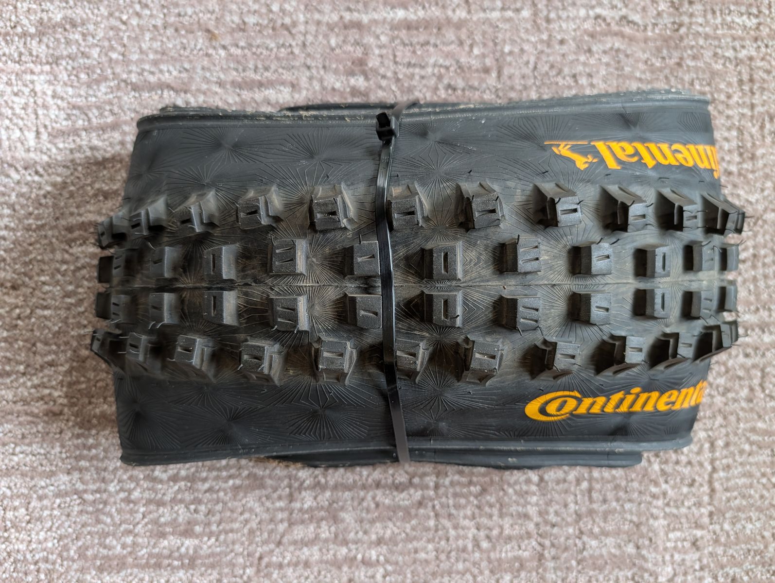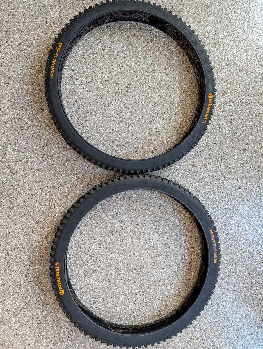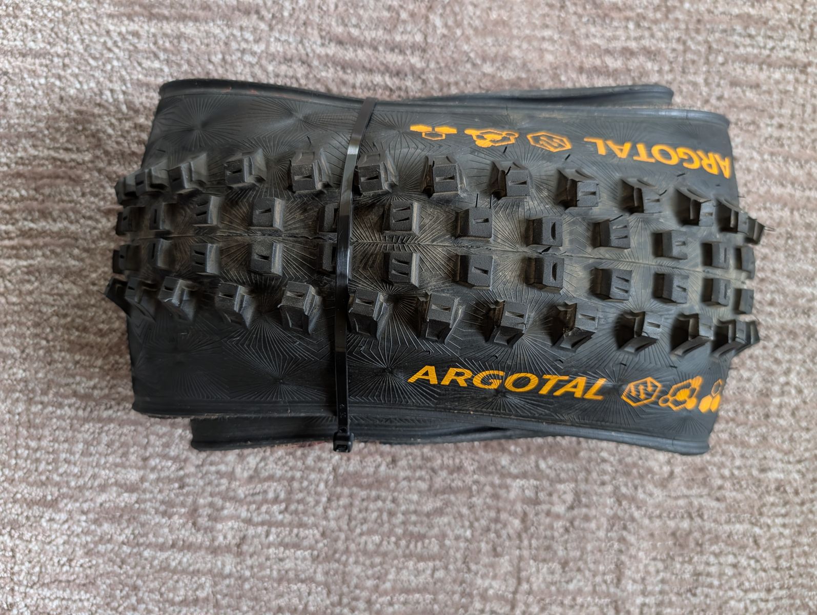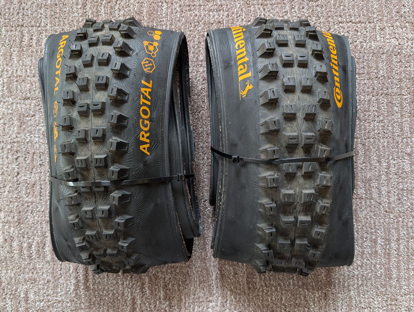 VenmoTwo Continental Argotal tires. One is 2.4 the other 2.6. Buy as a pair for $80. Tires are take-offs from a bike I purchased. The previous owner said he had about 200 miles on them, they look new. These are a little too much tire for the terrain I ride. Perfect for enduro riders. These have the soft compound and enduro casing. You can learn more about these tires on this website: https://www.continental-tires.com/products/bicycle/tires/argotal/?articleID=01506920000