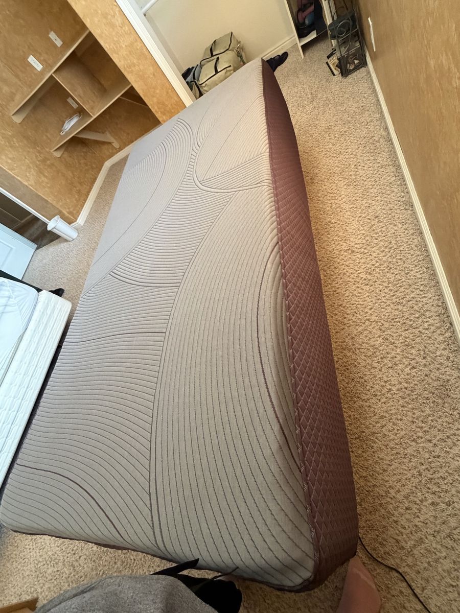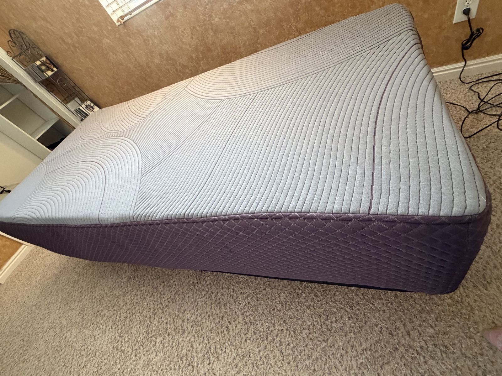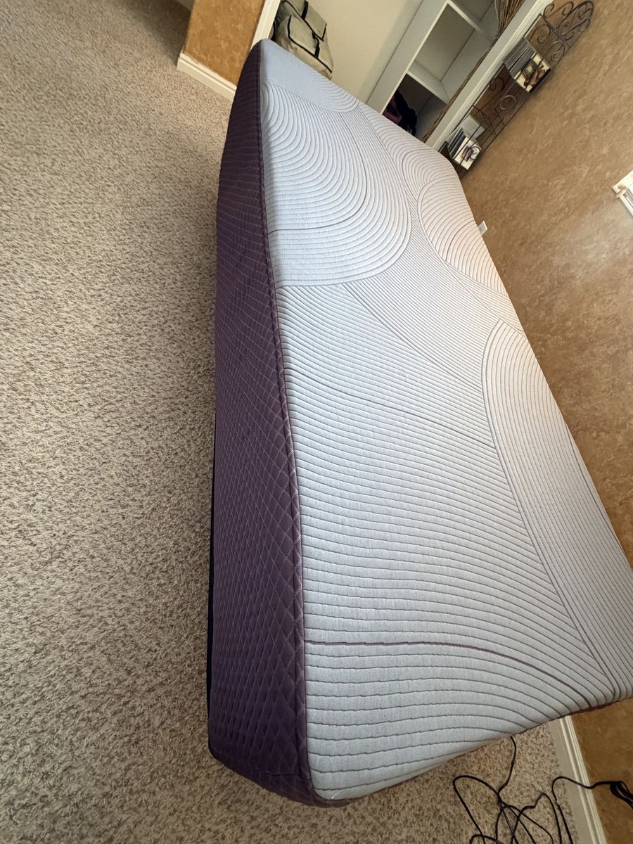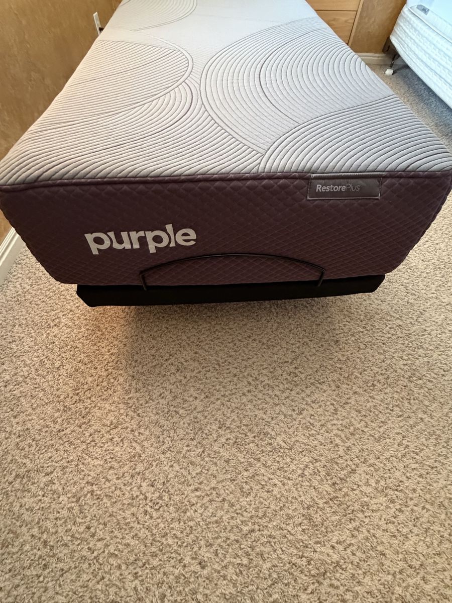 New Premium Purple RestorePlus mattress comes with an adjustable power base. This hybrid mattress has the signature GelFlex Grid for pressure relief and cooling. The fabric is a clean grey and purple knit.