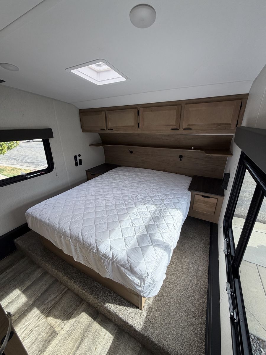 This 5th wheel is in immaculate condition, has front queen bed with washer and dryer, 2 large rear bunks, wrap around dinette, couch that fold out into a bed. Sleeps 8 comfortably.