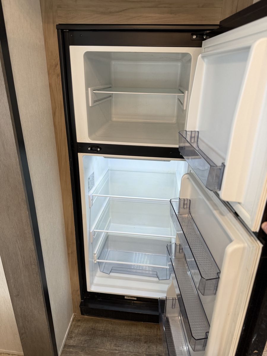 Kitchen has 3 burner gas stove, convection microwave and air fryer, large 12v residential fridge, farm sink with tons of counter space.