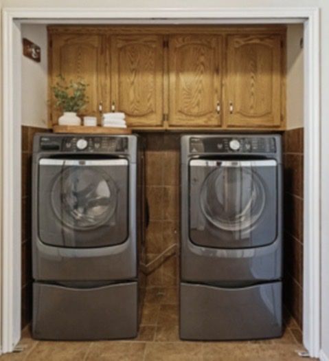 Beige Laundry Cabinets (2 individual sets): 31 H x 12 D x 37 W