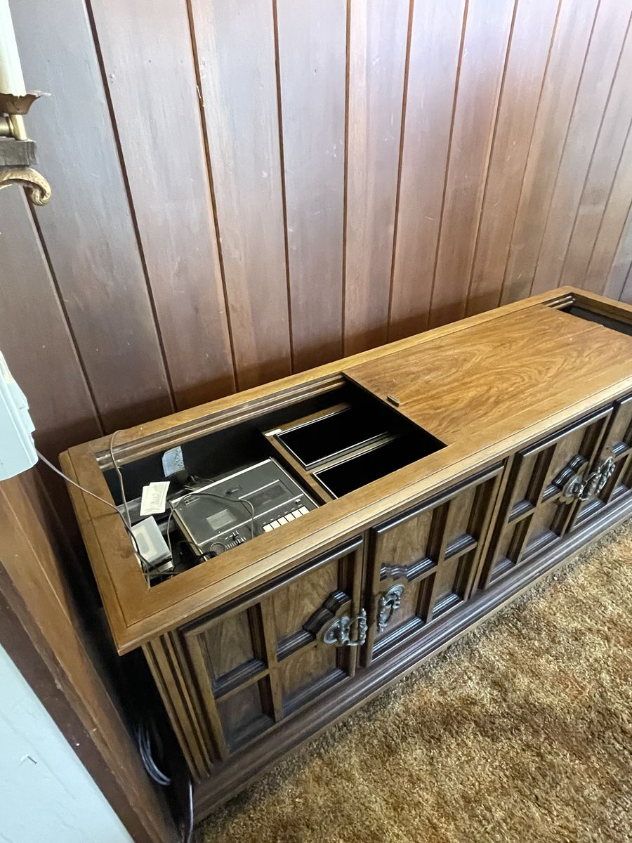 End tables, coffee table, cabinet, entertainment center, record player, chest of drawers, changing table, grill