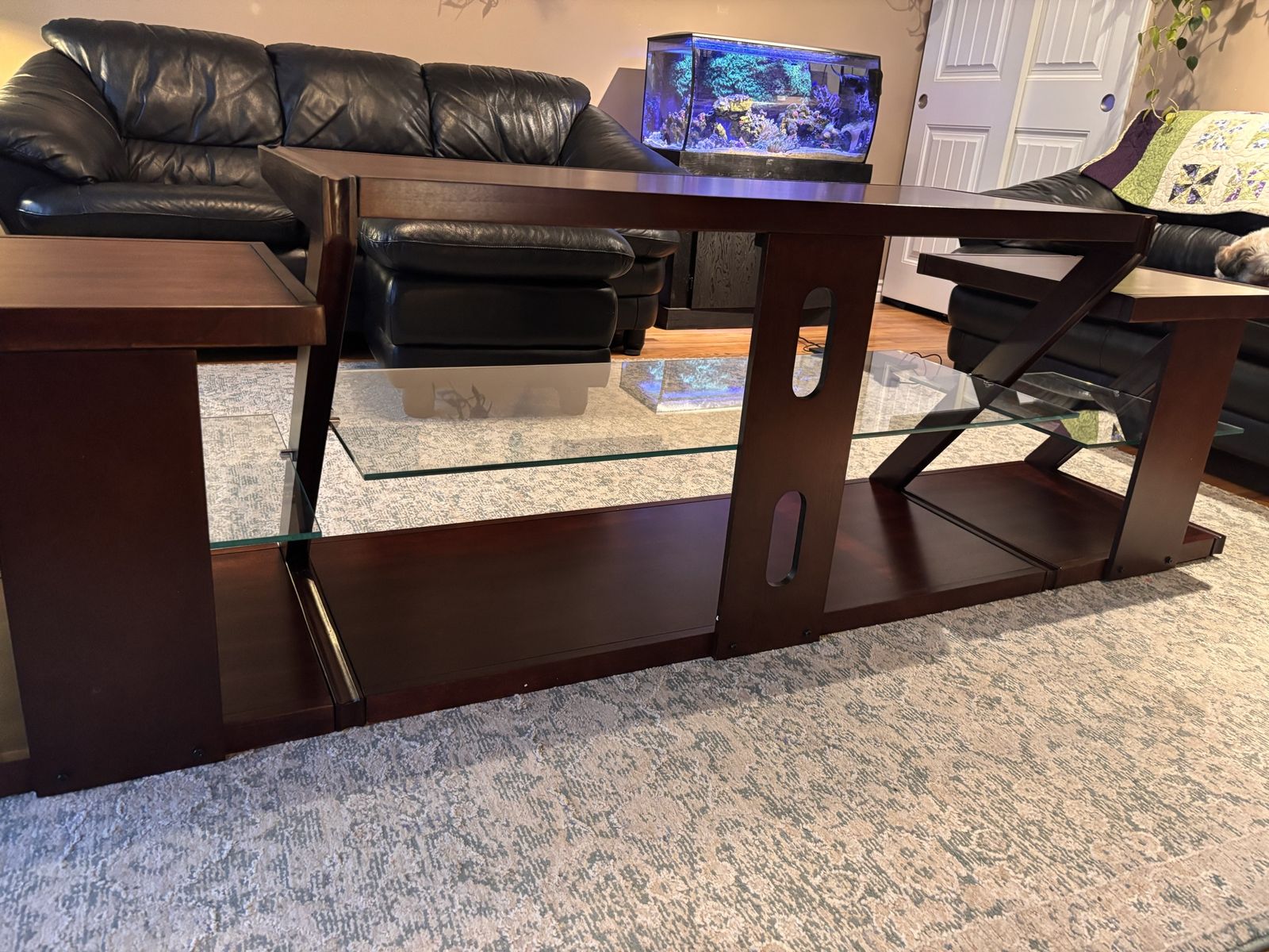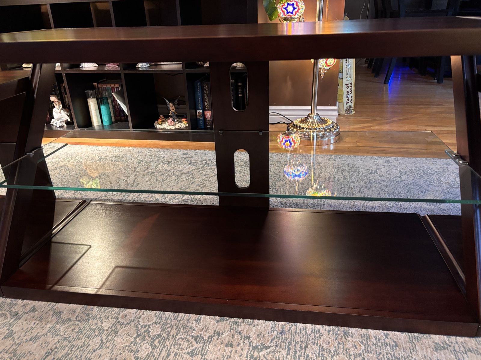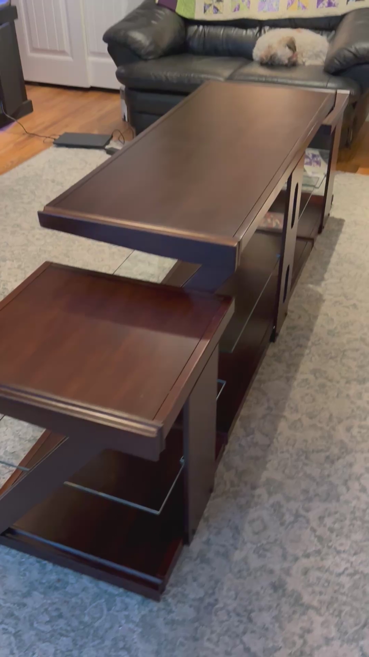 Dimensions: 84" L x 19" W x 25" H Solid wood construction – premium quality 3 tempered glass shelves – perfect for media, consoles & décor Modern Z-frame design – stylish and sturdy