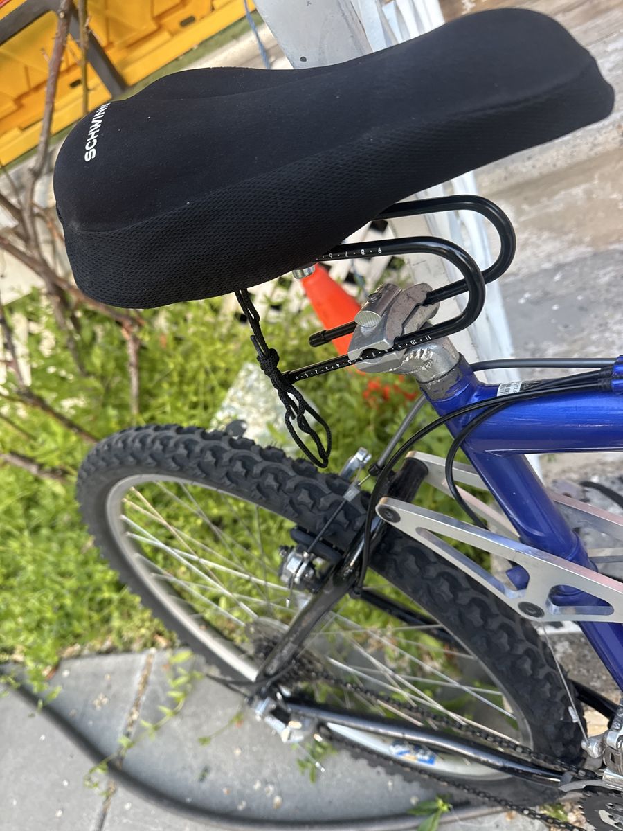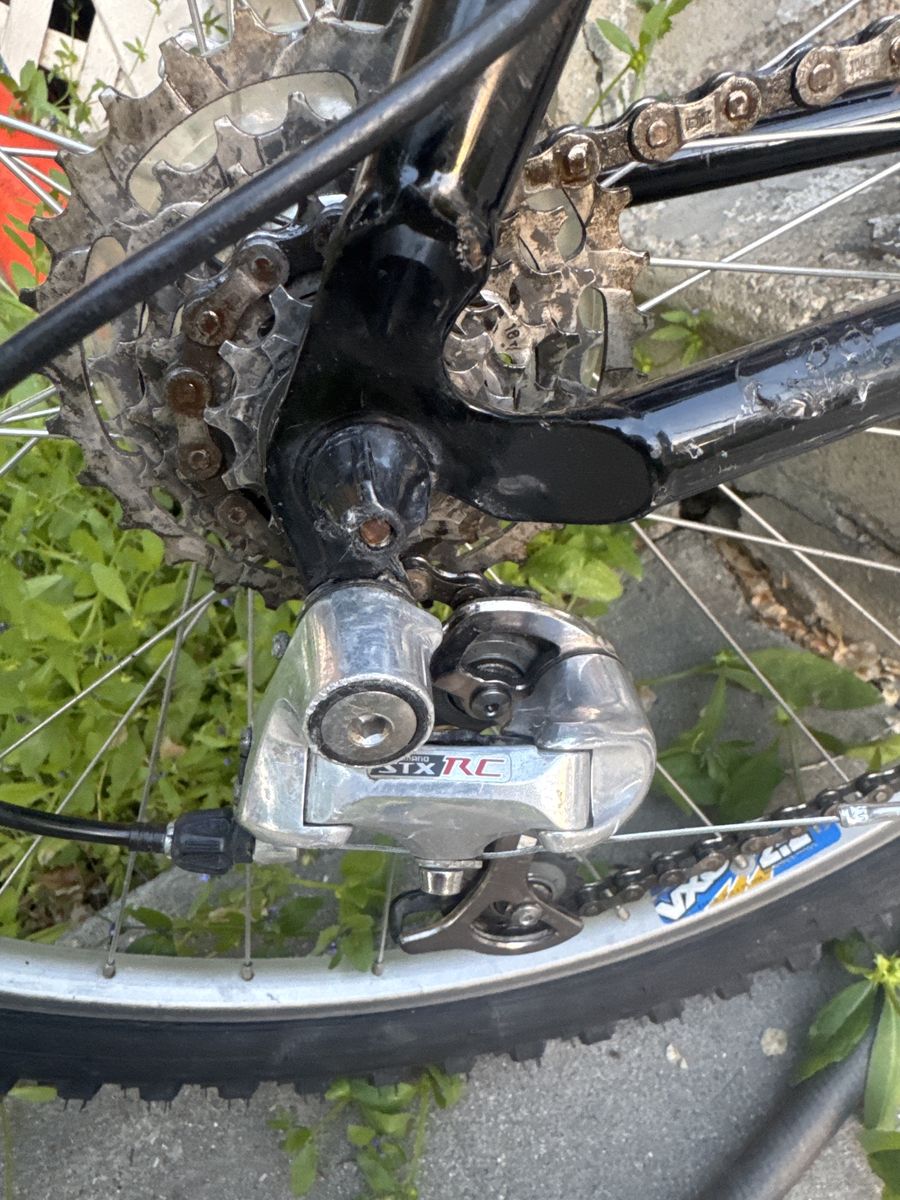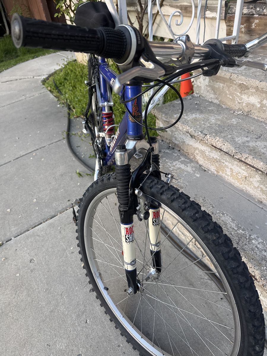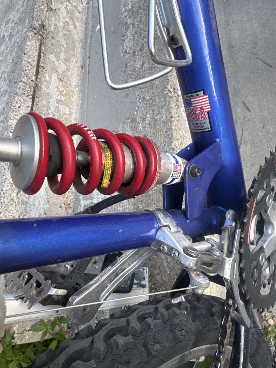 VenmoGood shape. Double butted chrome moly frame. Cleaned with new rear brake cable & housing, new rear derailleur cable, new rear grip shift on the right shifting the 7 speed rear shimano STX derailleur. Triple crank in the front that shifts smoothly. Frame built in USA. 26” wheels. Only problem is I can’t raise or lower seat post. Maybe you can. Front Derailleur is Shimano STX. Crank is STX. Rock Shox Indy front fork. Rock Shox Deluxe rear shock. eBay is selling this for $250.