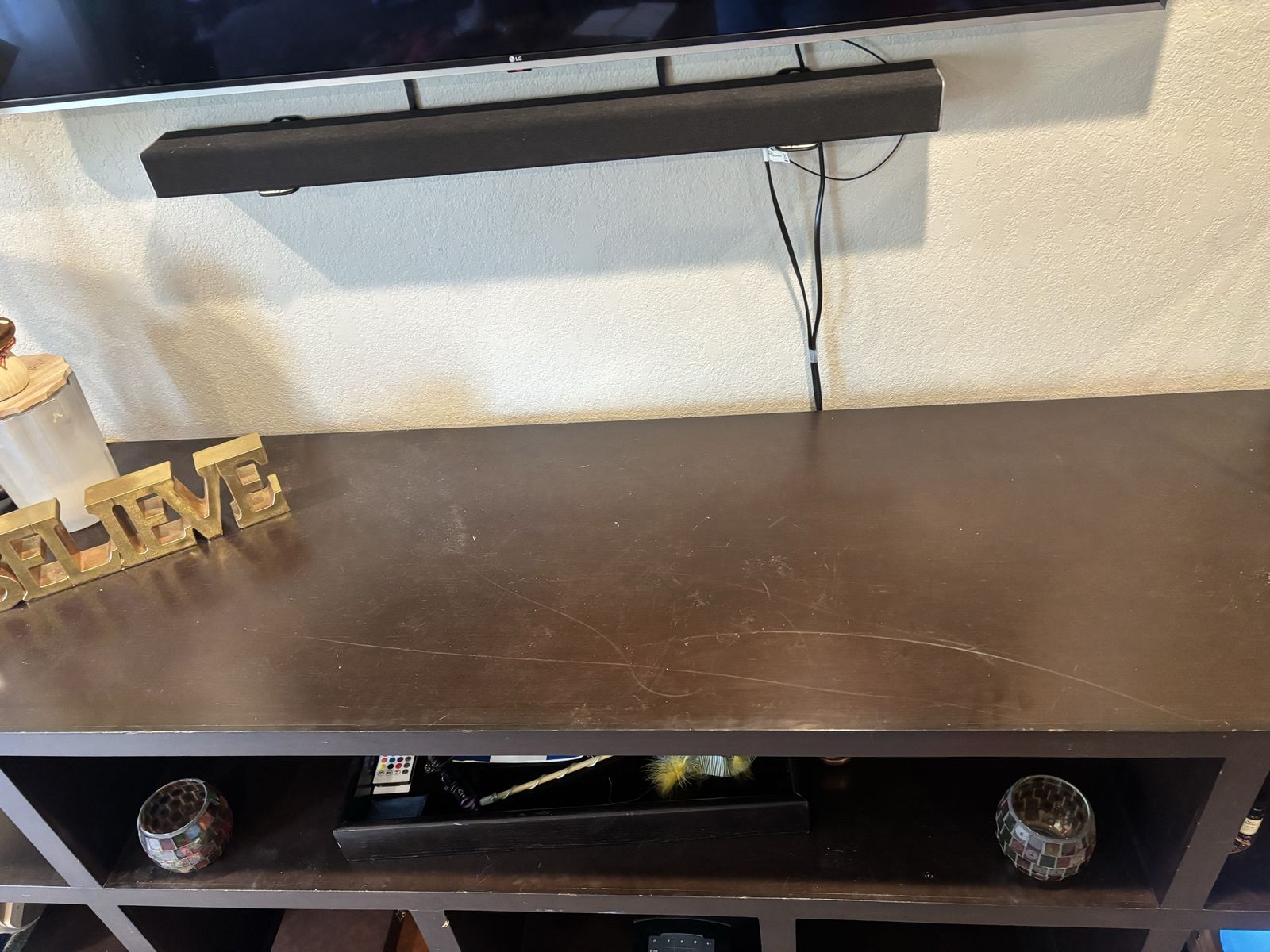 ApplePaydark brown tv stand with three 15” storage cubes and cute side shelves. Has a power box on the back for compacted, one stop appliance cord organization. Used but in good condition. Normal signs of wear and a scratch on top (easily covered with table runner). Too large for my space
