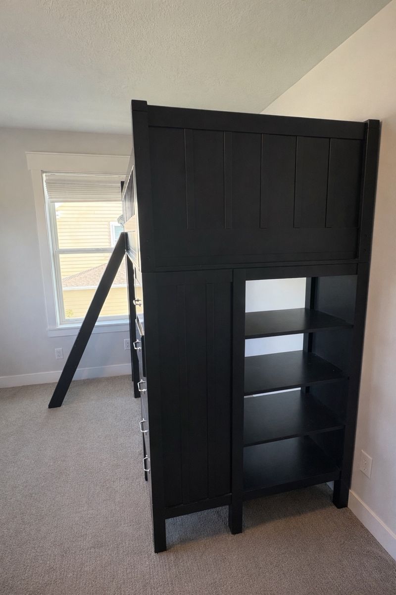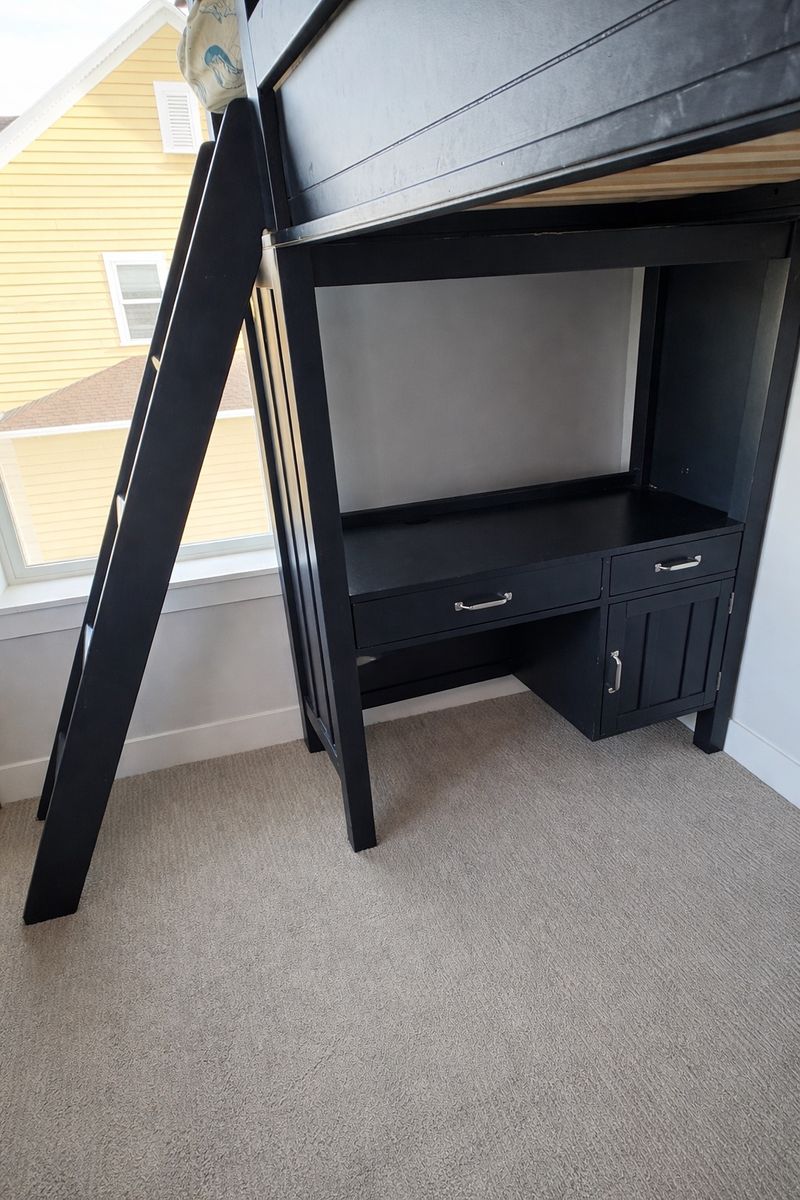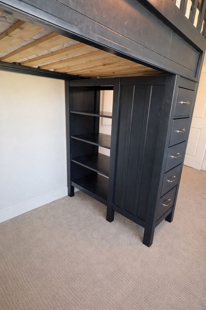 Full loft-style bunk bed Built-in desk area underneath (plenty of legroom to sit/work) Multiple drawers + open shelving for storage Sturdy and well-built (not flimsy) Mattress included if needed.