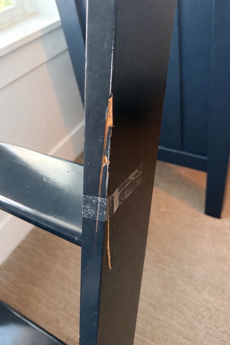 It has pretty normal wear with the exception of some minor cosmetic damage on one leg (paint chip with some exposed wood—see photo). Does not affect stability or function.