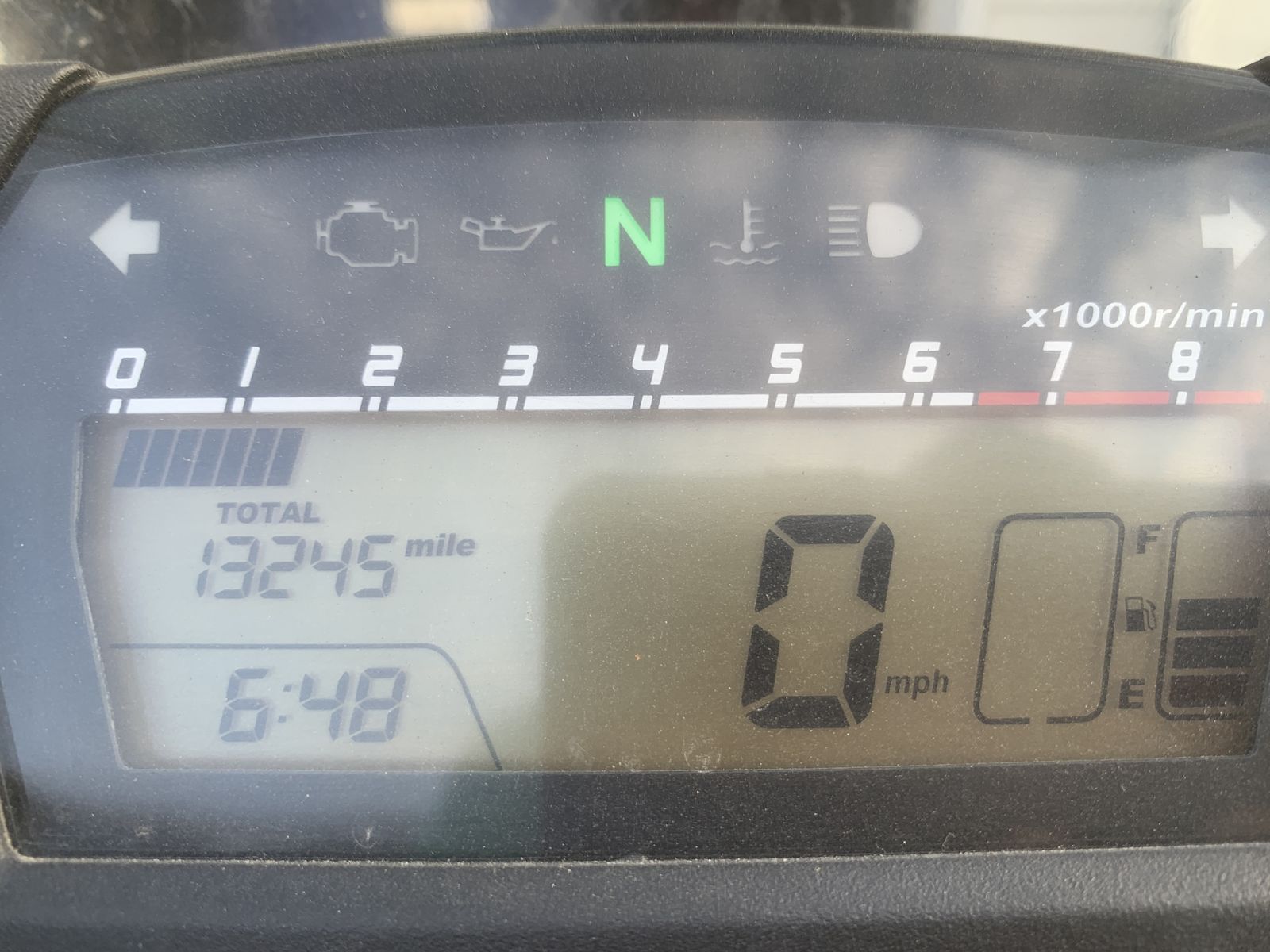 The first owner had to replace the digital dash at 2,000 miles and so the mileage is supposedly showing that much less than what is actually on the bike. That first owner had a friend that mishandled the bike next to a curb and the curb contacted the muffler and made a dent. I had always intended to replace the muffler but it ended up not bothering me much and I like how quiet the bike is and I didn't want to make it louder. There is also a very small crack in the passenger seat that I tried to get a picture of but it is just hairline.