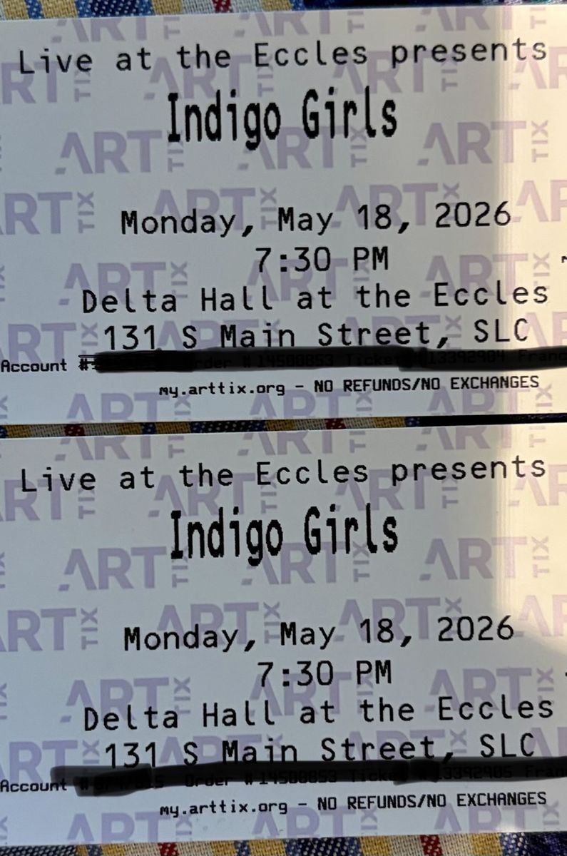 VenmoTwo tickets $350 total, cash or Venmo. Hard tickets in hand directly from the theater. No digital transfer. Indigo Girls LIVE at Eccles Theatre 7:30pm Monday, May 18. Truly some of the best seats in the theatre! Orchestra Center - Row C -Seats 10-11. See the attached seating chart. Text me anytime with questions. I’m happy to meet you in the SLC area or I can send them USPS Priority 2 day mail for an extra $10. 100% authentic tickets. I’m a local, verified, longtime buyer/seller on KSL. Thanks for looking.
