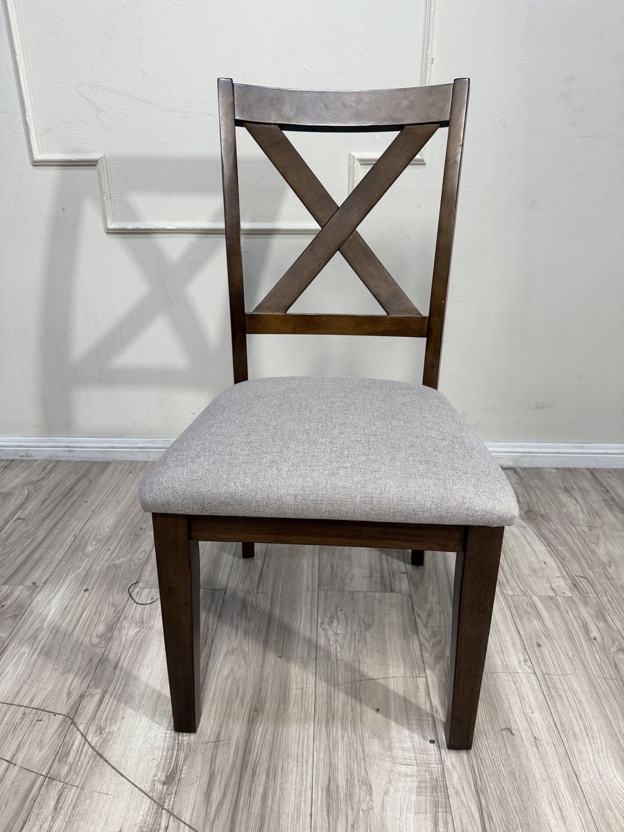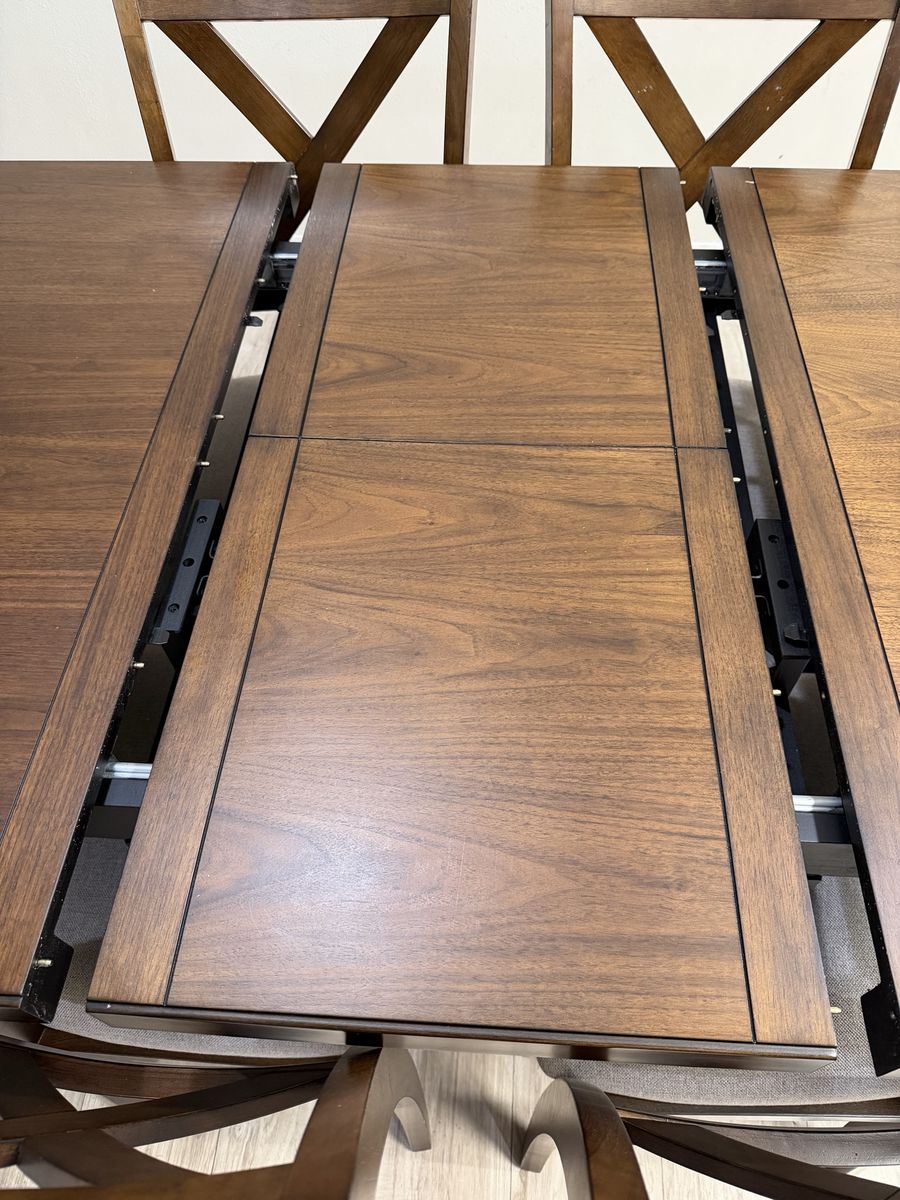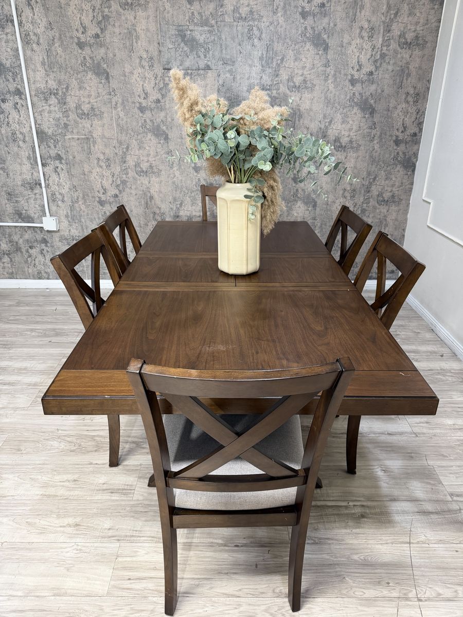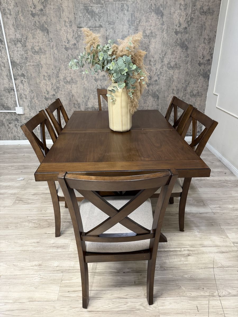 The Lathan 7-Piece Dining Table Set transforms modern farmhouse into contemporary chic. Rich brown walnut veneers and rubberwood solids make for a strong foundation for plenty of family dinners and friendly get-togethers. The picnic-style table features criss cross legs and a built-in folding leaf that easily extends your welcome to even more guests. Six fabric upholstered chairs, complete with foam seat cushions and protective floor glides, offer a comfy place to sit back, relax and enjoy good company and good food.