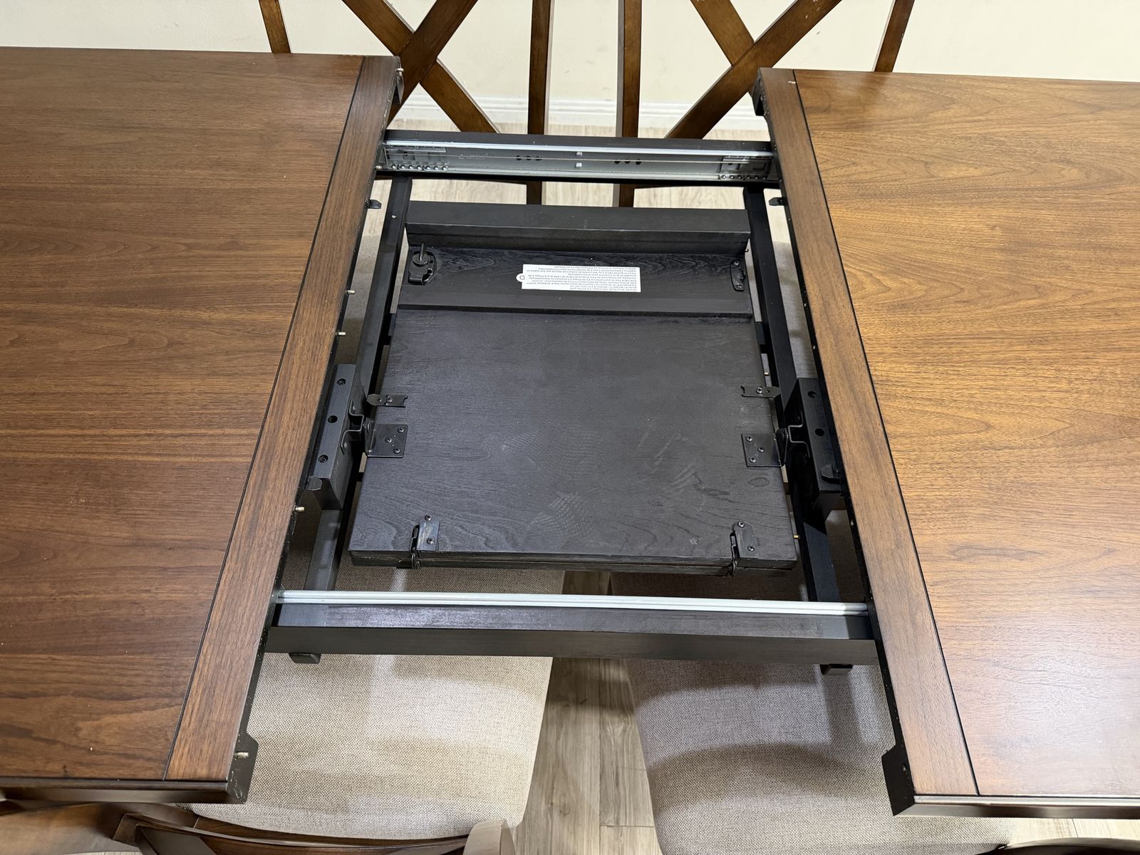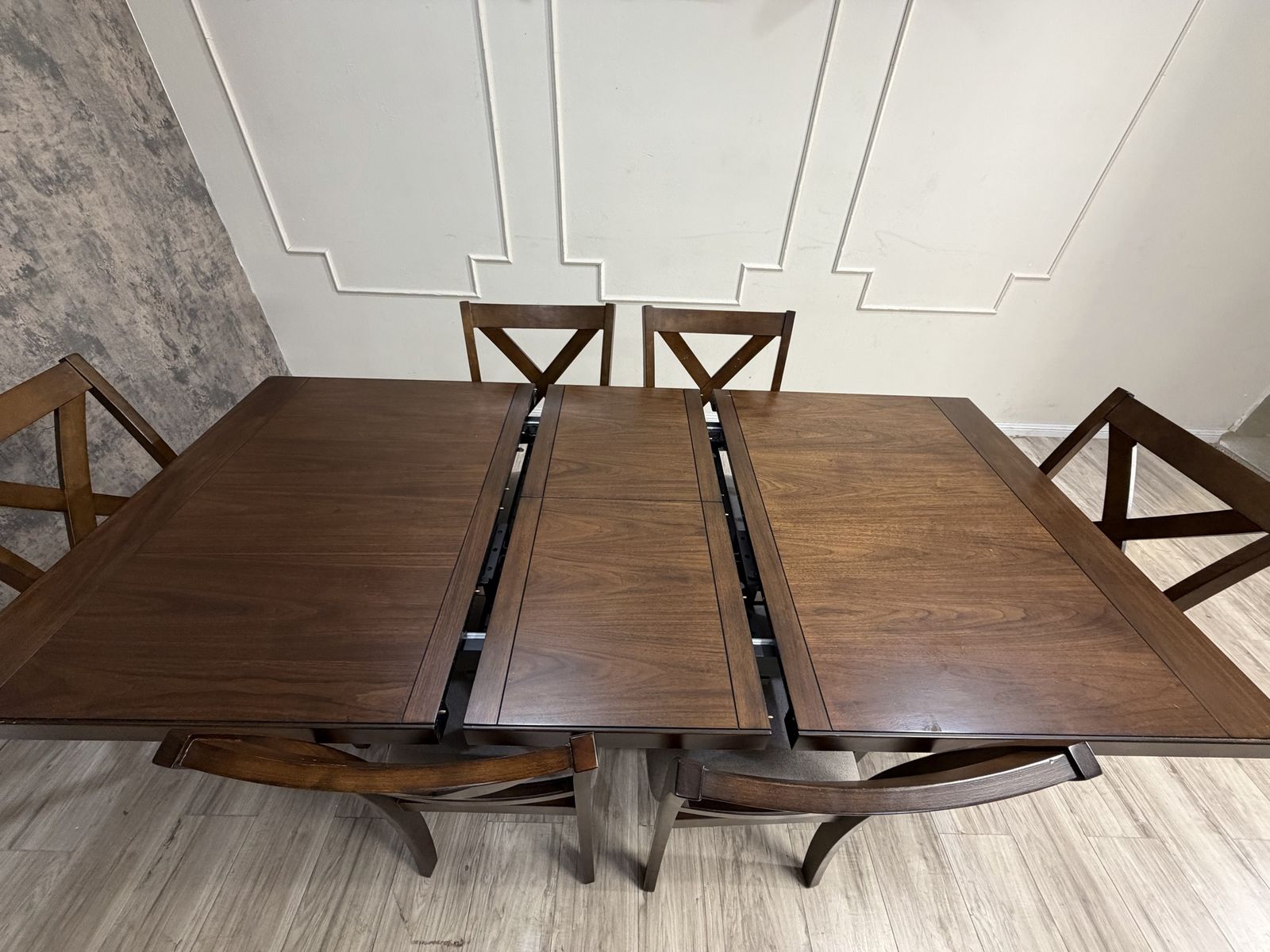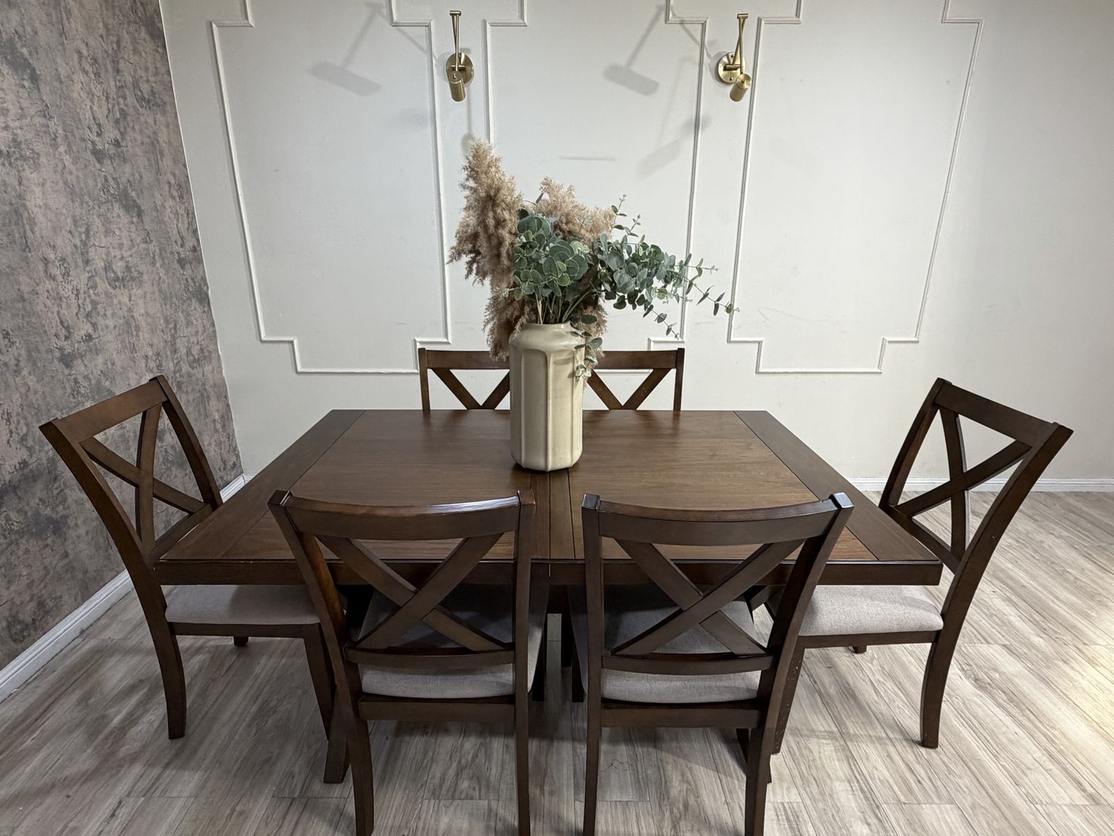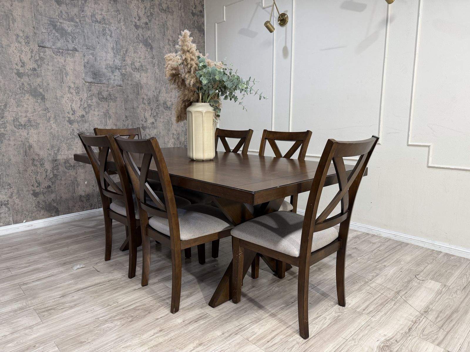 The Lathan 7-Piece Dining Table Set transforms modern farmhouse into contemporary chic. Rich brown walnut veneers and rubberwood solids make for a strong foundation for plenty of family dinners and friendly get-togethers. The picnic-style table features criss cross legs and a built-in folding leaf that easily extends your welcome to even more guests. Six fabric upholstered chairs, complete with foam seat cushions and protective floor glides, offer a comfy place to sit back, relax and enjoy good company and good food.