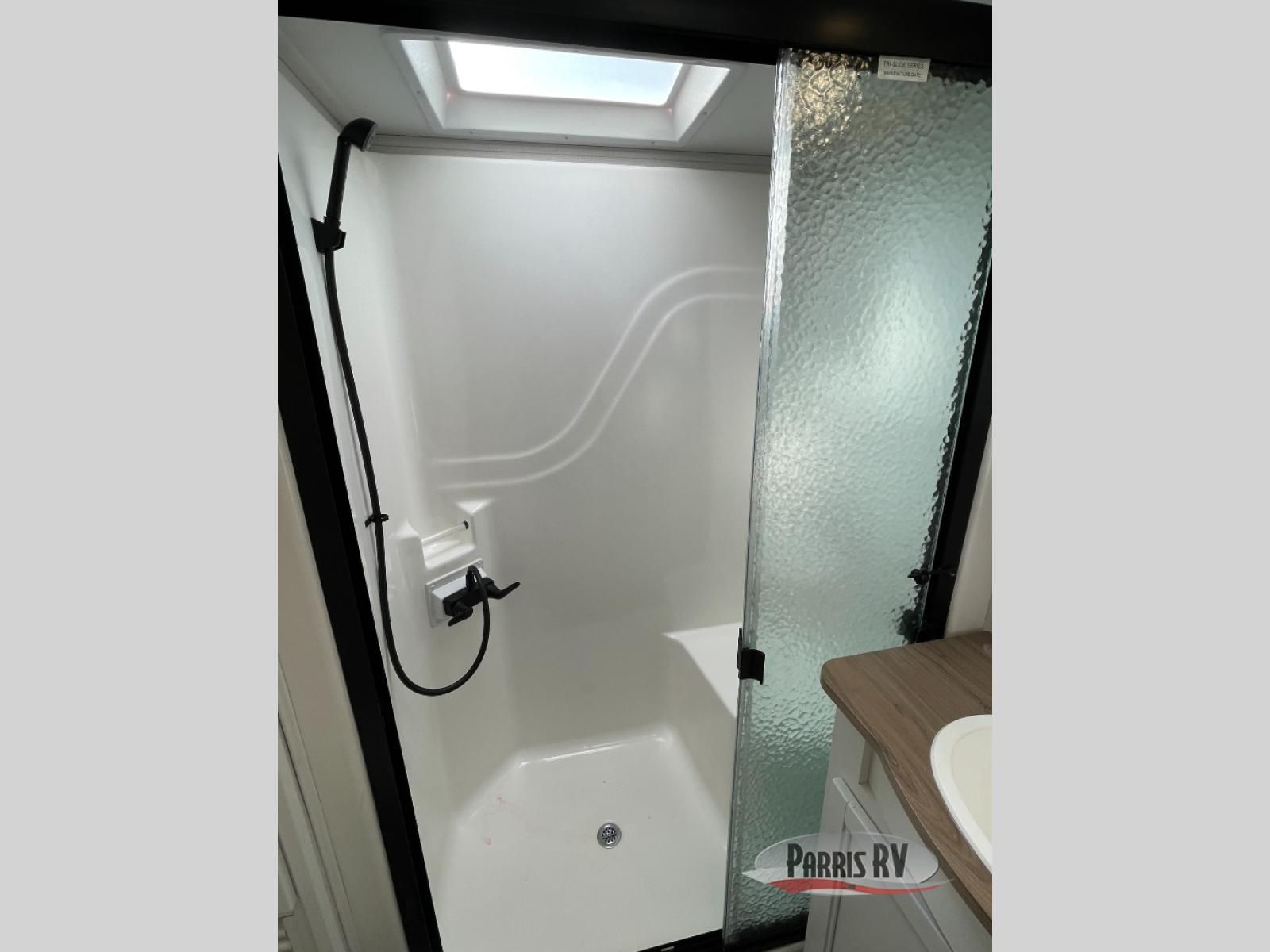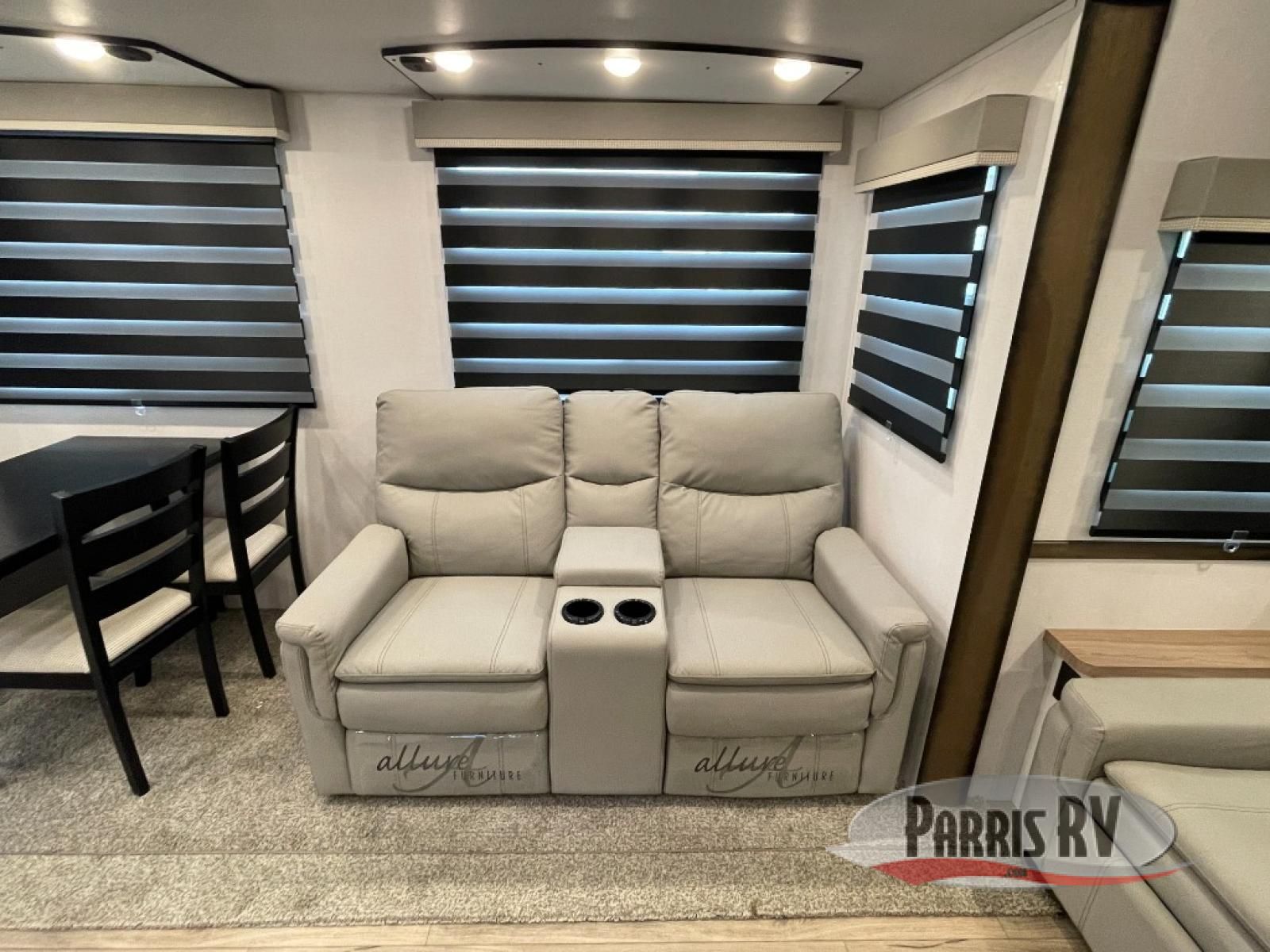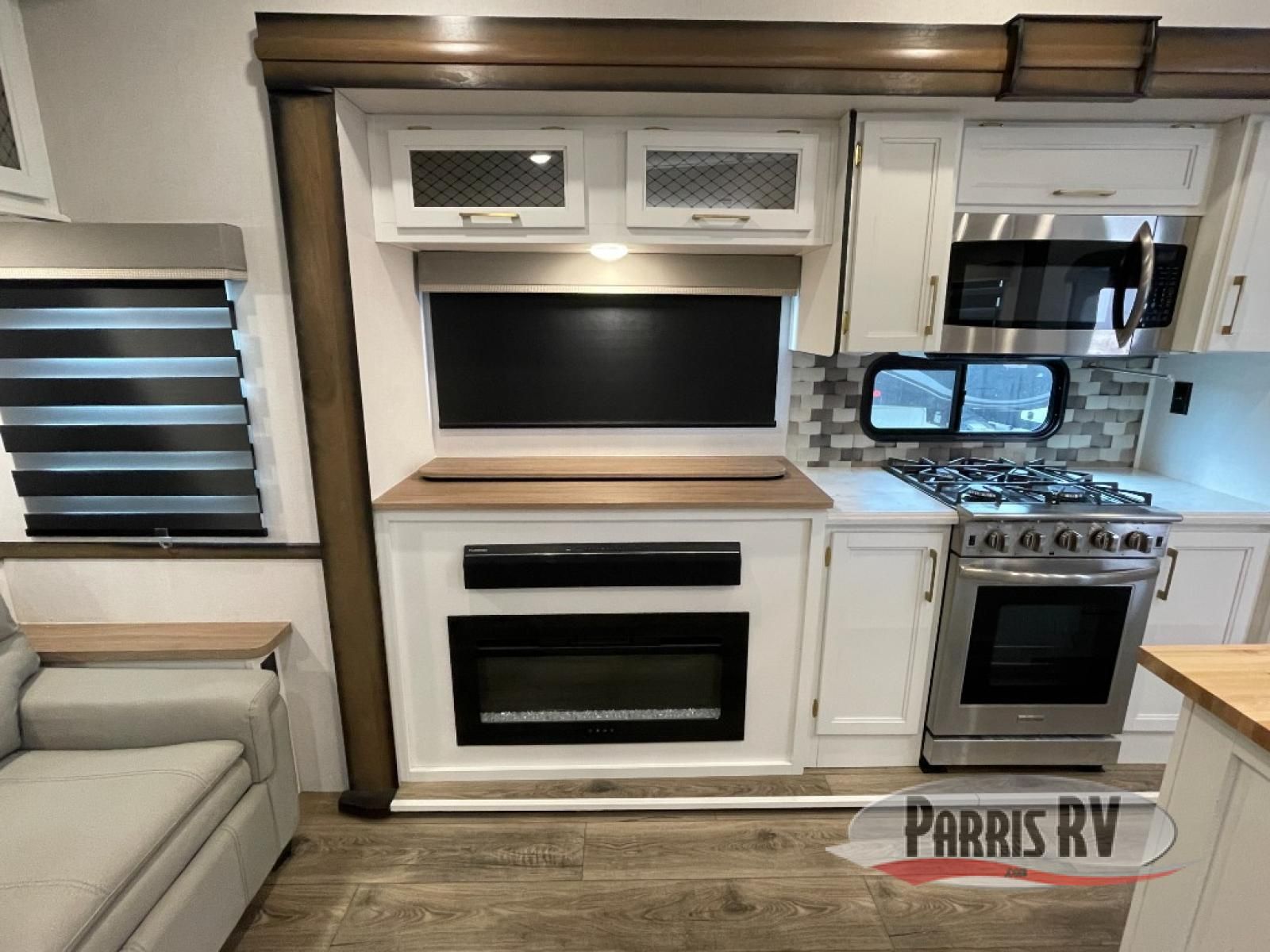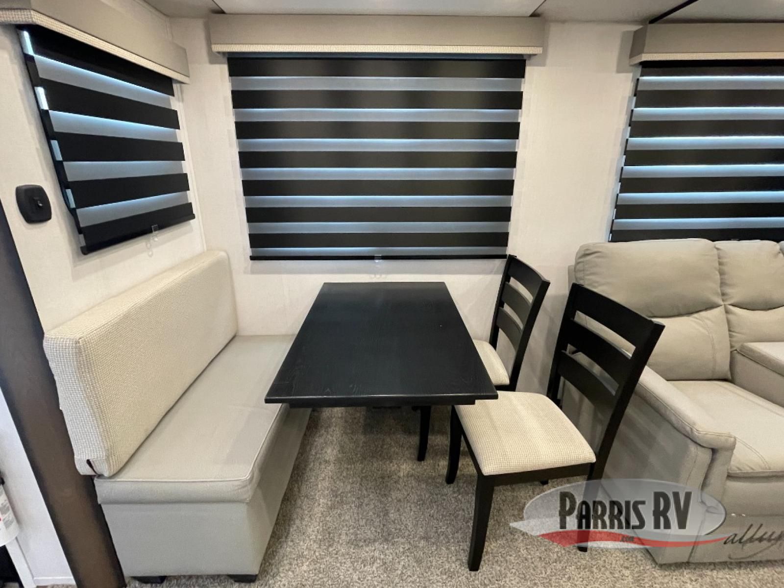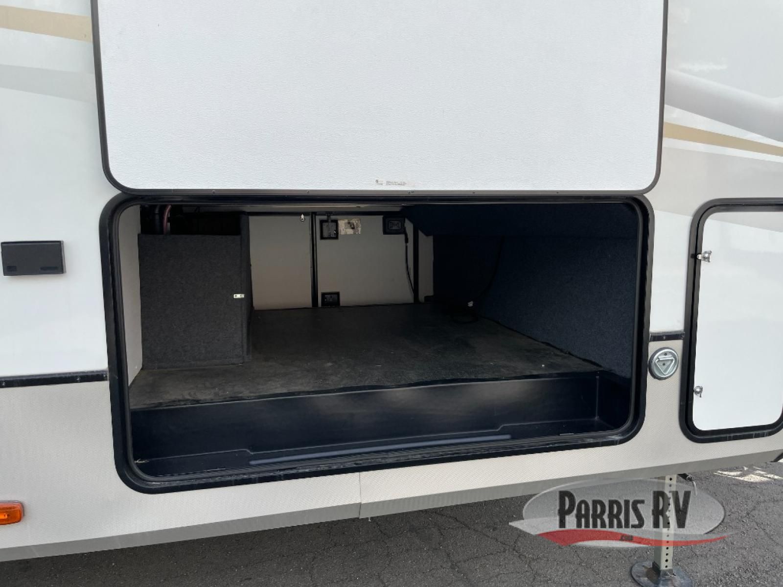 From the front private bedroom with a king bed slide out to the rear living area with theater seating and a fireplace, you'll love every minute spent in this fifth wheel. The dual opposing slides in the main living area provide tons of space to stretch out, and the kitchen island here will tie the whole room together. Your crew can spend the evenings watching a movie on the large LED TV, or head outdoors to relax under the 15' electric awning with LED lights. The full bath features a shower with a seat and glass doors, plus a Deluxe Skyview skylight for added natural lighting. You won't have to worry about sacrificing storage space thanks to the bedroom walk-in closet with mirrored doors, the kitchen walk-in pantry, plus the exterior pass-through storage!