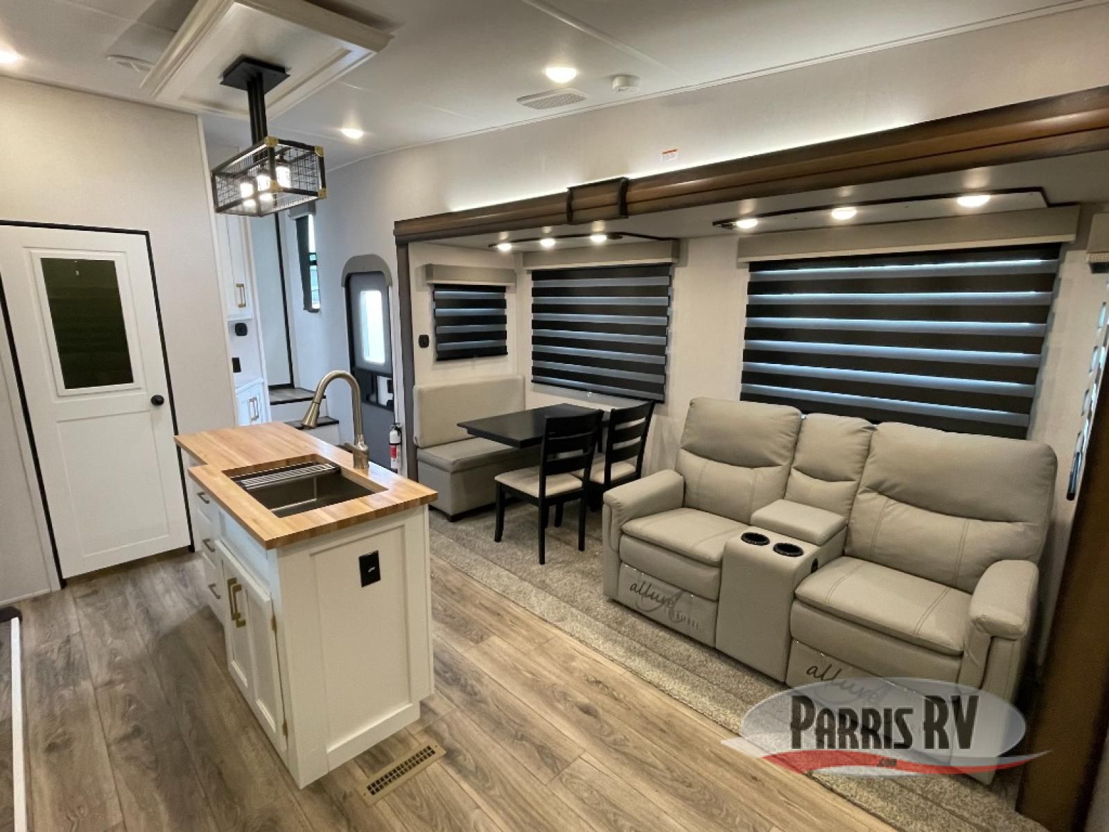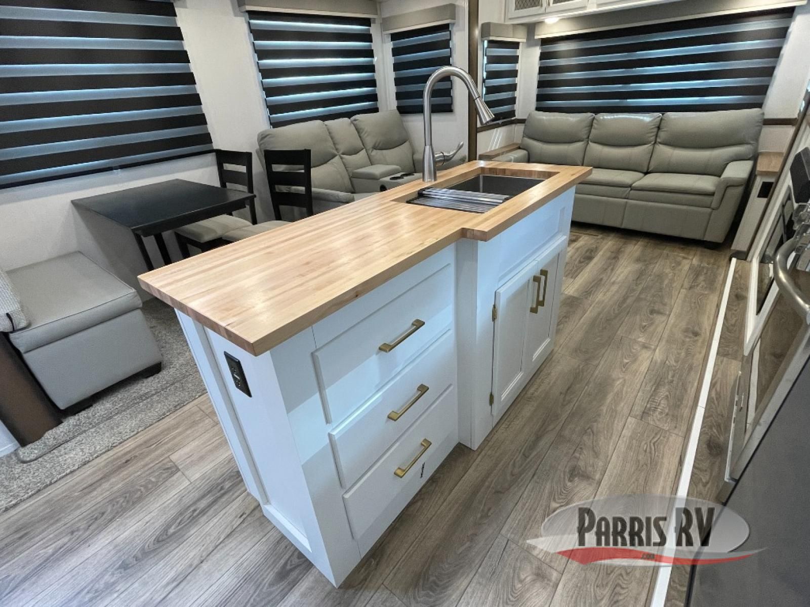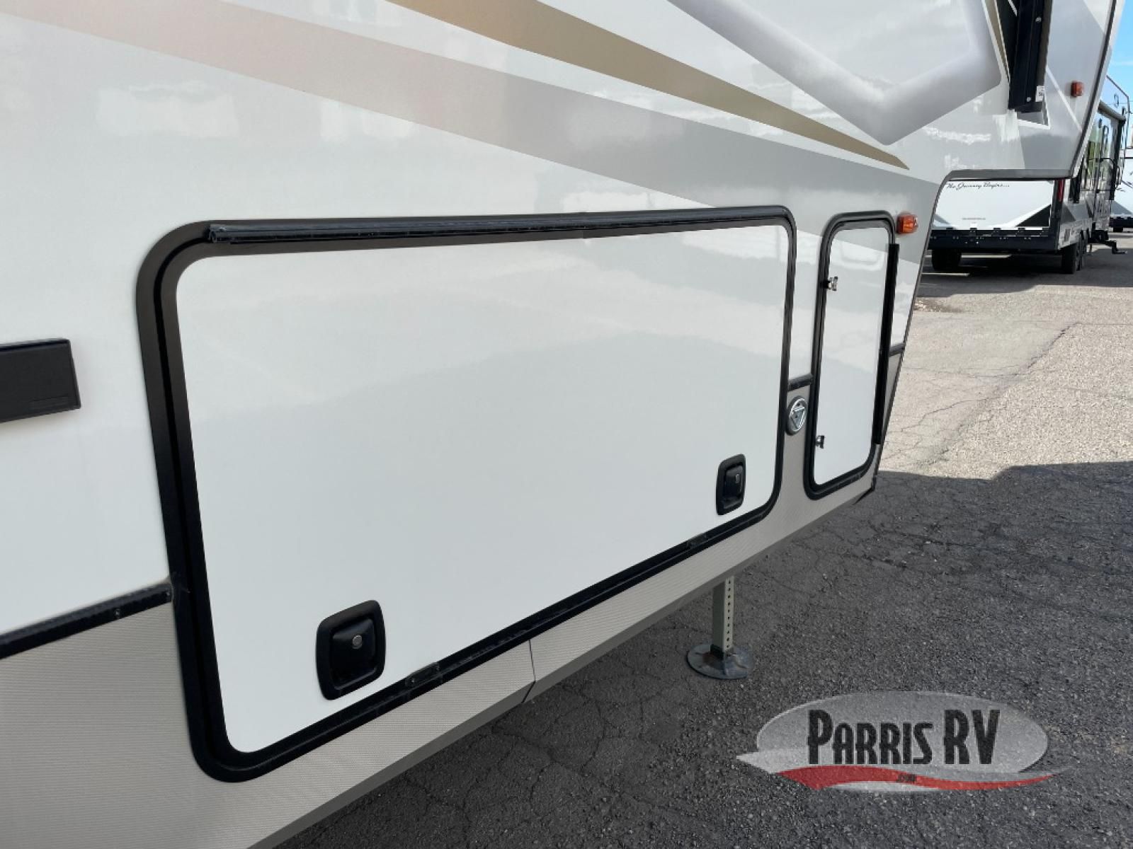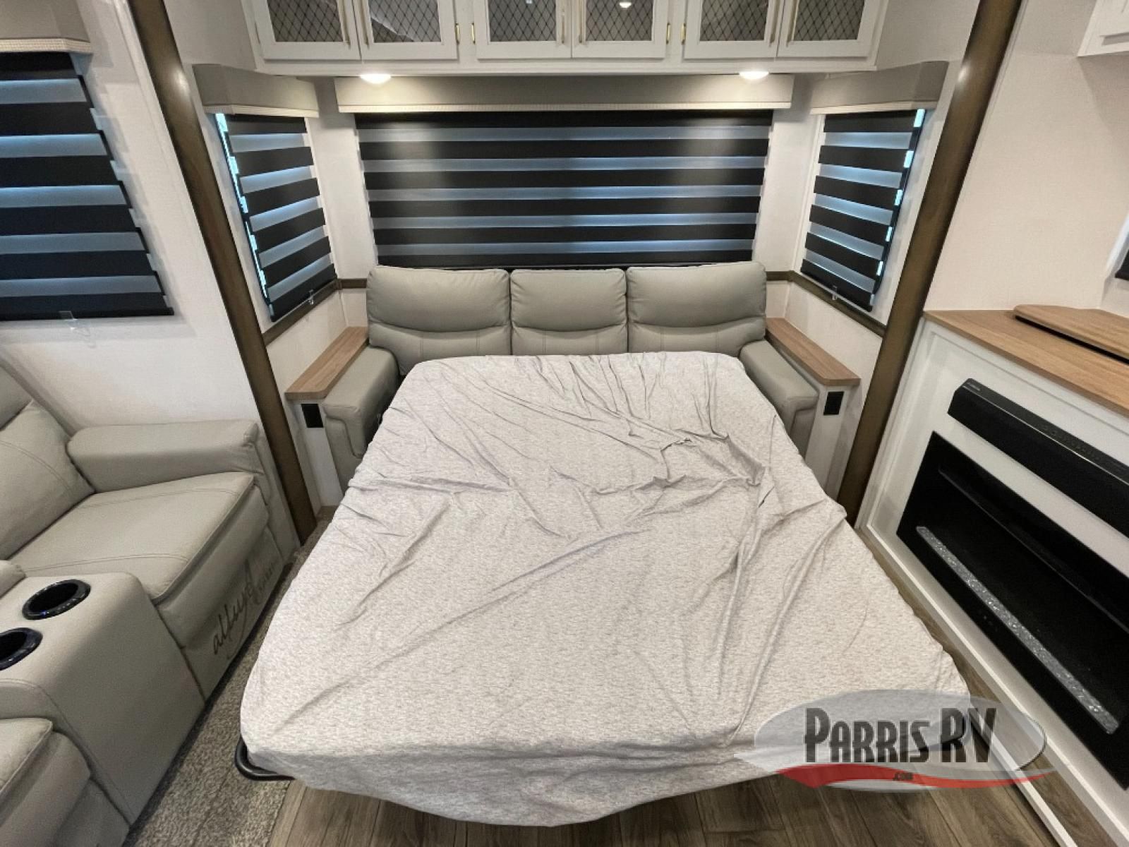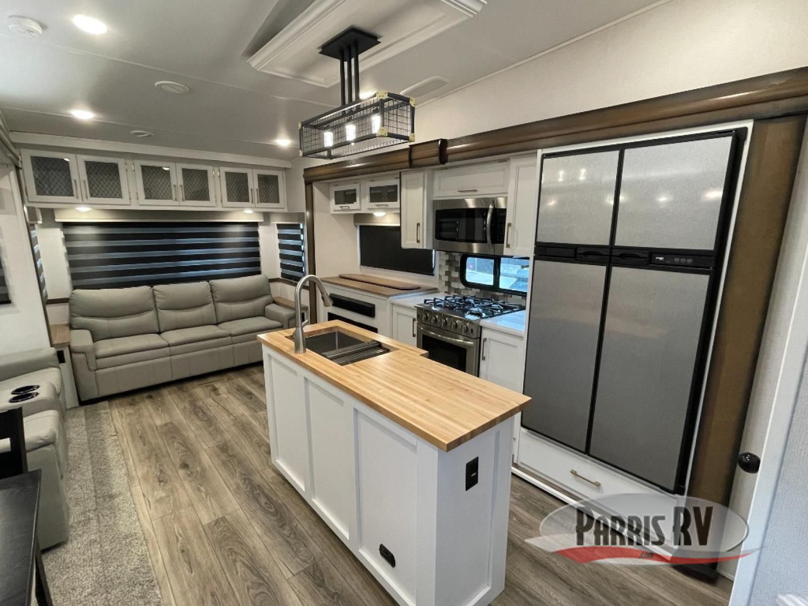 From the front private bedroom with a king bed slide out to the rear living area with theater seating and a fireplace, you'll love every minute spent in this fifth wheel. The dual opposing slides in the main living area provide tons of space to stretch out, and the kitchen island here will tie the whole room together. Your crew can spend the evenings watching a movie on the large LED TV, or head outdoors to relax under the 15' electric awning with LED lights. The full bath features a shower with a seat and glass doors, plus a Deluxe Skyview skylight for added natural lighting. You won't have to worry about sacrificing storage space thanks to the bedroom walk-in closet with mirrored doors, the kitchen walk-in pantry, plus the exterior pass-through storage!