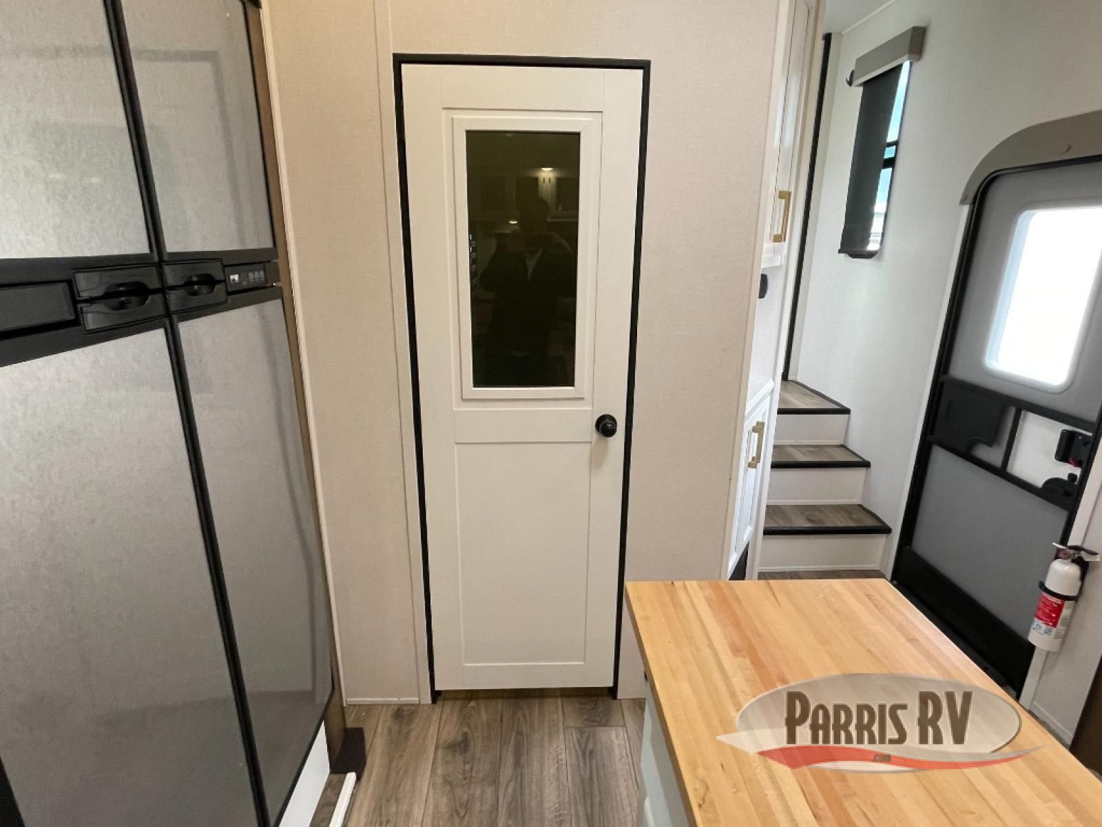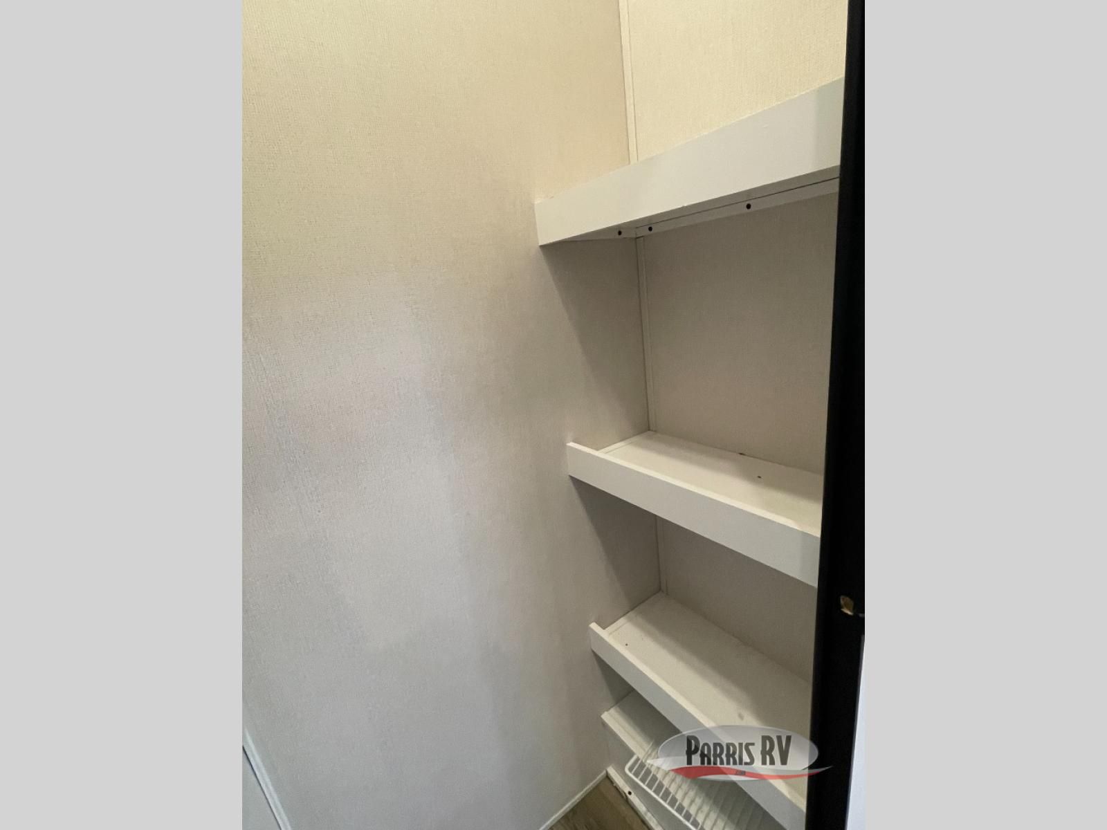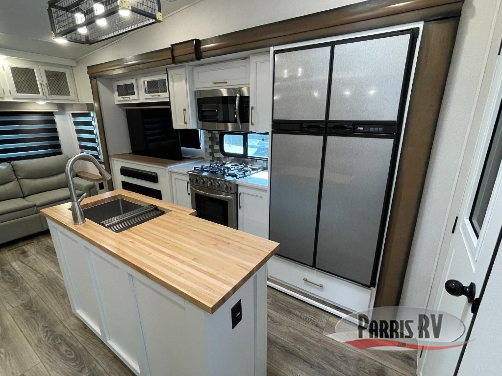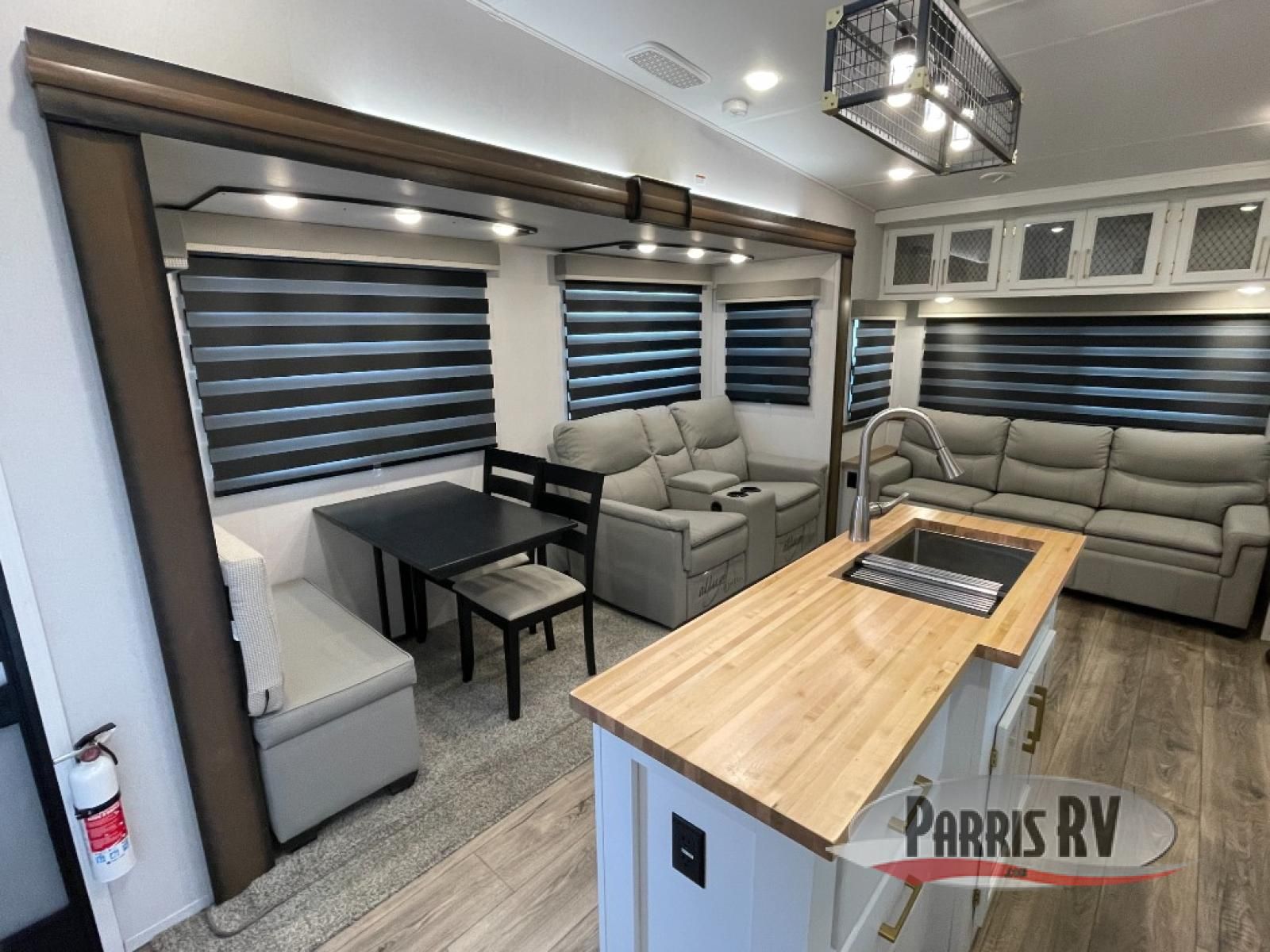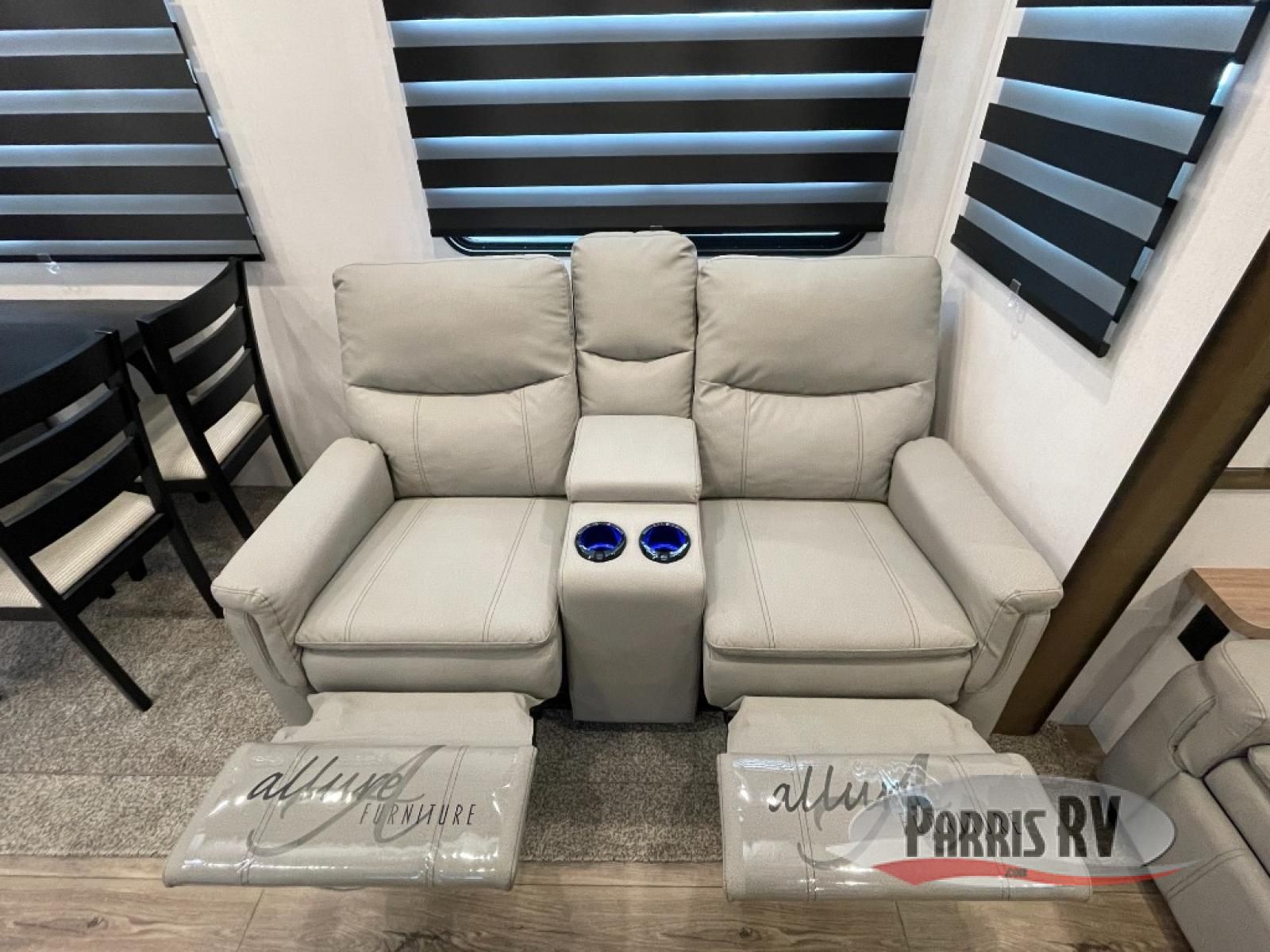 From the front private bedroom with a king bed slide out to the rear living area with theater seating and a fireplace, you'll love every minute spent in this fifth wheel. The dual opposing slides in the main living area provide tons of space to stretch out, and the kitchen island here will tie the whole room together. Your crew can spend the evenings watching a movie on the large LED TV, or head outdoors to relax under the 15' electric awning with LED lights. The full bath features a shower with a seat and glass doors, plus a Deluxe Skyview skylight for added natural lighting. You won't have to worry about sacrificing storage space thanks to the bedroom walk-in closet with mirrored doors, the kitchen walk-in pantry, plus the exterior pass-through storage!