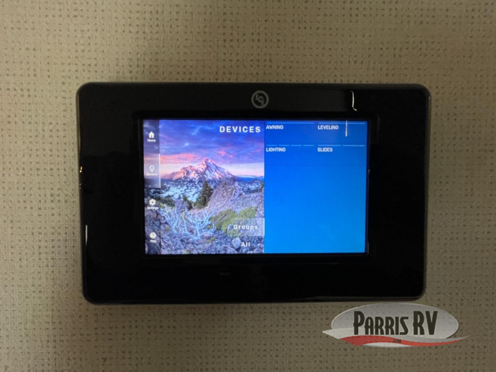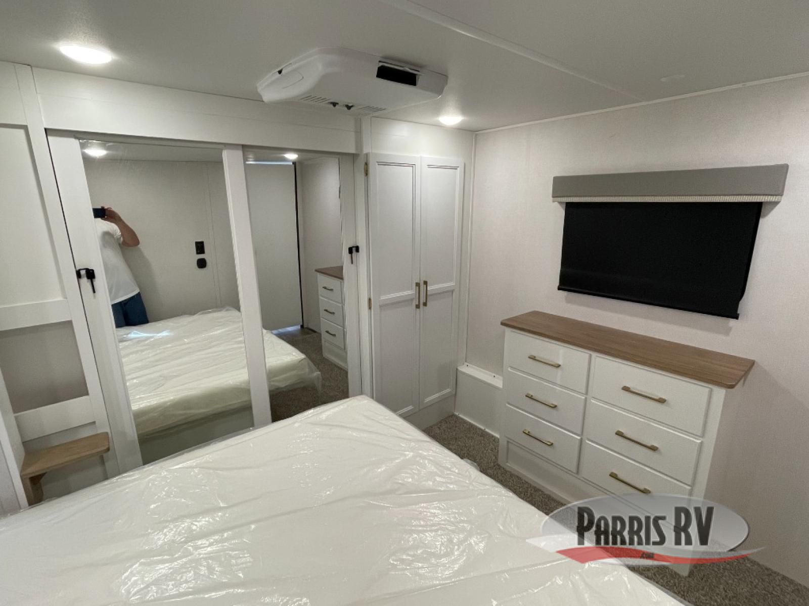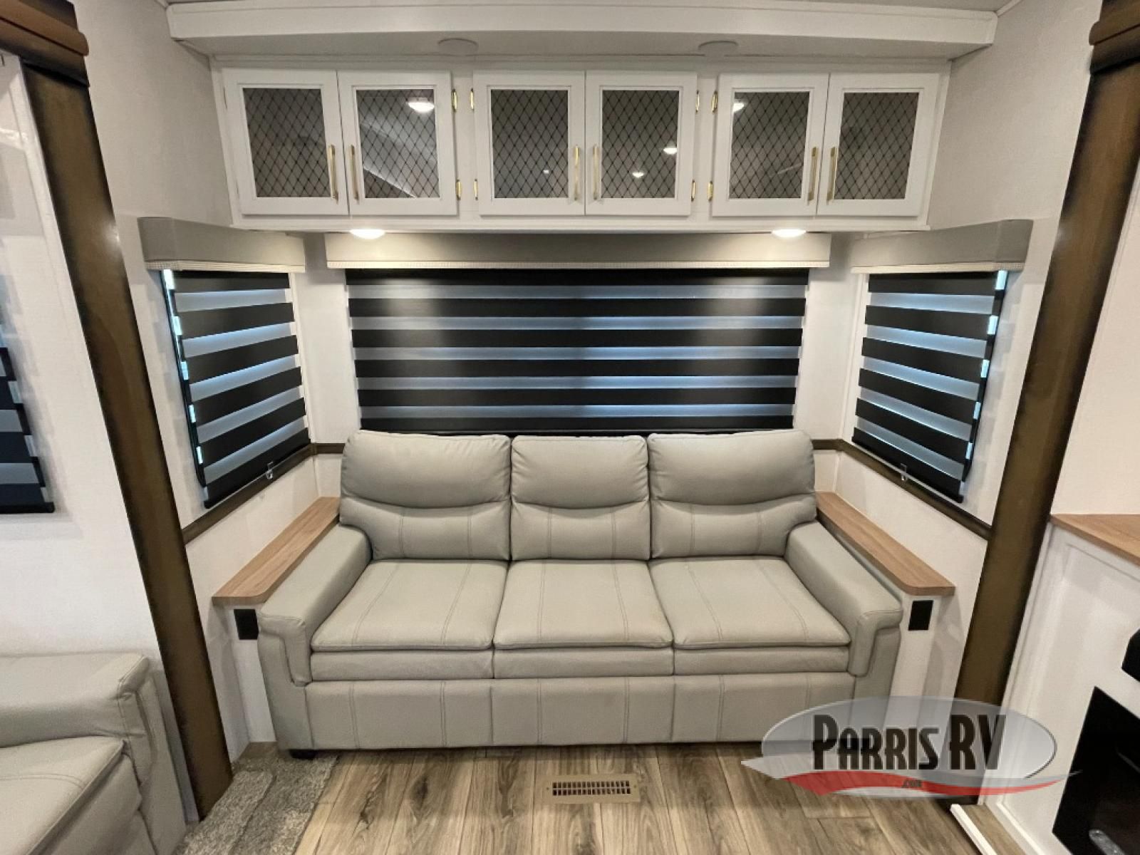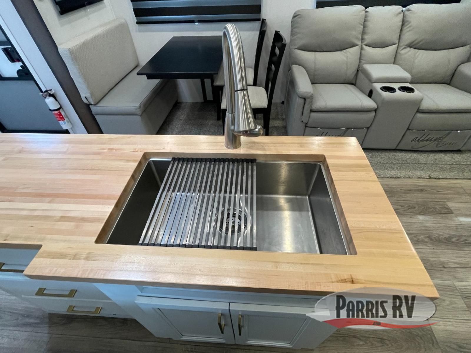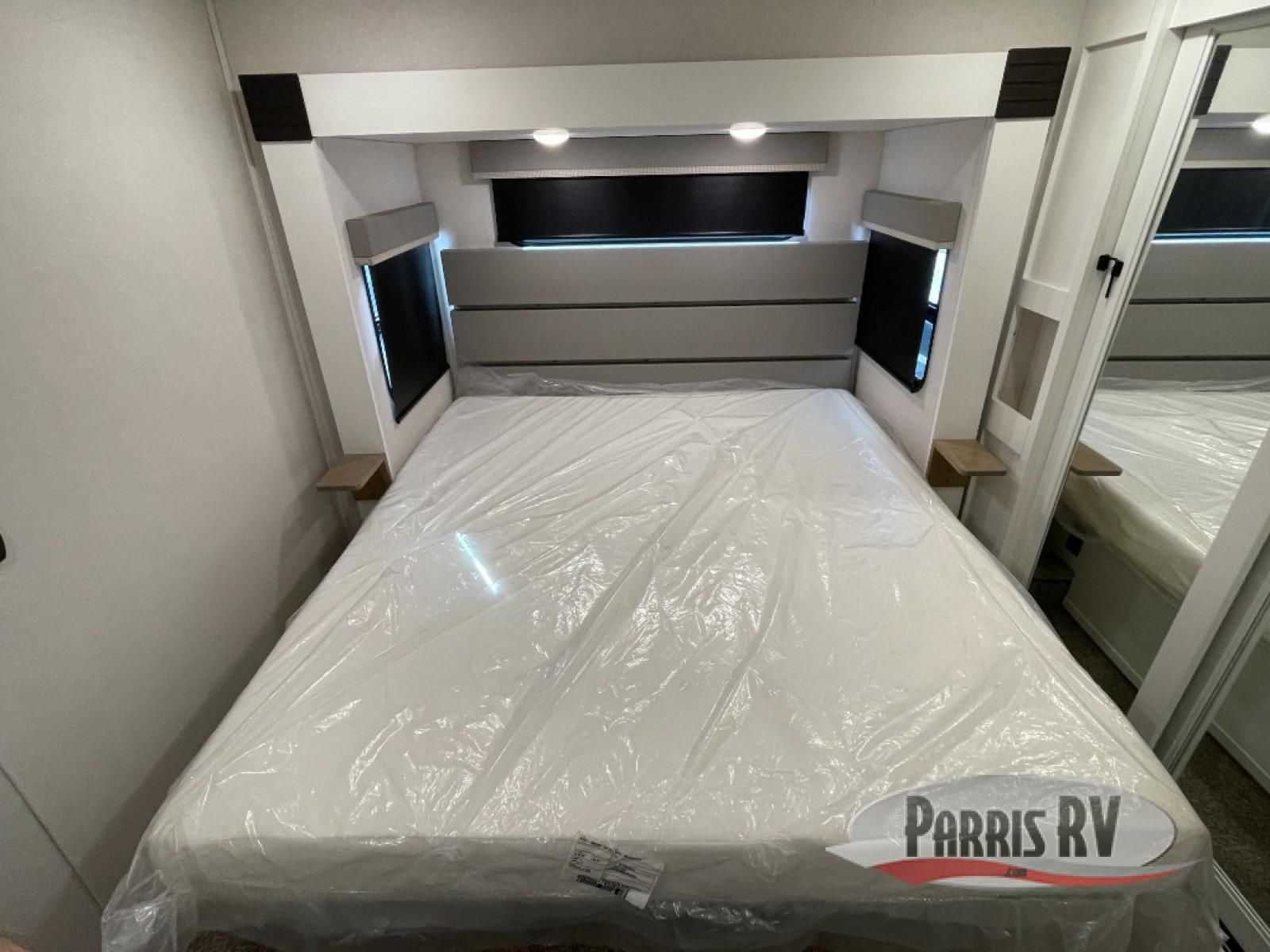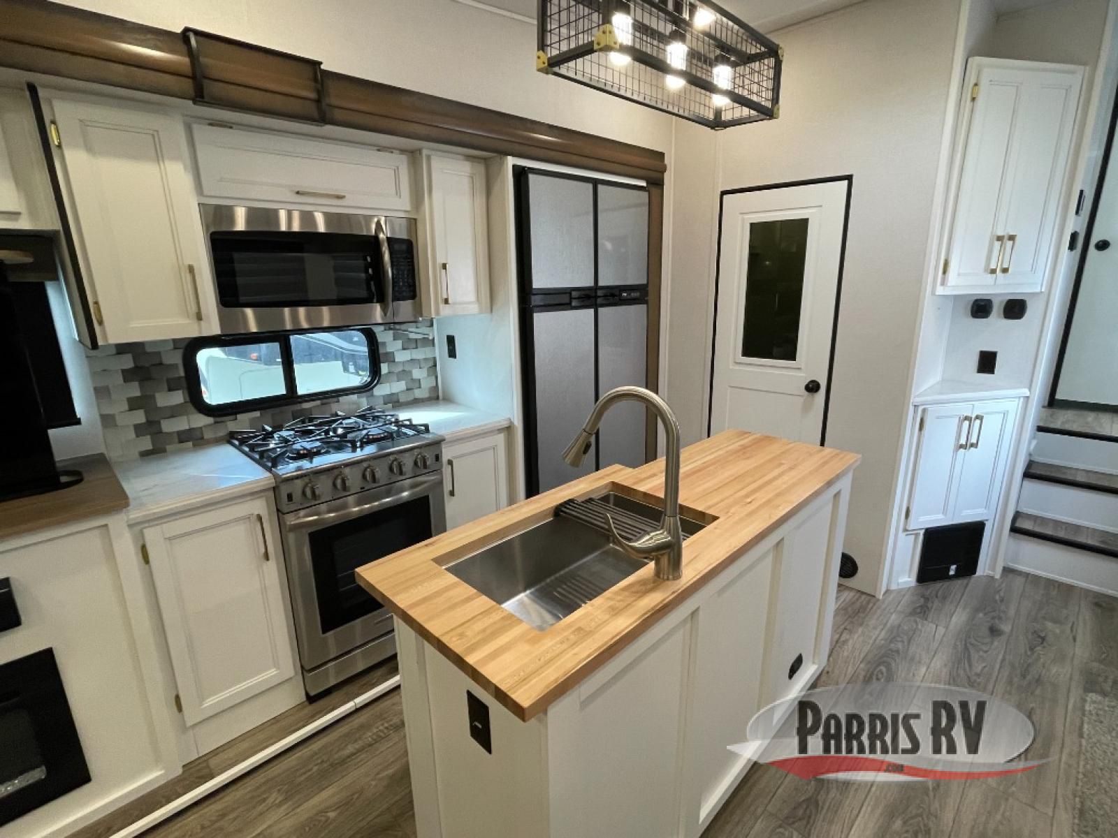 From the front private bedroom with a king bed slide out to the rear living area with theater seating and a fireplace, you'll love every minute spent in this fifth wheel. The dual opposing slides in the main living area provide tons of space to stretch out, and the kitchen island here will tie the whole room together. Your crew can spend the evenings watching a movie on the large LED TV, or head outdoors to relax under the 15' electric awning with LED lights. The full bath features a shower with a seat and glass doors, plus a Deluxe Skyview skylight for added natural lighting. You won't have to worry about sacrificing storage space thanks to the bedroom walk-in closet with mirrored doors, the kitchen walk-in pantry, plus the exterior pass-through storage!