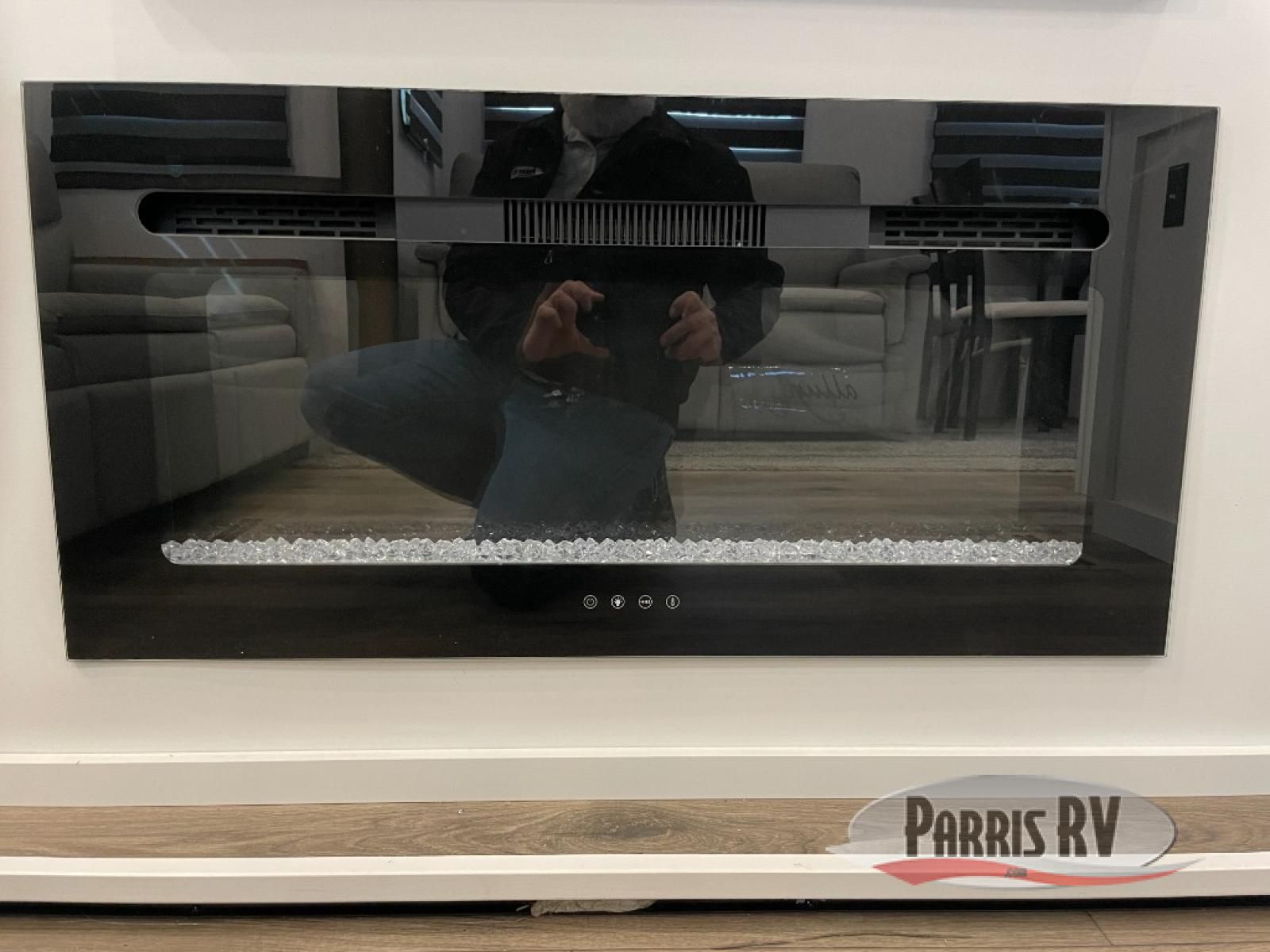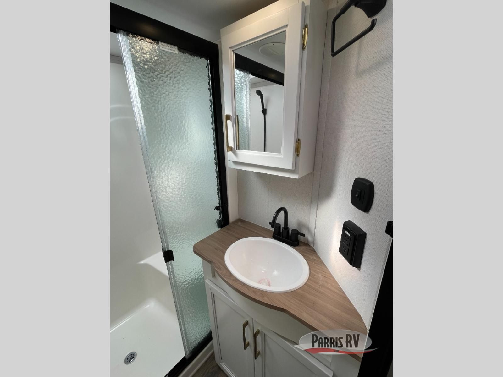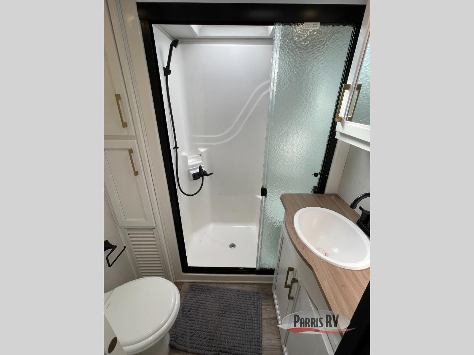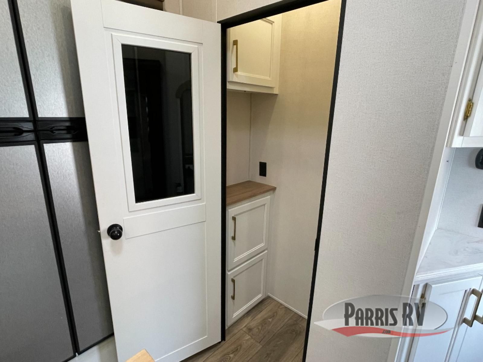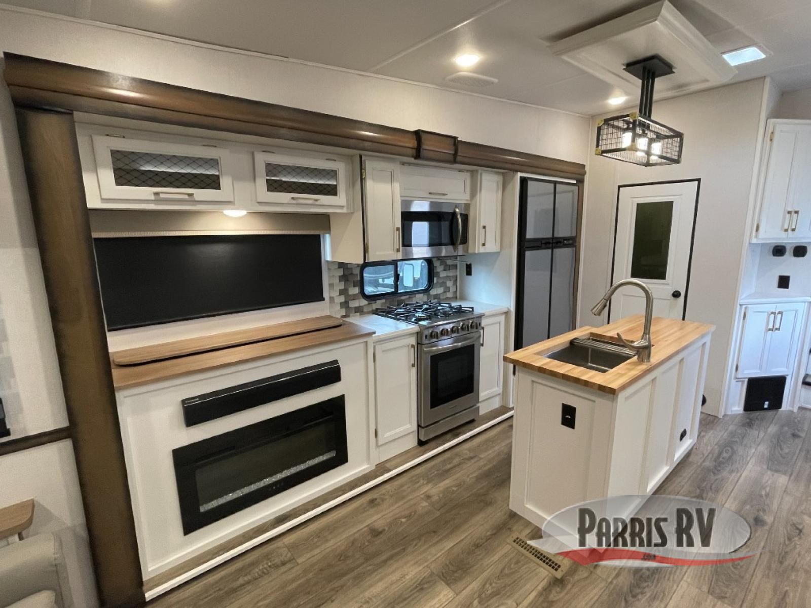 From the front private bedroom with a king bed slide out to the rear living area with theater seating and a fireplace, you'll love every minute spent in this fifth wheel. The dual opposing slides in the main living area provide tons of space to stretch out, and the kitchen island here will tie the whole room together. Your crew can spend the evenings watching a movie on the large LED TV, or head outdoors to relax under the 15' electric awning with LED lights. The full bath features a shower with a seat and glass doors, plus a Deluxe Skyview skylight for added natural lighting. You won't have to worry about sacrificing storage space thanks to the bedroom walk-in closet with mirrored doors, the kitchen walk-in pantry, plus the exterior pass-through storage!