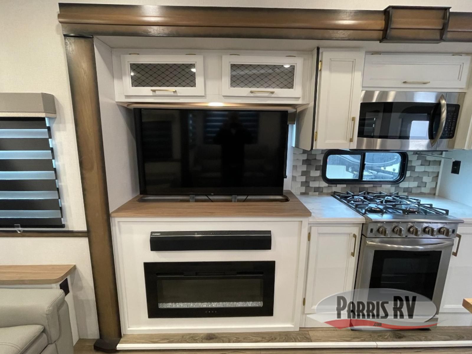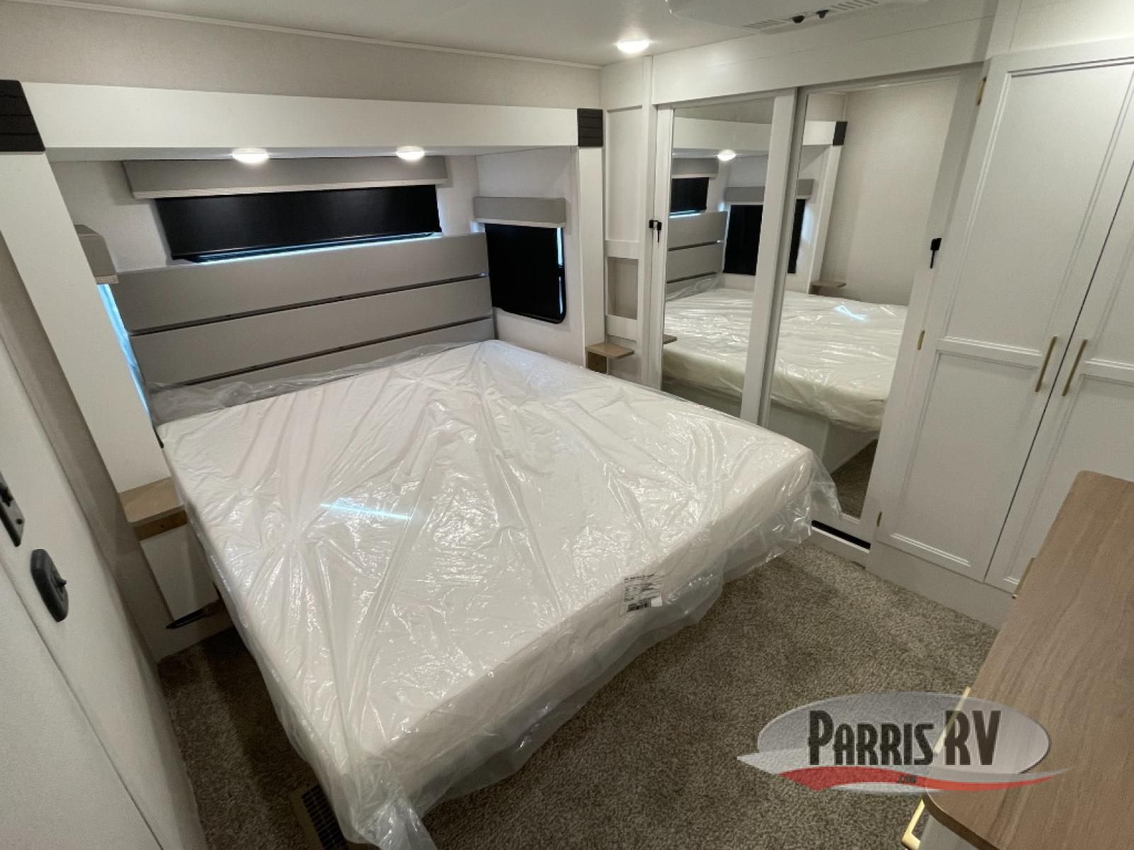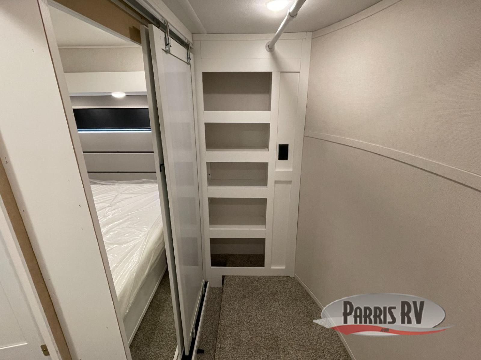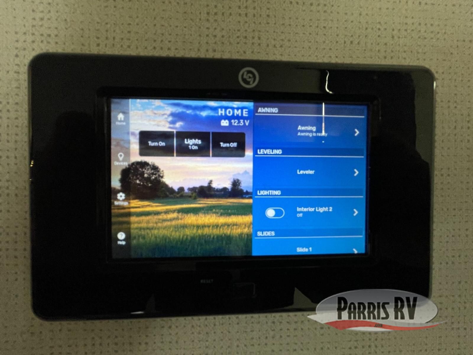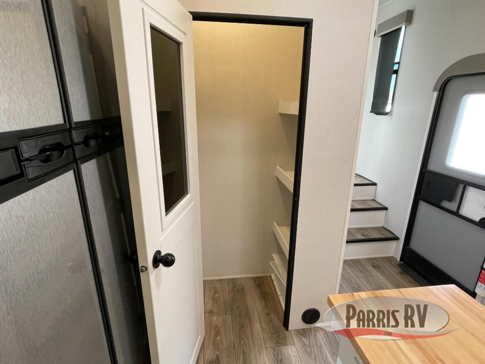 From the front private bedroom with a king bed slide out to the rear living area with theater seating and a fireplace, you'll love every minute spent in this fifth wheel. The dual opposing slides in the main living area provide tons of space to stretch out, and the kitchen island here will tie the whole room together. Your crew can spend the evenings watching a movie on the large LED TV, or head outdoors to relax under the 15' electric awning with LED lights. The full bath features a shower with a seat and glass doors, plus a Deluxe Skyview skylight for added natural lighting. You won't have to worry about sacrificing storage space thanks to the bedroom walk-in closet with mirrored doors, the kitchen walk-in pantry, plus the exterior pass-through storage!