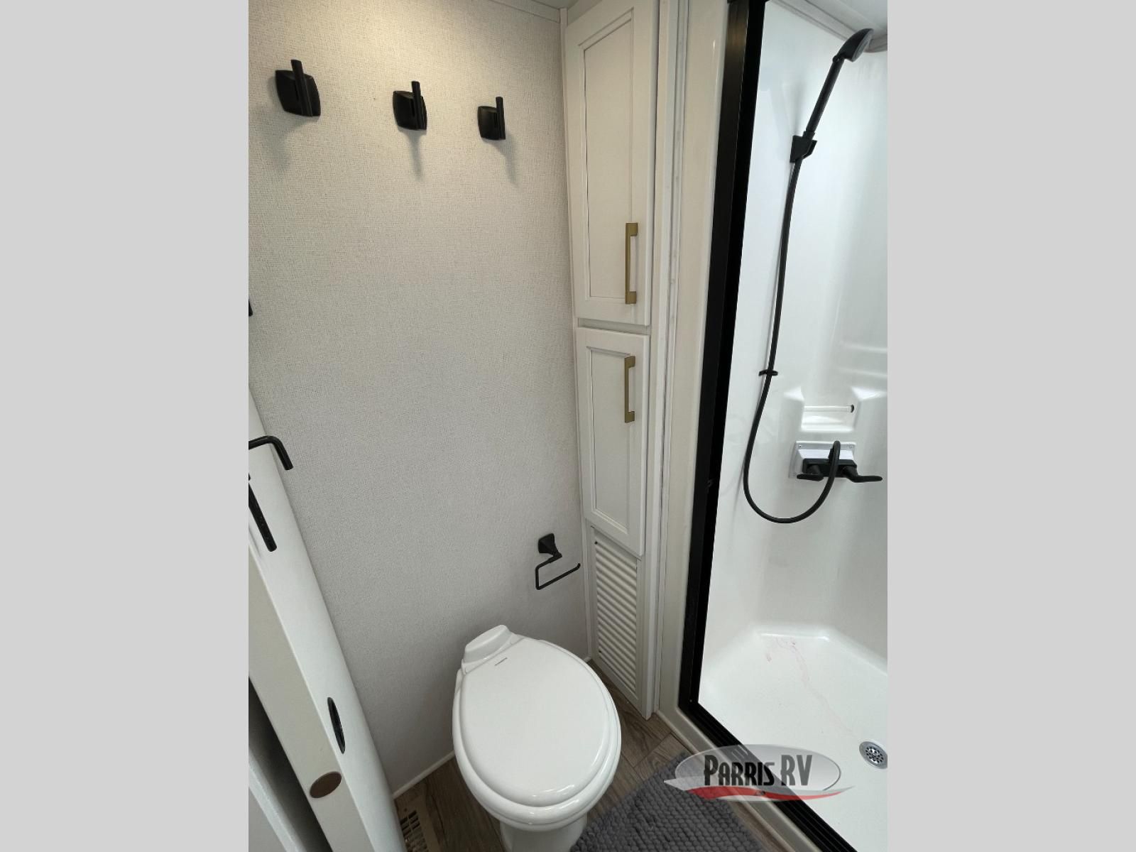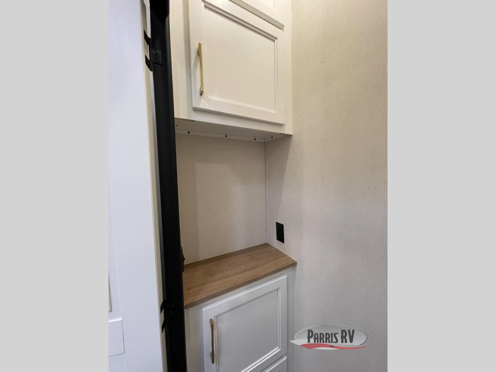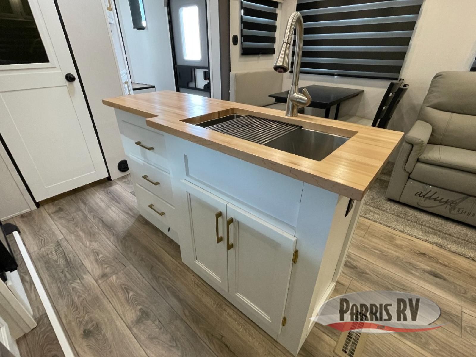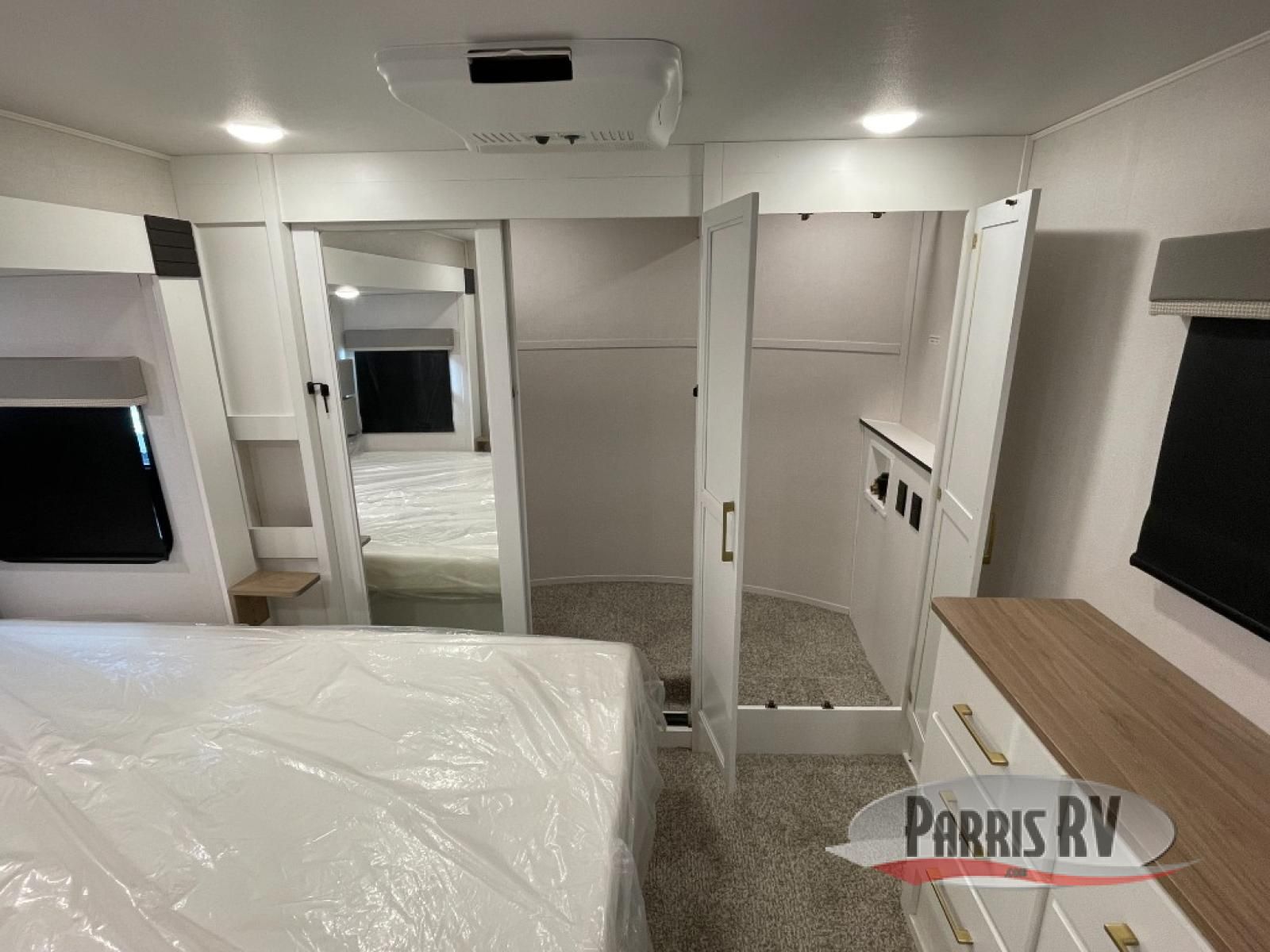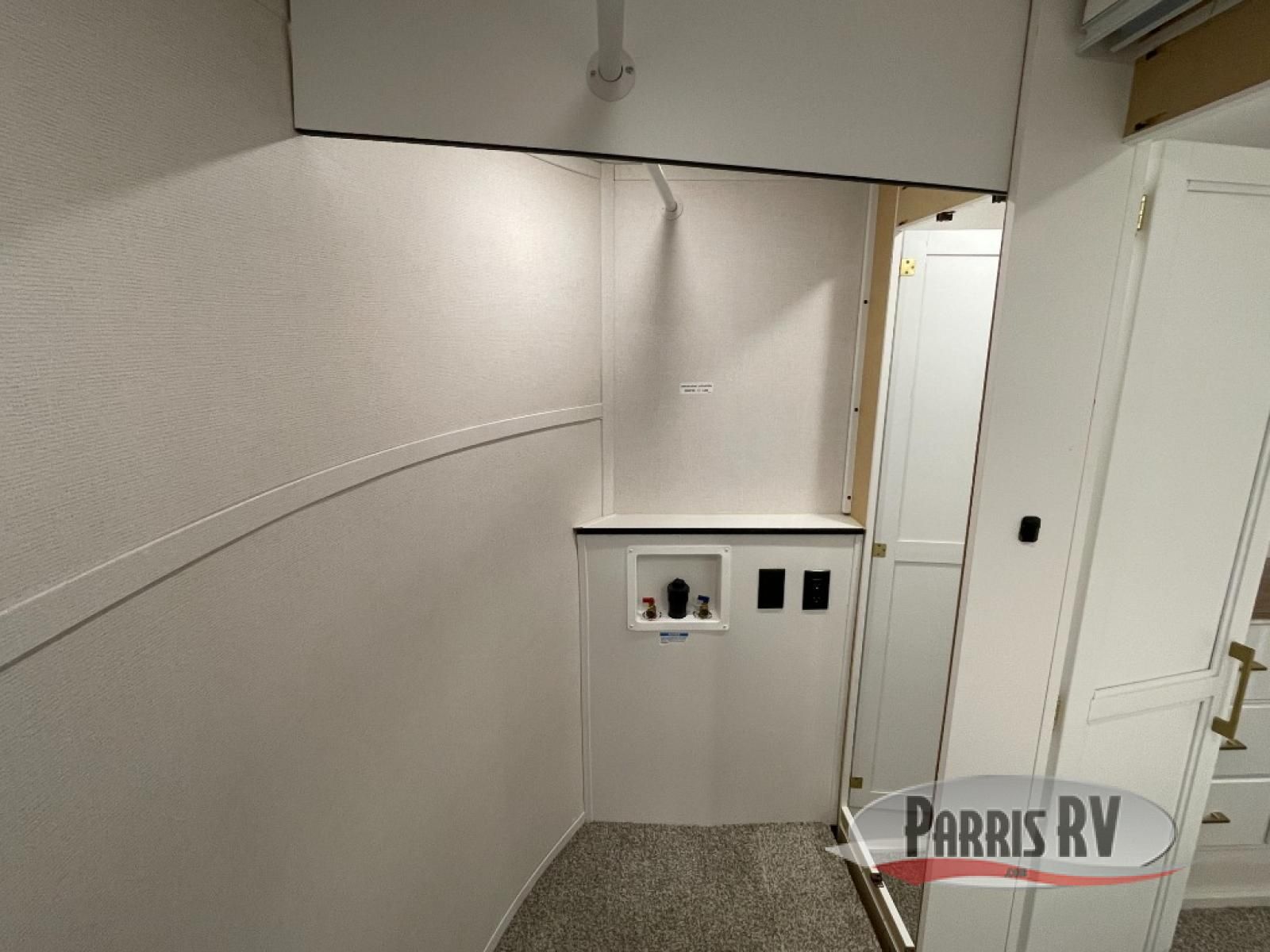 From the front private bedroom with a king bed slide out to the rear living area with theater seating and a fireplace, you'll love every minute spent in this fifth wheel. The dual opposing slides in the main living area provide tons of space to stretch out, and the kitchen island here will tie the whole room together. Your crew can spend the evenings watching a movie on the large LED TV, or head outdoors to relax under the 15' electric awning with LED lights. The full bath features a shower with a seat and glass doors, plus a Deluxe Skyview skylight for added natural lighting. You won't have to worry about sacrificing storage space thanks to the bedroom walk-in closet with mirrored doors, the kitchen walk-in pantry, plus the exterior pass-through storage!