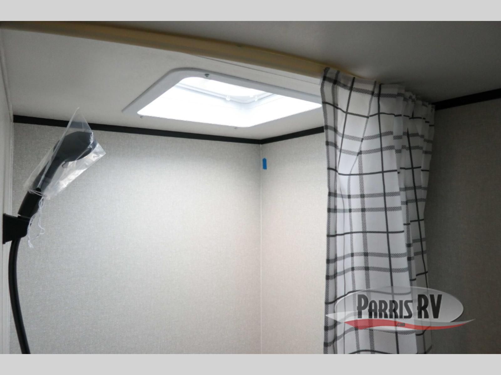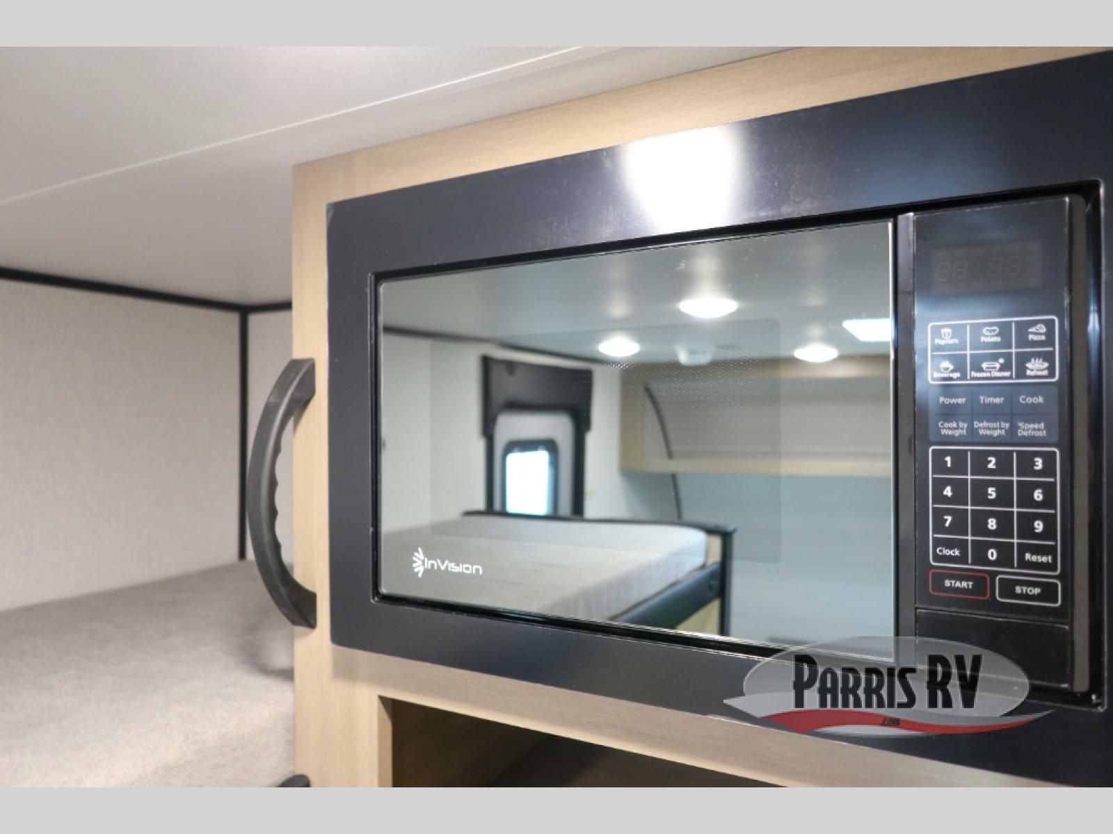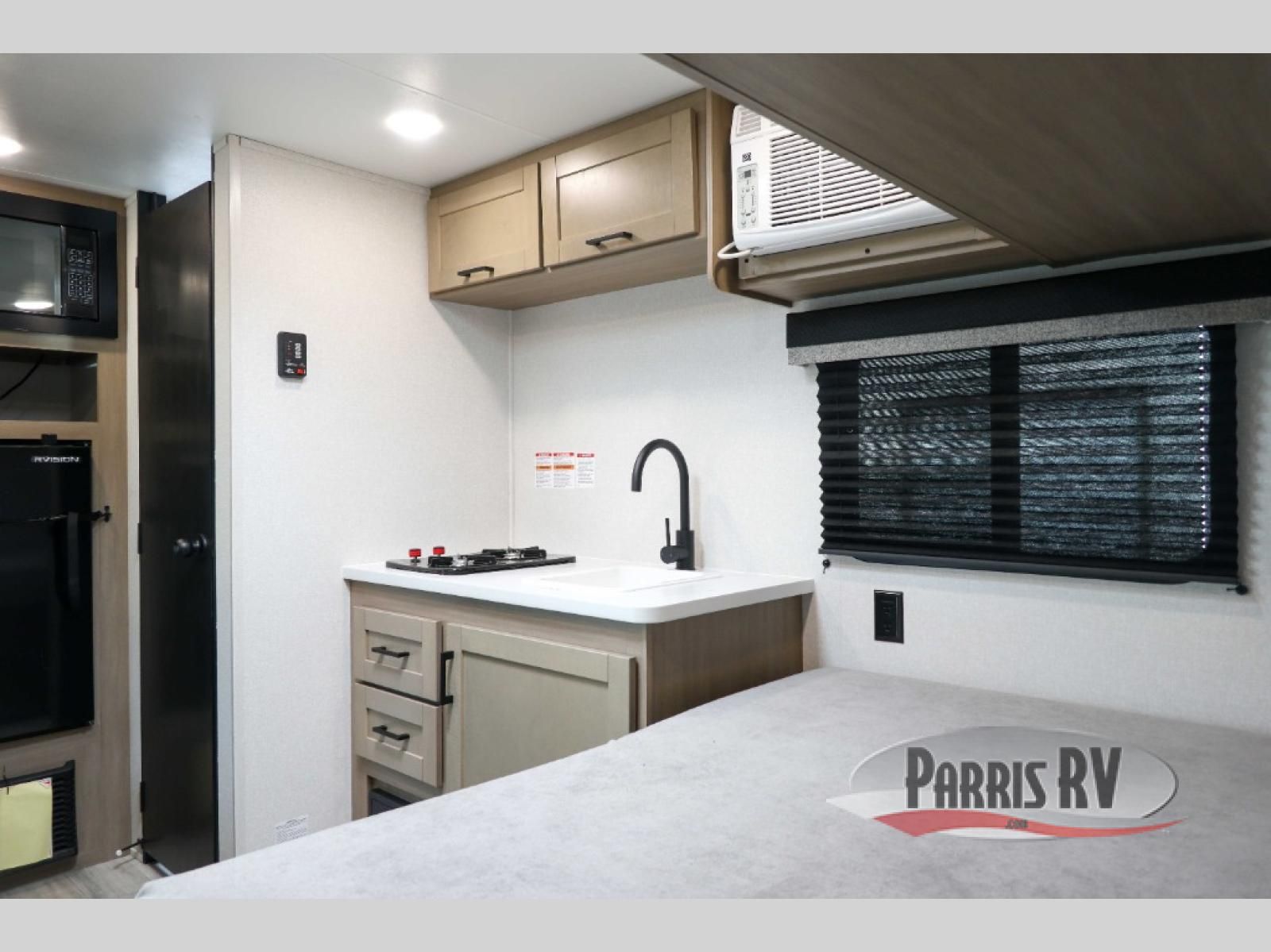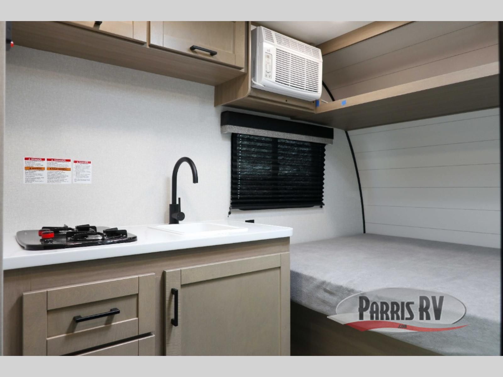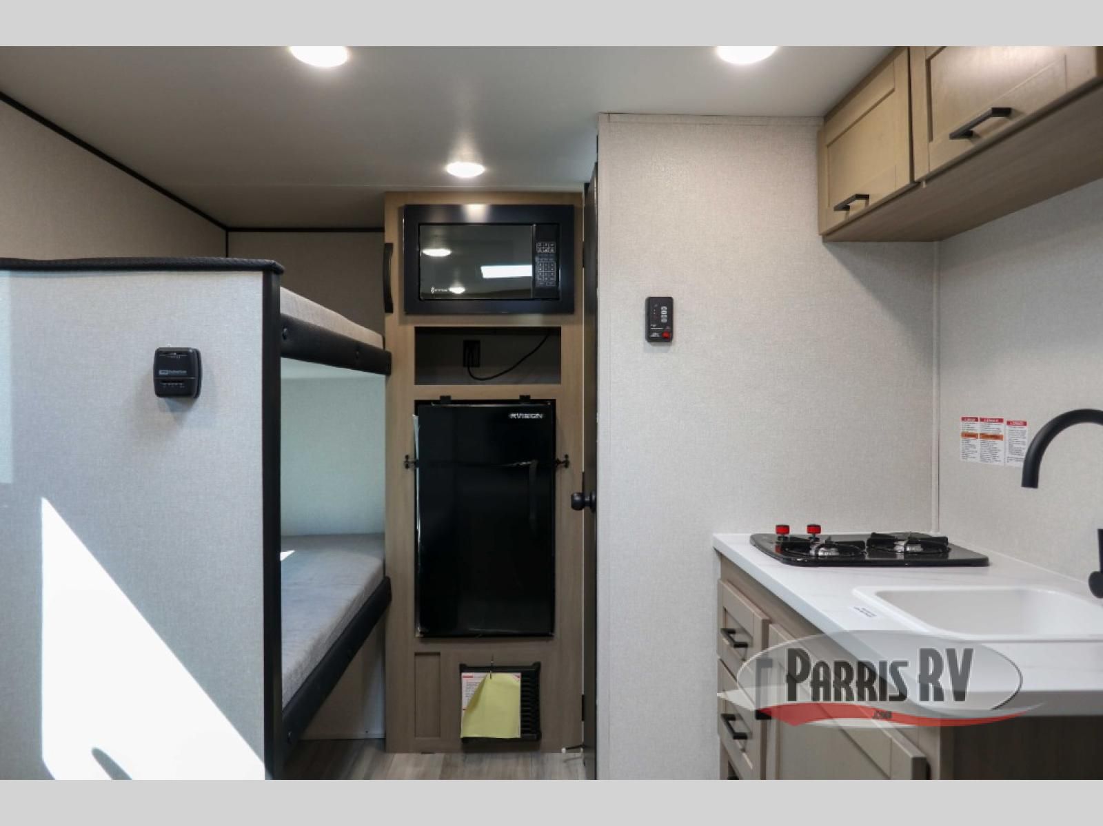 This lightweight travel trailer includes everything you need for comfortable camping trips at the lake. You can make your meals on the two-burner cooktop or in the microwave oven, and a 12V refrigerator will keep leftovers fresh. A front bed provides a great night's rest, and there are 30" x 73" bunk beds for your guests or little ones. And a private bath with a shower and toilet will let you easily freshen up without having to use the camp's facilities!