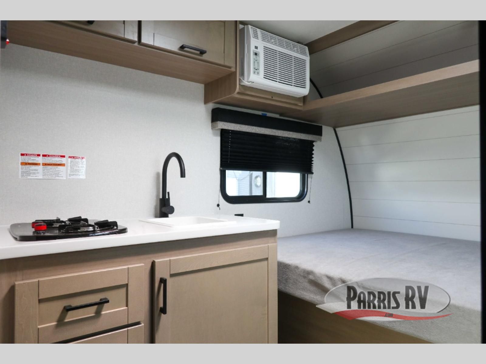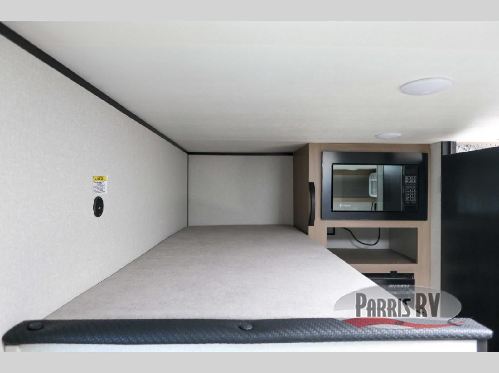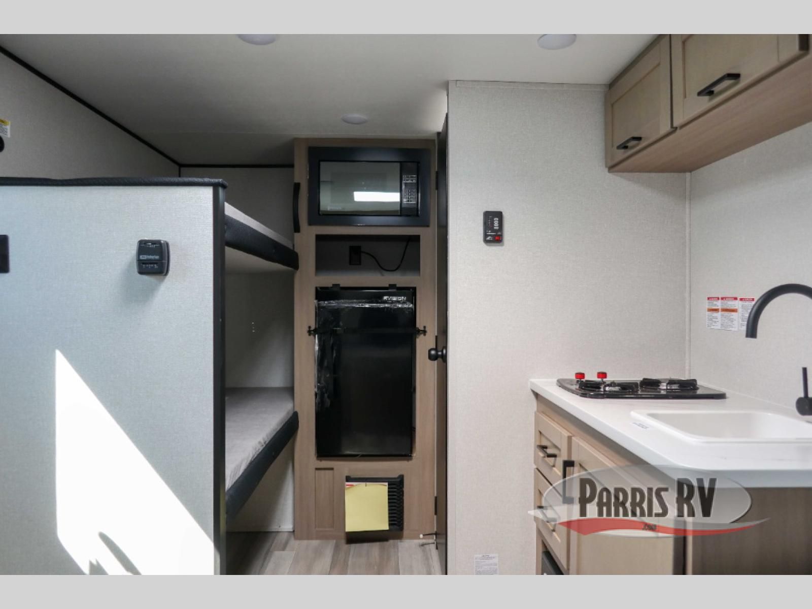 This lightweight travel trailer includes everything you need for comfortable camping trips at the lake. You can make your meals on the two-burner cooktop or in the microwave oven, and a 12V refrigerator will keep leftovers fresh. A front bed provides a great night's rest, and there are 30" x 73" bunk beds for your guests or little ones. And a private bath with a shower and toilet will let you easily freshen up without having to use the camp's facilities!