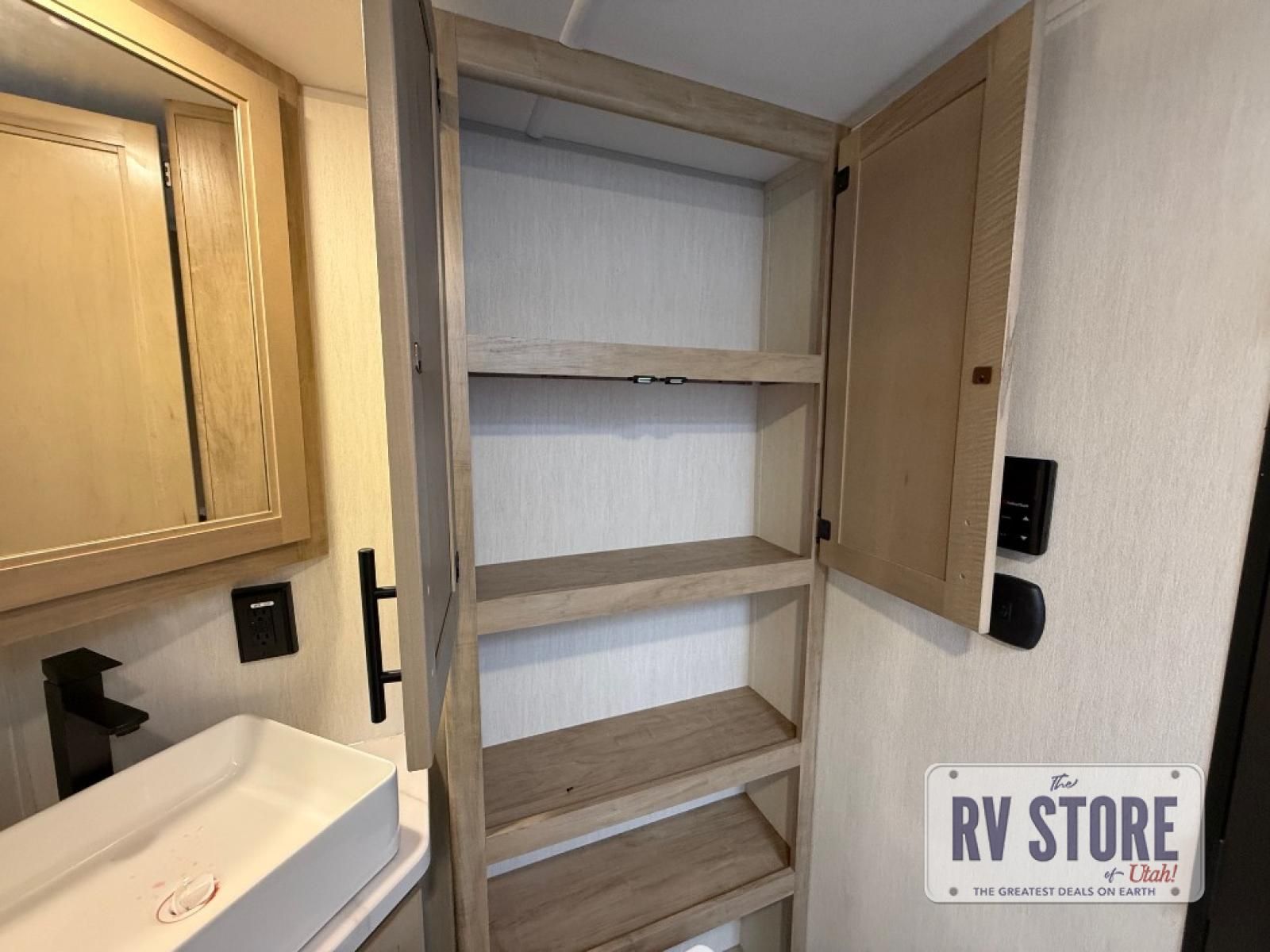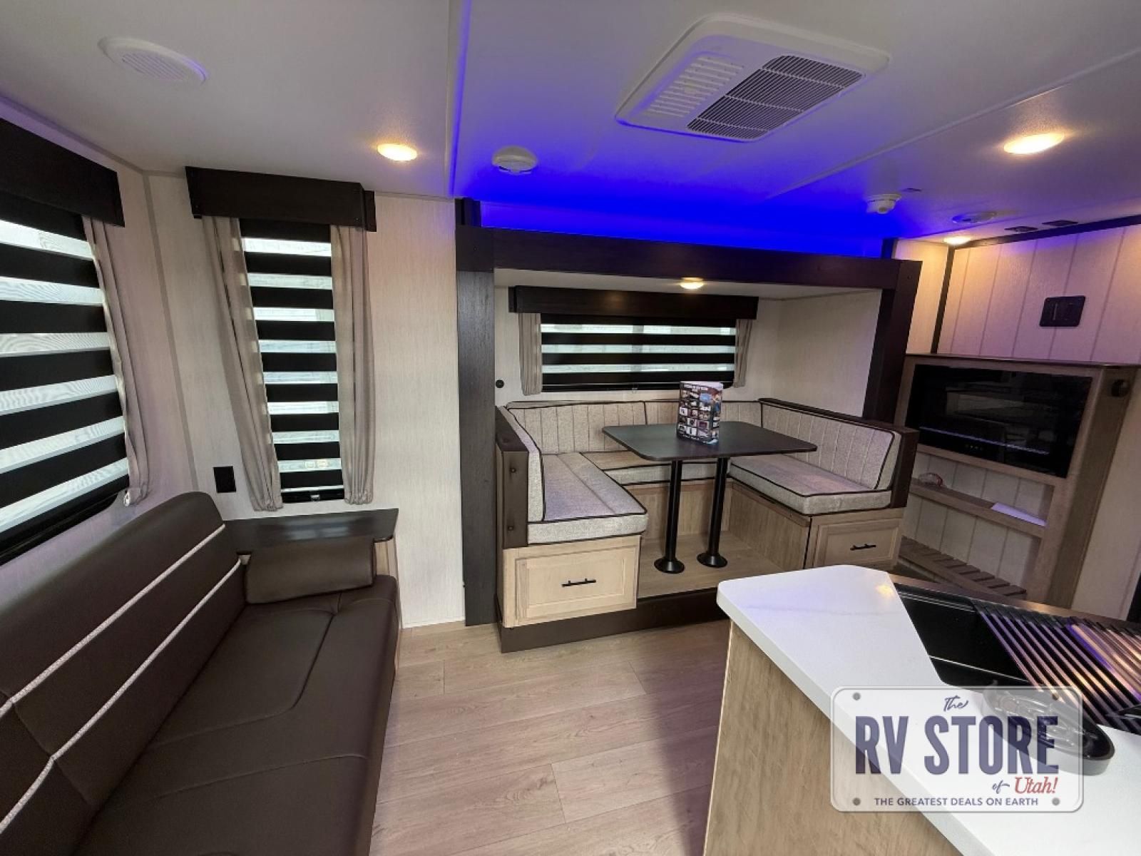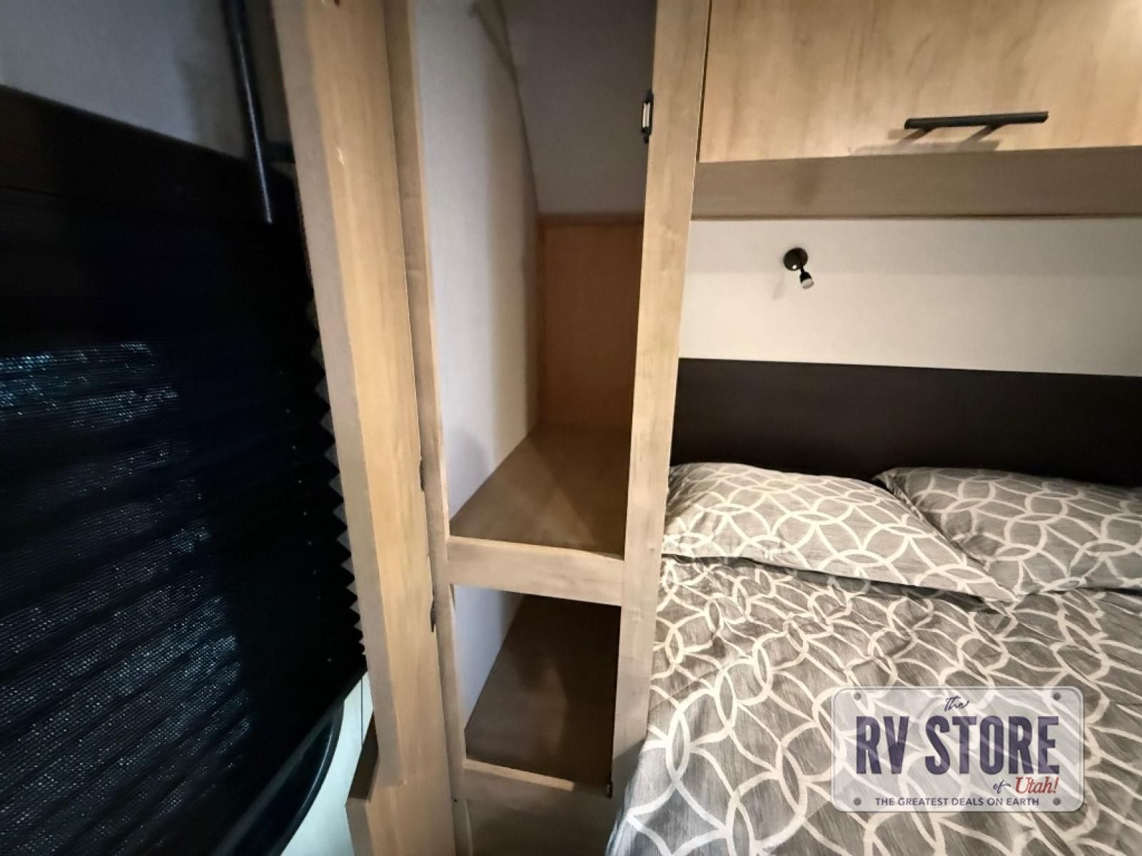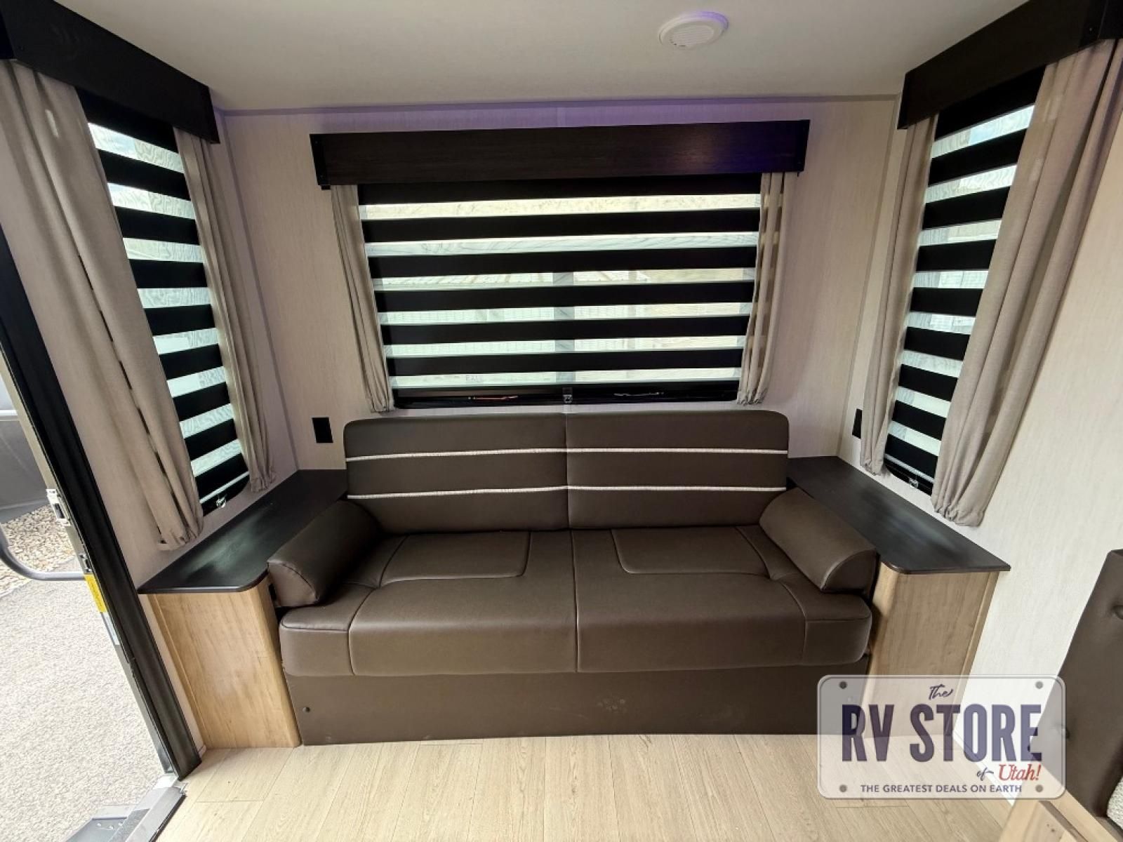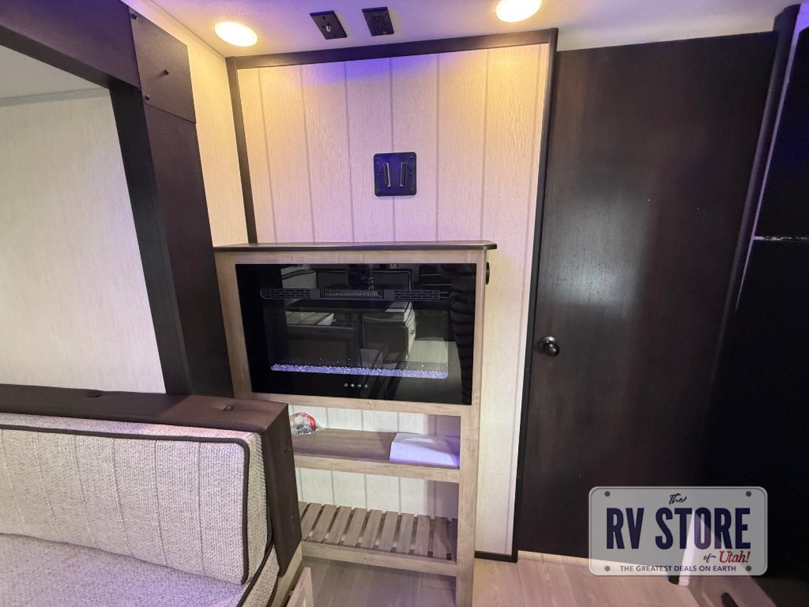 If you've been searching for a travel trailer with a larger sleeping capacity to camp with friends, this is the one! There are double-size bunks in the rear corner, and the full bath with its own exterior entry door is in the other rear corner for easy nighttime use. Up front, an RV king bed in the private bedroom is sure to bring a great night's rest, and you'll find a bedside wardrobe to keep your clothes picked up off of the floor. In the morning, everyone can meet in the main living room that includes a large slide out, U-shaped dinette, sofa, and a fireplace with a hidden pantry behind it for smart storage solutions. An outside kitchen will allow you to get some fresh air as you make dinner, but there's also a full interior kitchen if the weather isn't cooperating. Additional outdoor features include a rear storage rack, an outside TV mount, and a 15' awning for some shade!