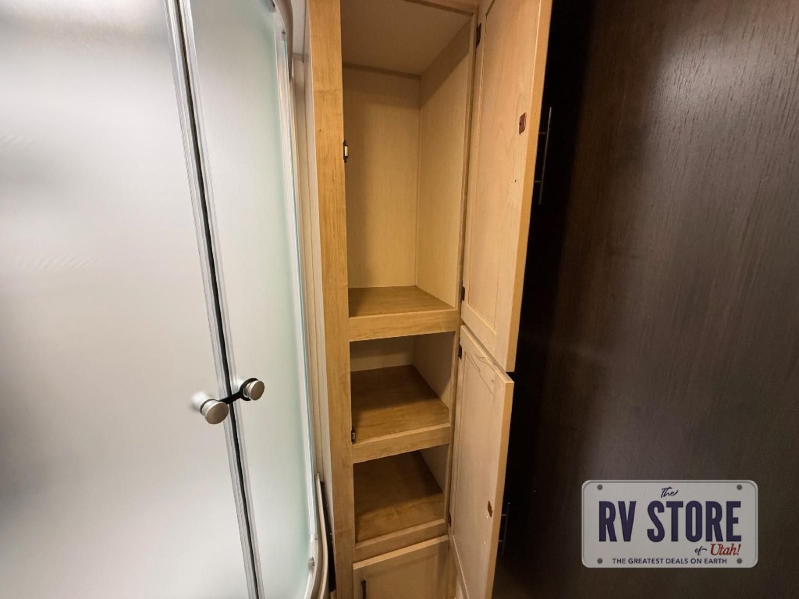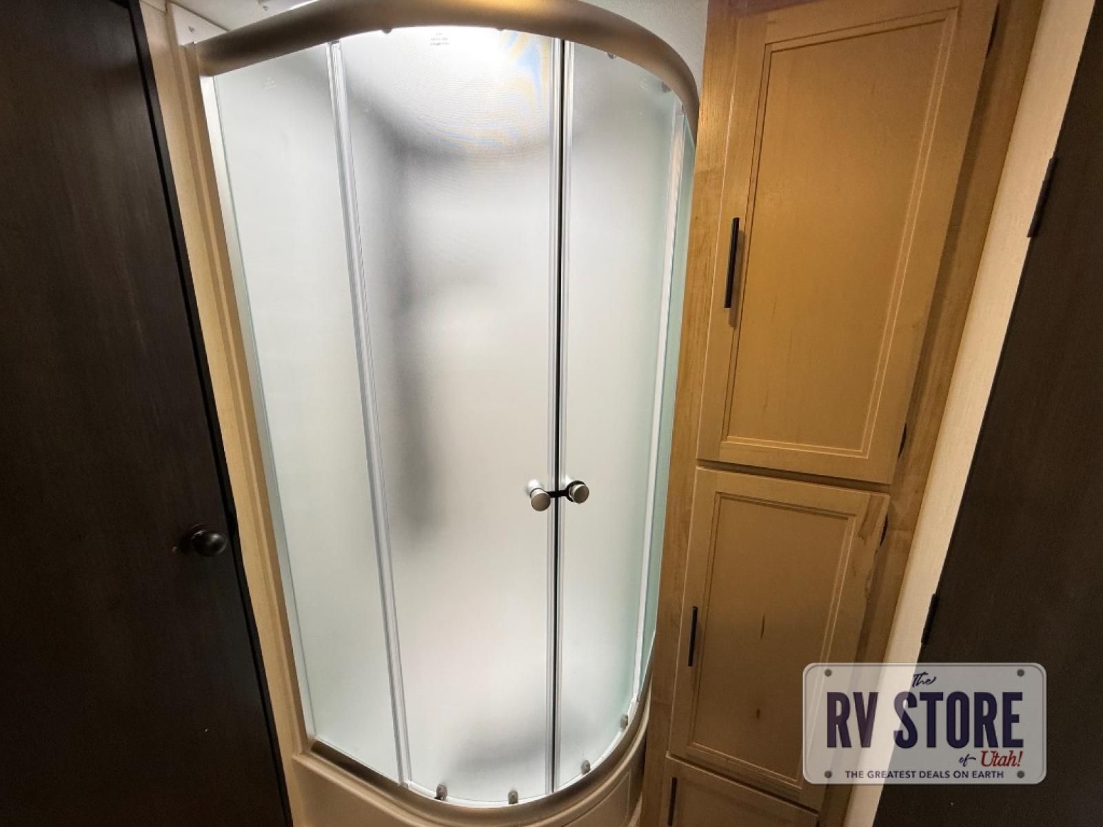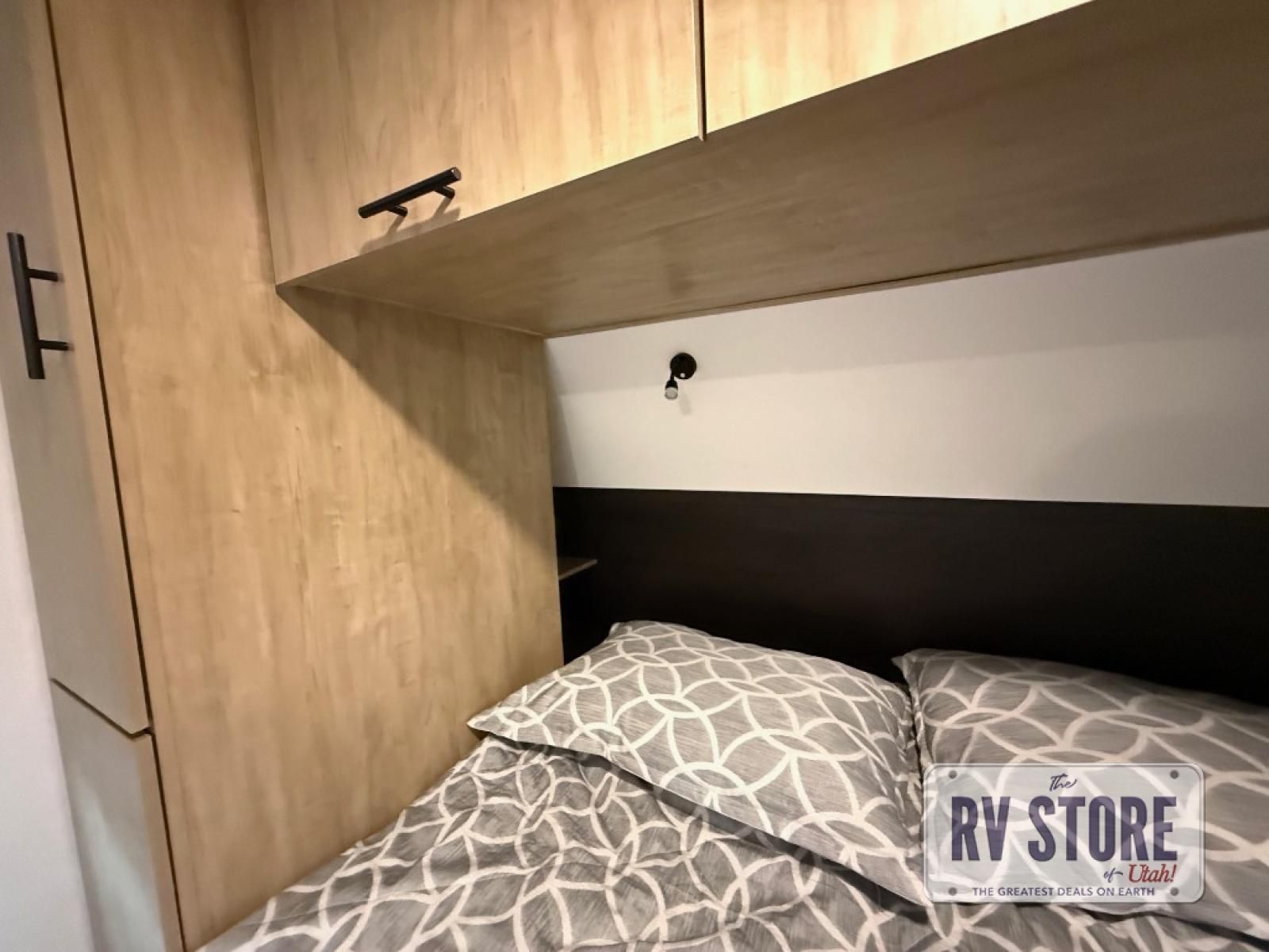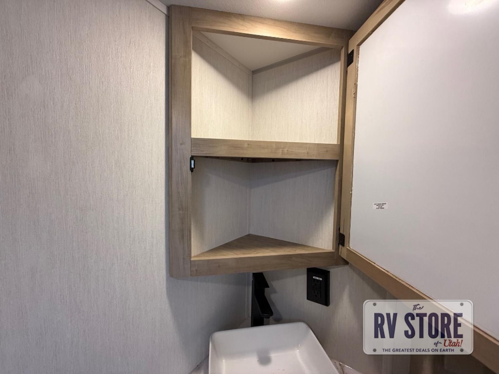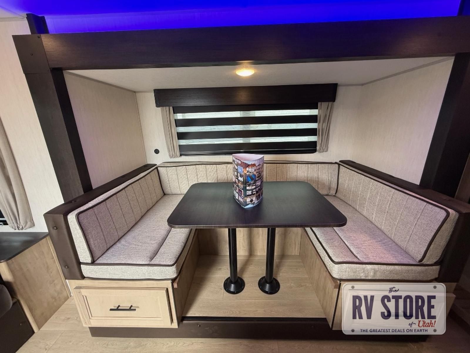 If you've been searching for a travel trailer with a larger sleeping capacity to camp with friends, this is the one! There are double-size bunks in the rear corner, and the full bath with its own exterior entry door is in the other rear corner for easy nighttime use. Up front, an RV king bed in the private bedroom is sure to bring a great night's rest, and you'll find a bedside wardrobe to keep your clothes picked up off of the floor. In the morning, everyone can meet in the main living room that includes a large slide out, U-shaped dinette, sofa, and a fireplace with a hidden pantry behind it for smart storage solutions. An outside kitchen will allow you to get some fresh air as you make dinner, but there's also a full interior kitchen if the weather isn't cooperating. Additional outdoor features include a rear storage rack, an outside TV mount, and a 15' awning for some shade!