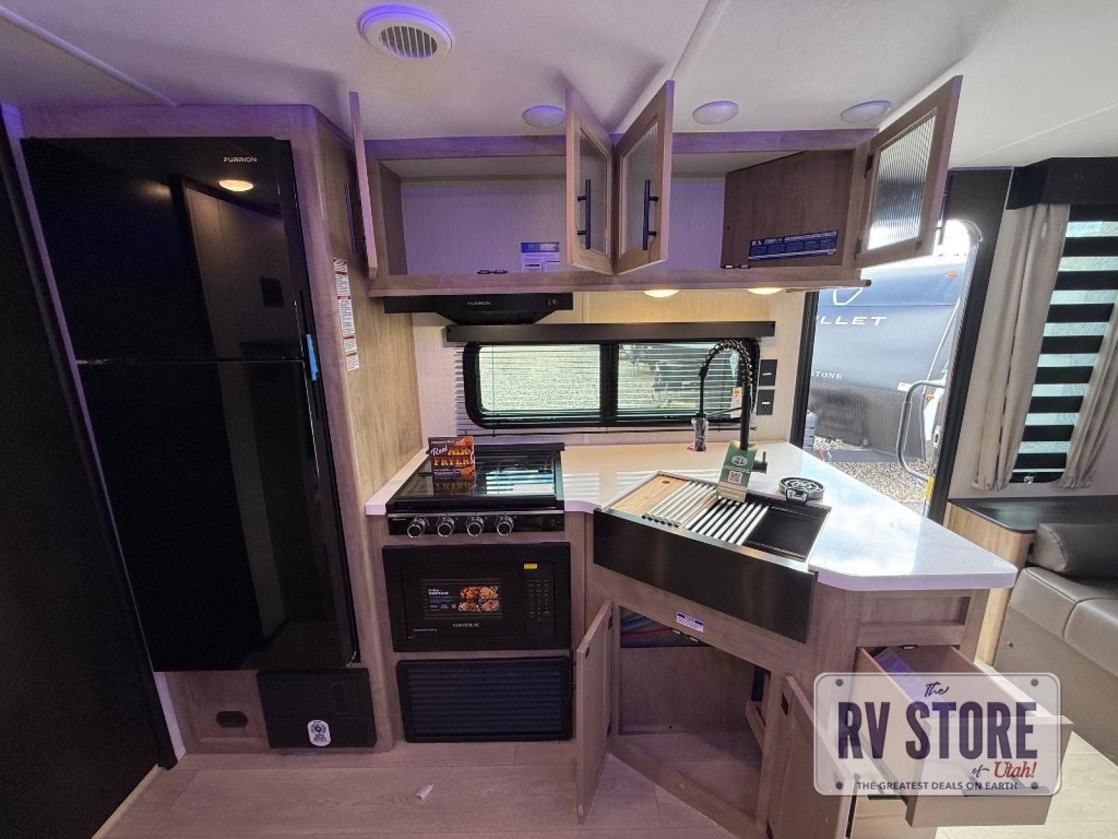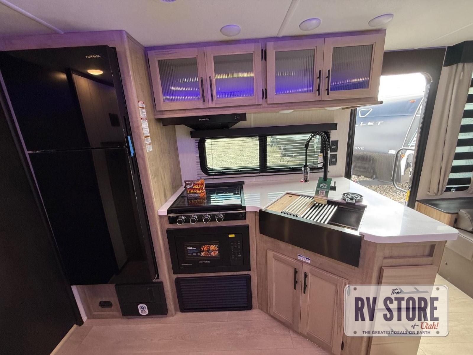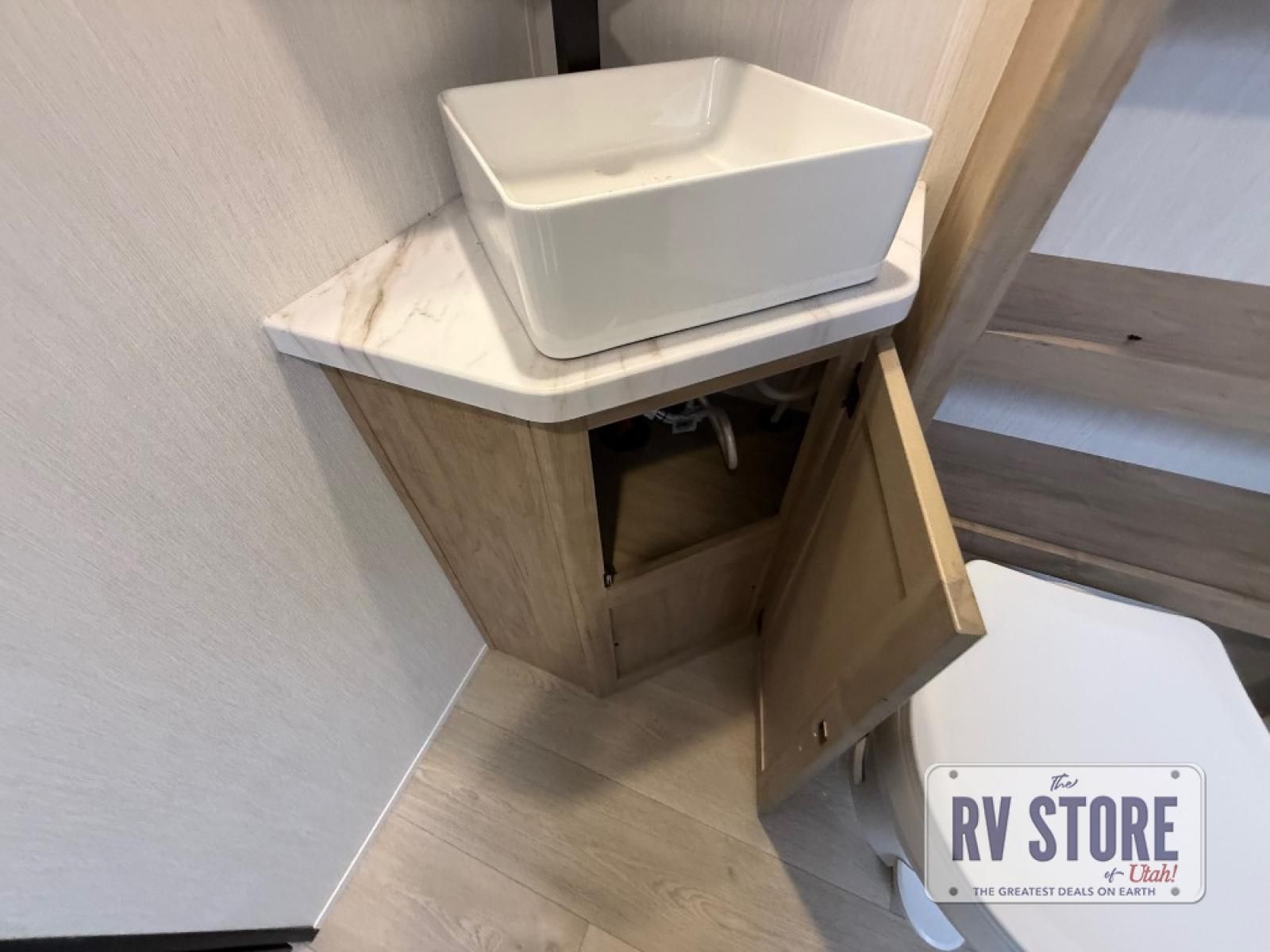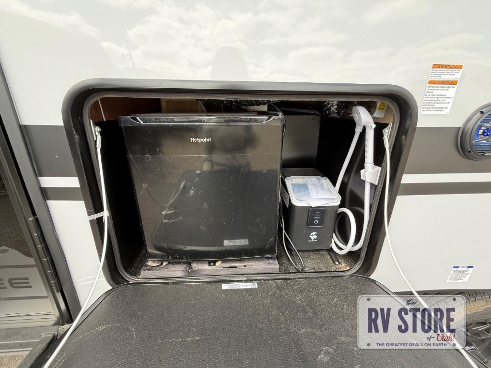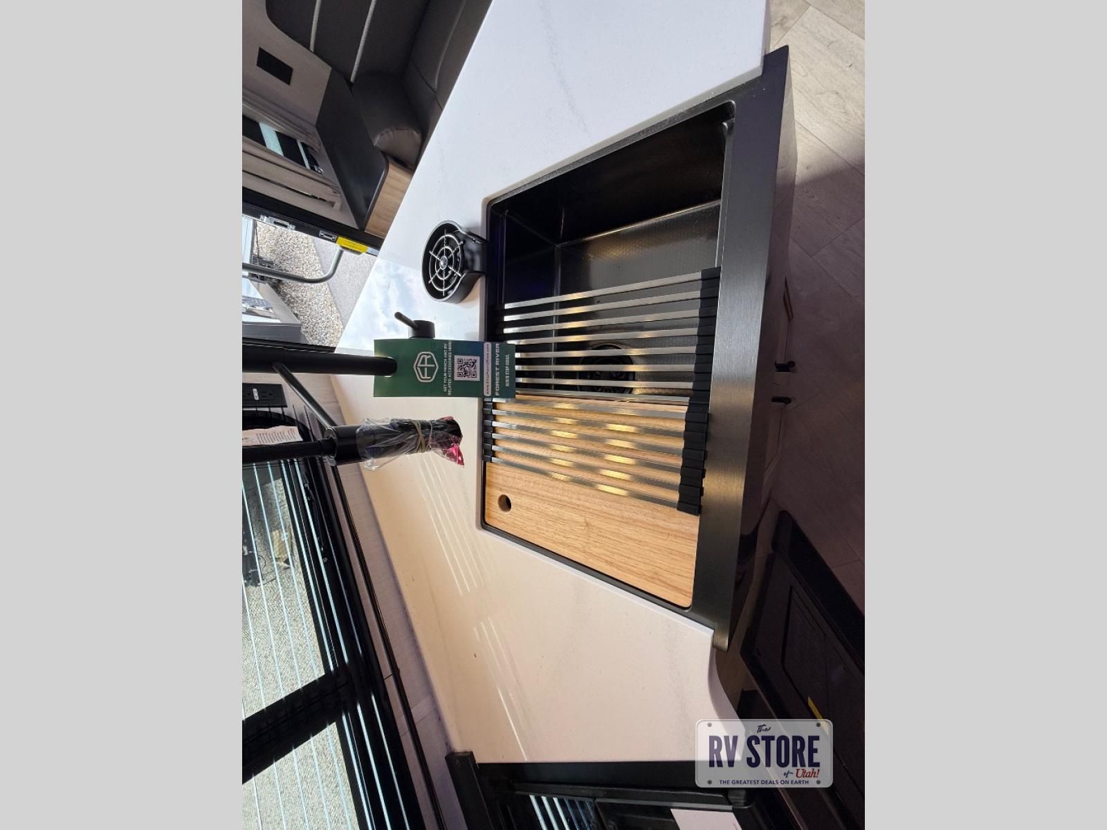 If you've been searching for a travel trailer with a larger sleeping capacity to camp with friends, this is the one! There are double-size bunks in the rear corner, and the full bath with its own exterior entry door is in the other rear corner for easy nighttime use. Up front, an RV king bed in the private bedroom is sure to bring a great night's rest, and you'll find a bedside wardrobe to keep your clothes picked up off of the floor. In the morning, everyone can meet in the main living room that includes a large slide out, U-shaped dinette, sofa, and a fireplace with a hidden pantry behind it for smart storage solutions. An outside kitchen will allow you to get some fresh air as you make dinner, but there's also a full interior kitchen if the weather isn't cooperating. Additional outdoor features include a rear storage rack, an outside TV mount, and a 15' awning for some shade!