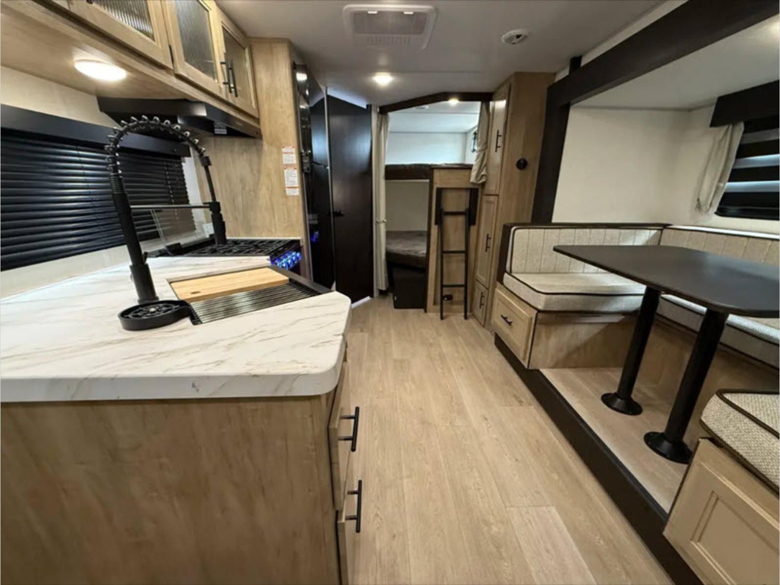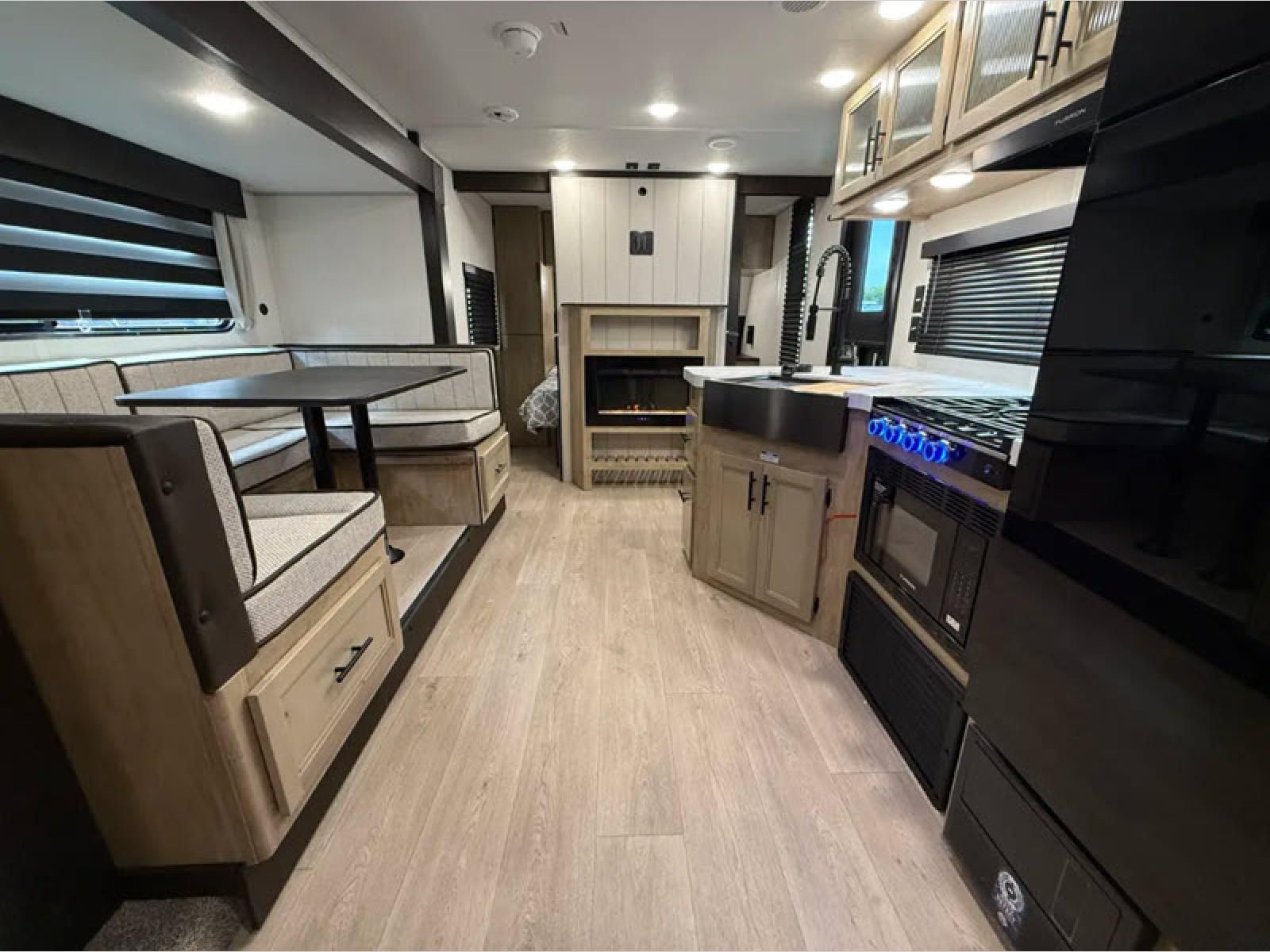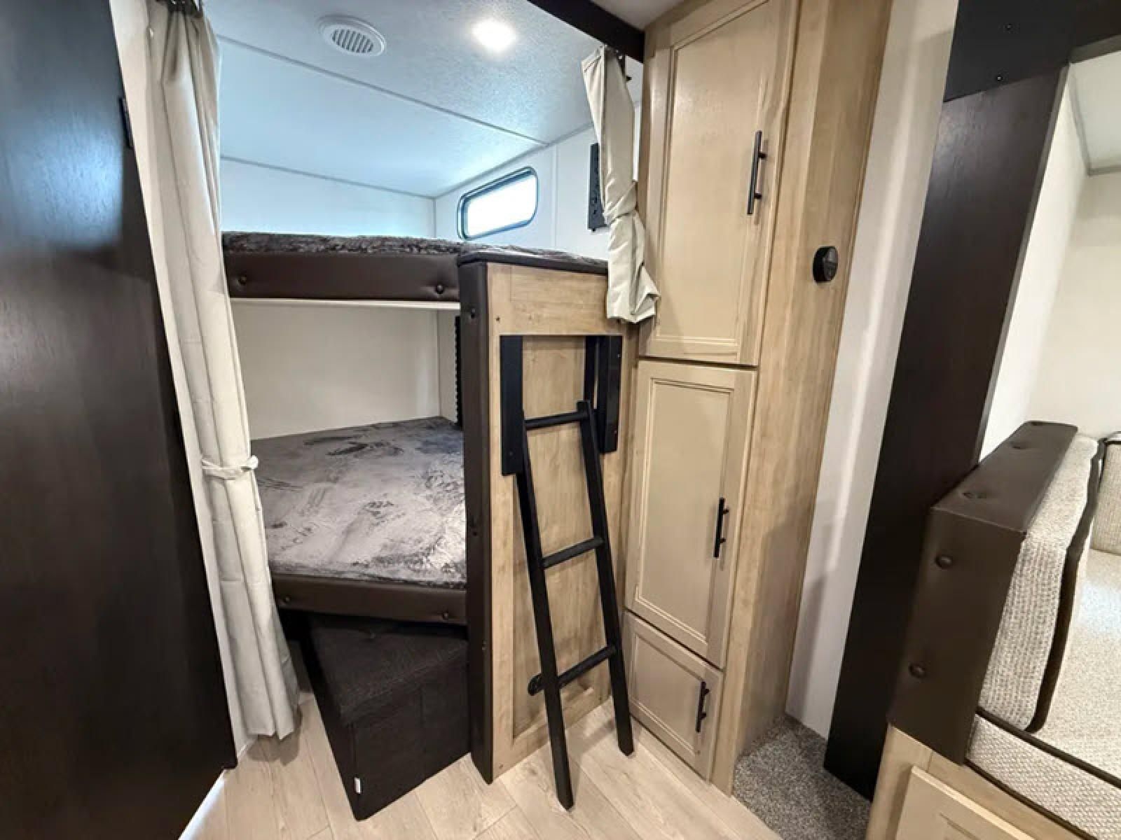 You will love the space provided in this dual entry Cherokee Grey Wolf travel trailer that has double-size bunks! The rear entry door leads right into the full bath allowing easy access from outside when you need to use the bathroom while you're enjoying the great outdoors. The large U-shaped dinette slide will not only seat everyone comfortably for a meal or a game, but since it also slides out, it opens up the interior even more to give you plenty of space for foot traffic. For all of your outdoor gear, you will find the outside storage compartments handy for stowing away your things when not in use. While the kids enjoy their bunk beds, you will enjoy a good night's rest in your RV king bed with wardrobes on either side up in the front private bedroom!
