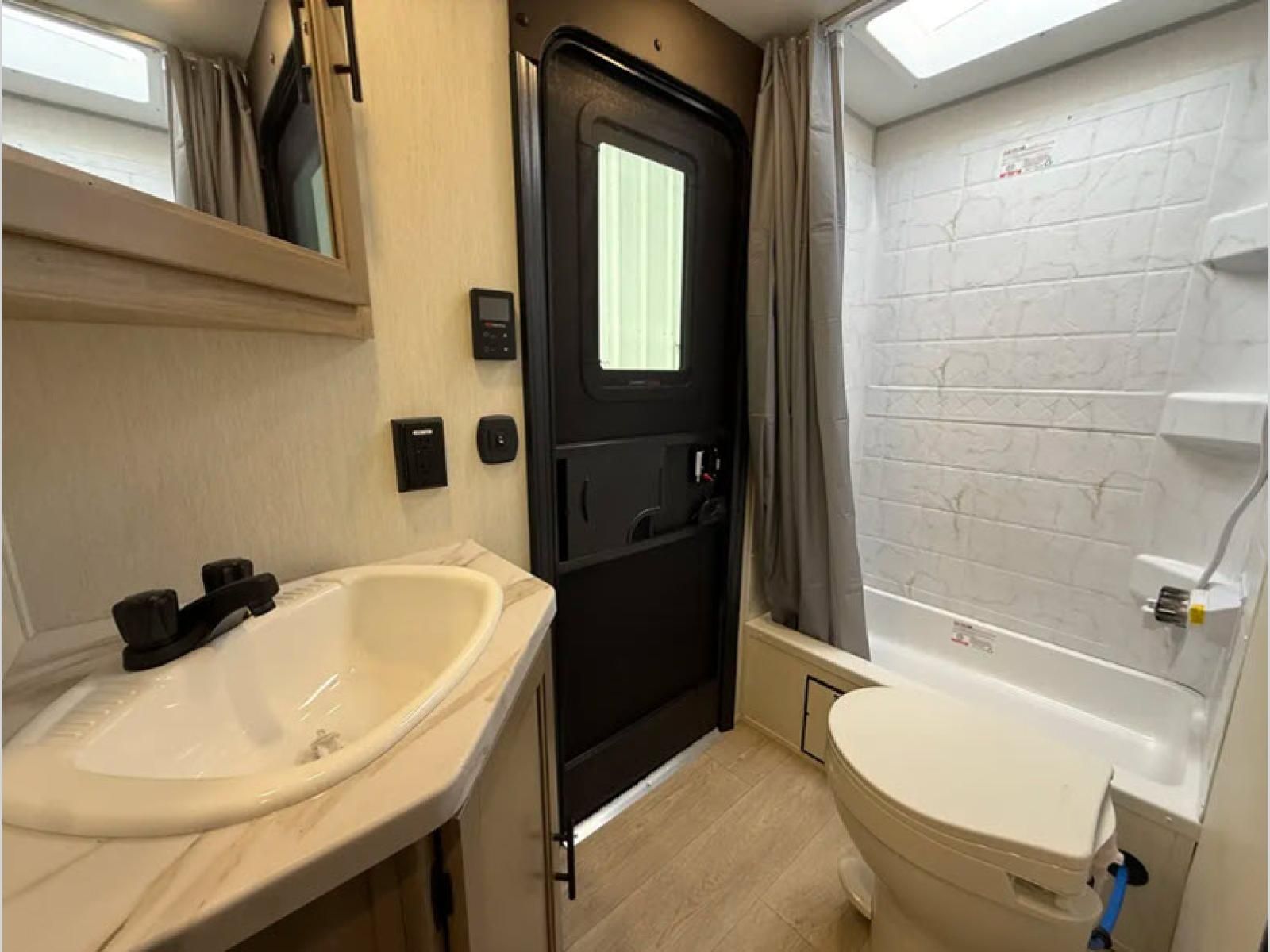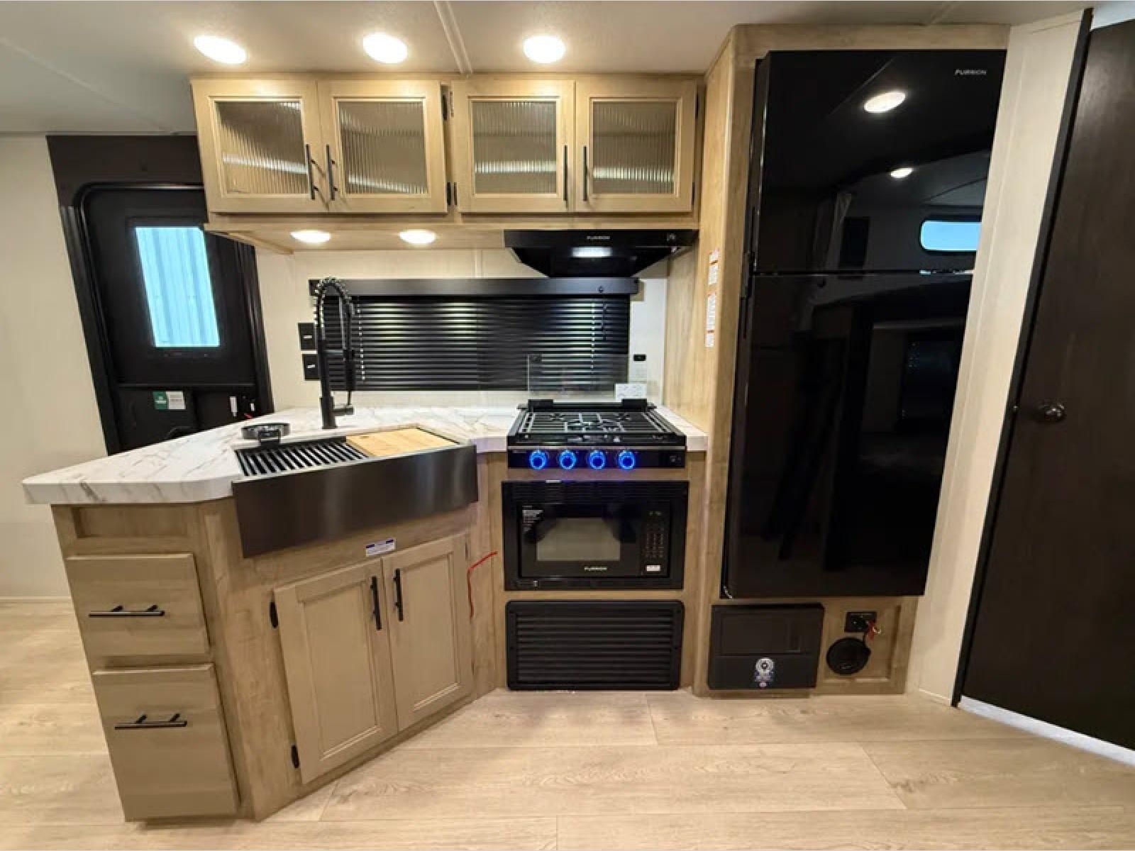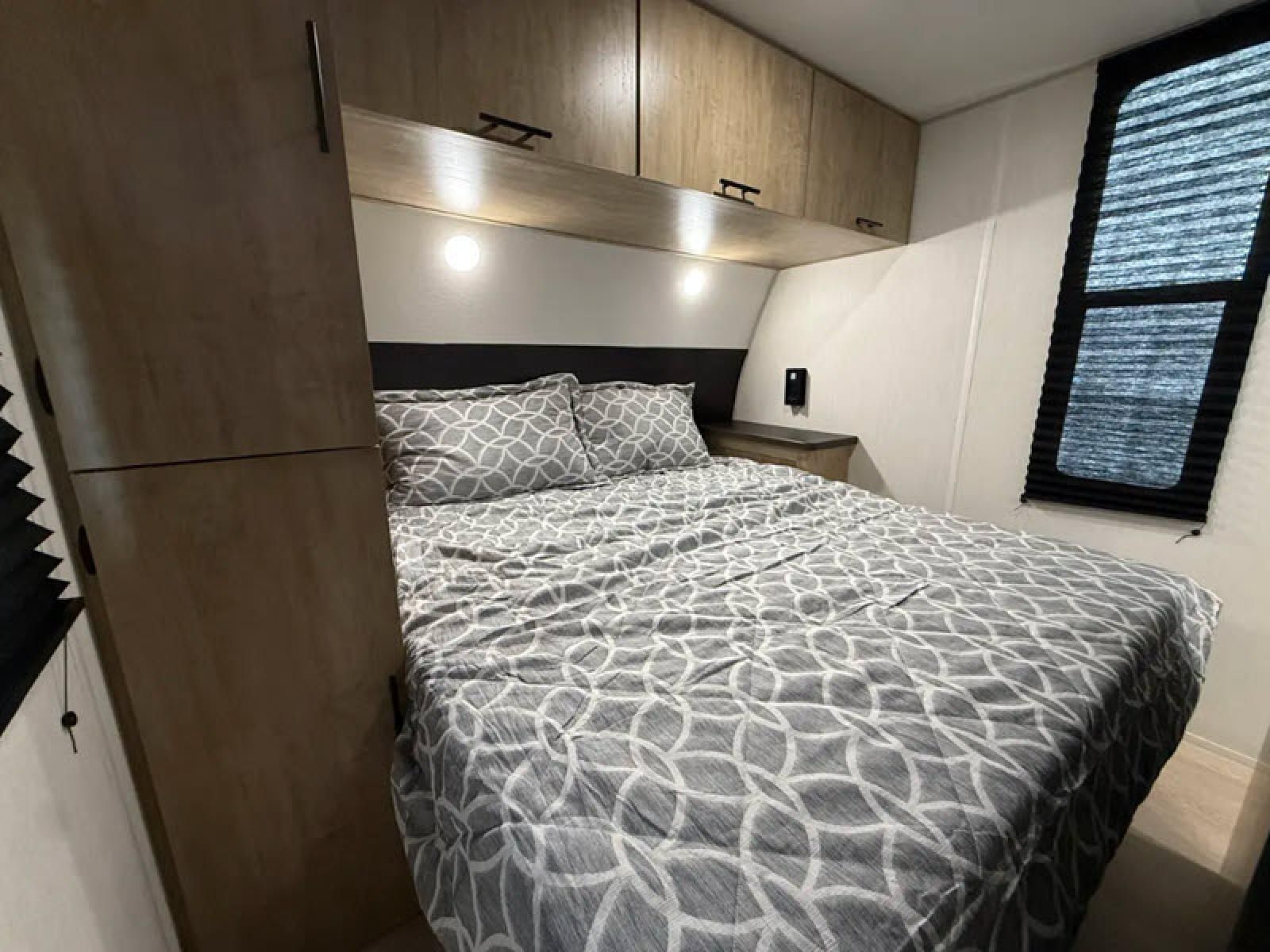 You will love the space provided in this dual entry Cherokee Grey Wolf travel trailer that has double-size bunks! The rear entry door leads right into the full bath allowing easy access from outside when you need to use the bathroom while you're enjoying the great outdoors. The large U-shaped dinette slide will not only seat everyone comfortably for a meal or a game, but since it also slides out, it opens up the interior even more to give you plenty of space for foot traffic. For all of your outdoor gear, you will find the outside storage compartments handy for stowing away your things when not in use. While the kids enjoy their bunk beds, you will enjoy a good night's rest in your RV king bed with wardrobes on either side up in the front private bedroom!