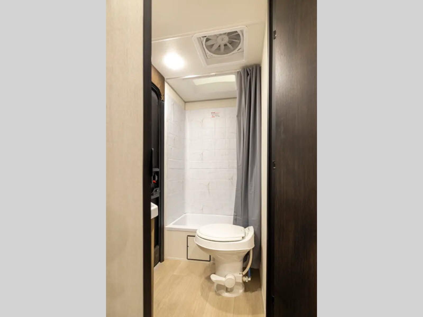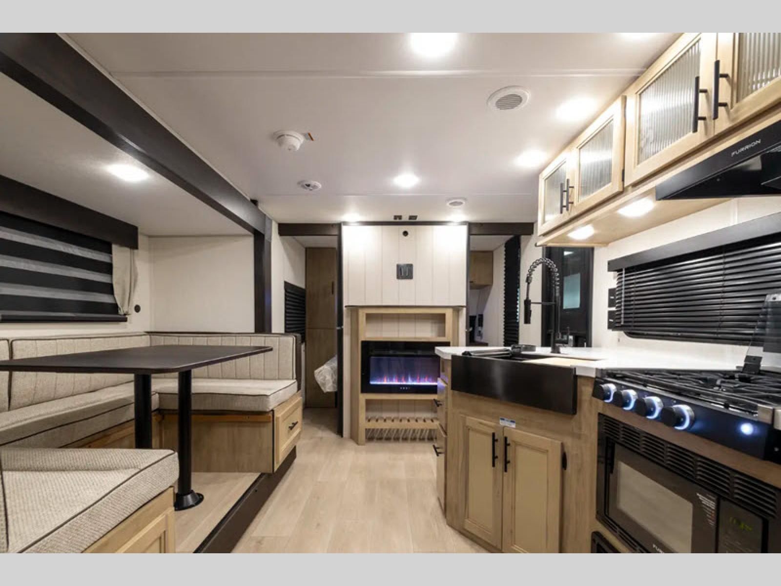 You will love the space provided in this dual entry Cherokee Grey Wolf Black Label travel trailer that has double-size bunks! The rear entry door leads right into the full bath allowing easy access from outside when you need to use the bathroom while you're enjoying the great outdoors. The large U-shaped dinette slide will not only seat everyone comfortably for a meal or a game, but since it also slides out, it opens up the interior even more to give you plenty of space for foot traffic. This space also serves as extra sleeping space if needed. For all of your outdoor gear, you will find the outside storage compartments handy for stowing away your things when not in use. While the kids enjoy their bunk beds, you will enjoy a good night's rest on the RV king bed with a wardrobe in the front private bedroom!