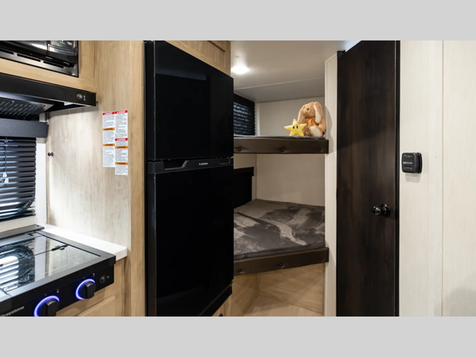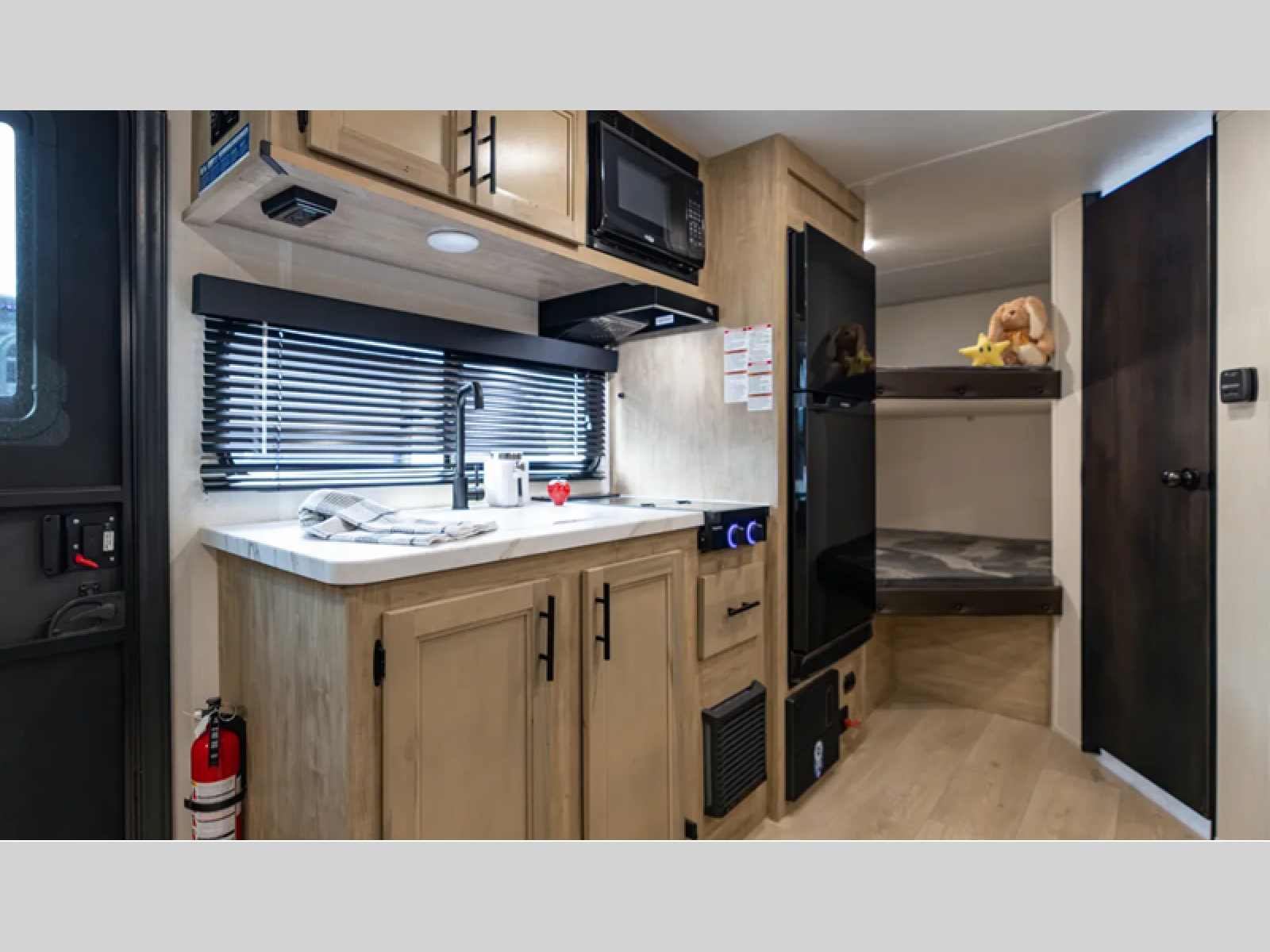 This family travel trailer is ready to head to the campground whenever you are! The kiddos can sleep on the set of double-size bed bunks, and you can sleep on the front queen bed, plus the U-shaped dinette slide can also transform into an extra sleeping space when you aren't using it to enjoy a meal prepared with the cooktop. You can also prepare your delicious meals at the outside mini kitchen and stay protected by the power awning. The exterior not only has outside storage and an outside TV mount but also features an outside storage plus door for access to the storage space underneath the bottom bunk bed. The rear corner bath allows everyone to stay clean and refreshed while you camp.