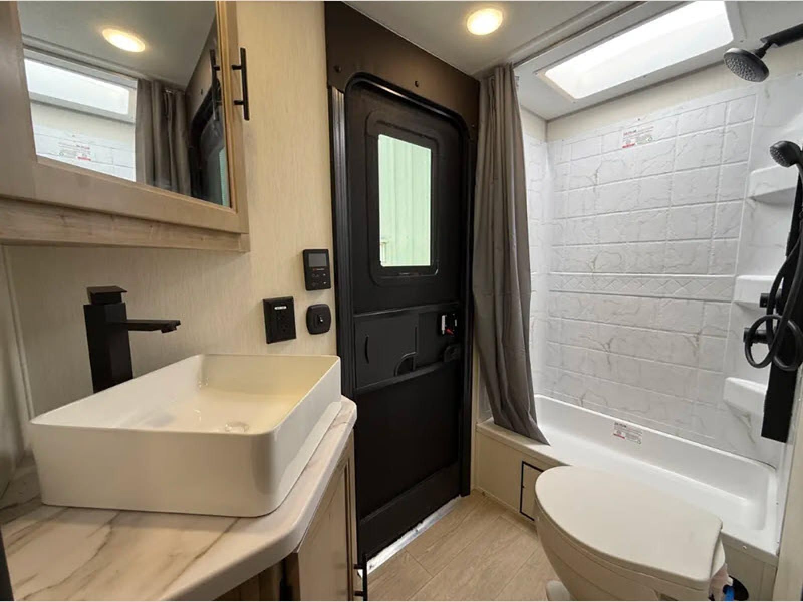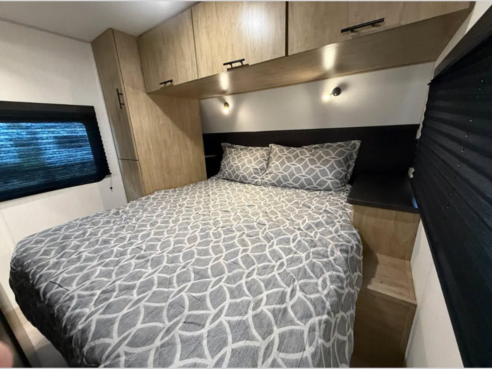 Come on inside this Cherokee Grey Wolf Black Label travel trailer and experience the convenience of a smooth flow of traffic in and out with two entry doors. The rear door leads into a full bath which is great for accessibility when outside and when you need to use the bathroom. Once inside, you will notice the large U-shaped dinette and the sofa which sit on the slide and create a spacious footprint for moving about, as well as great places to play games and socialize with your friends and family. A large pantry provides plenty of storage allowing you to stock up on your favorite snacks and dry goods for your family adventure. At night, there is sleeping space for everyone between the double-size bunks and the RV king bed, plus the furniture.