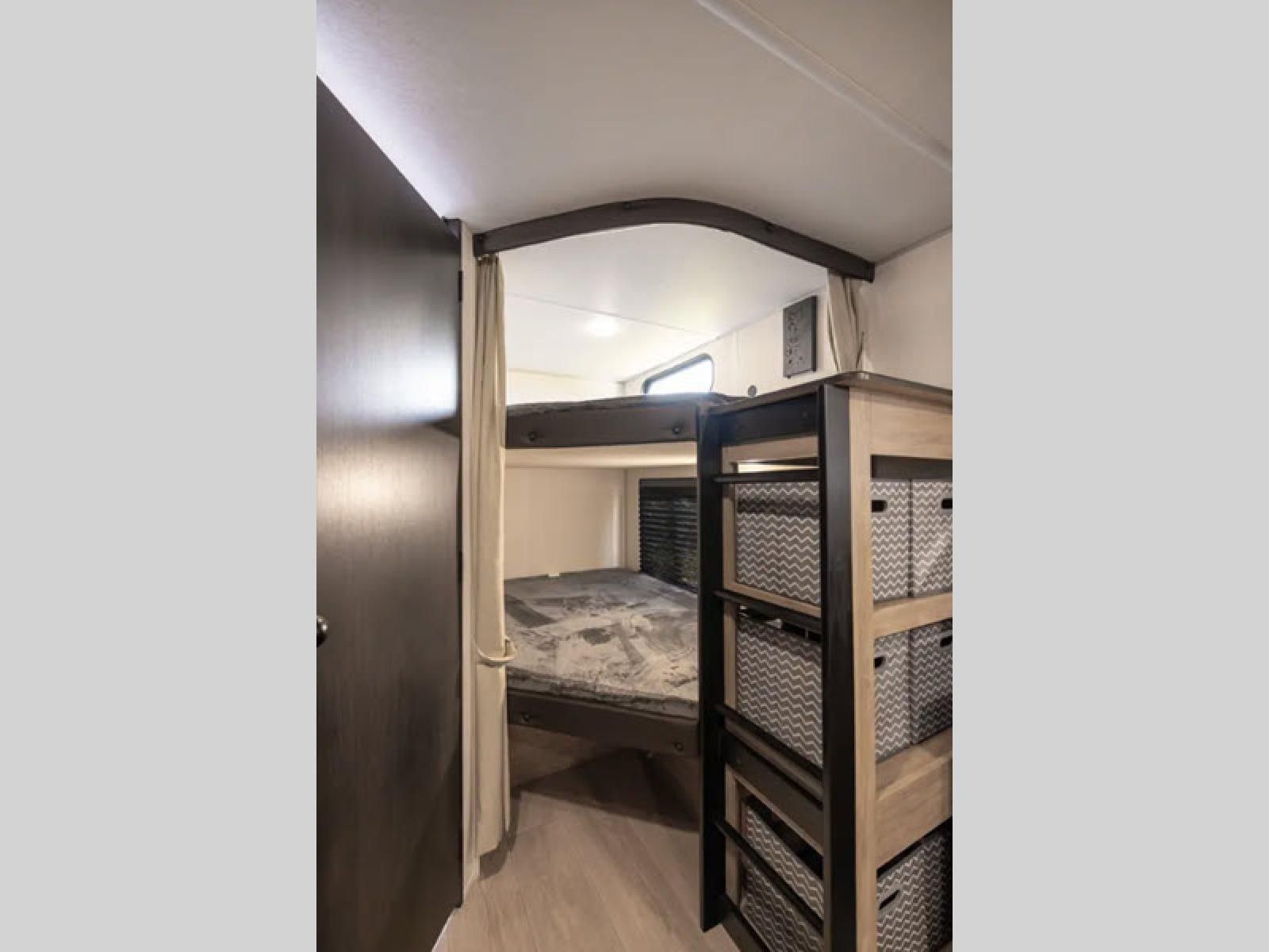 If you've been searching for a travel trailer with a larger sleeping capacity to camp with friends, this is the one! There are double-size bunks in the rear corner, and the full bath with its own exterior entry door is in the other rear corner for easy nighttime use. Up front, an RV king bed in the private bedroom is sure to bring a great night's rest, and you'll find a bedside wardrobe to keep your clothes picked up off of the floor. In the morning, everyone can meet in the main living room that includes a large slide out, U-shaped dinette, sofa, and a fireplace with a hidden pantry behind it for smart storage solutions. An outside kitchen will allow you to get some fresh air as you make dinner, but there's also a full interior kitchen if the weather isn't cooperating. Additional outdoor features include a rear storage rack, an outside TV mount, and a 15' awning for some shade!