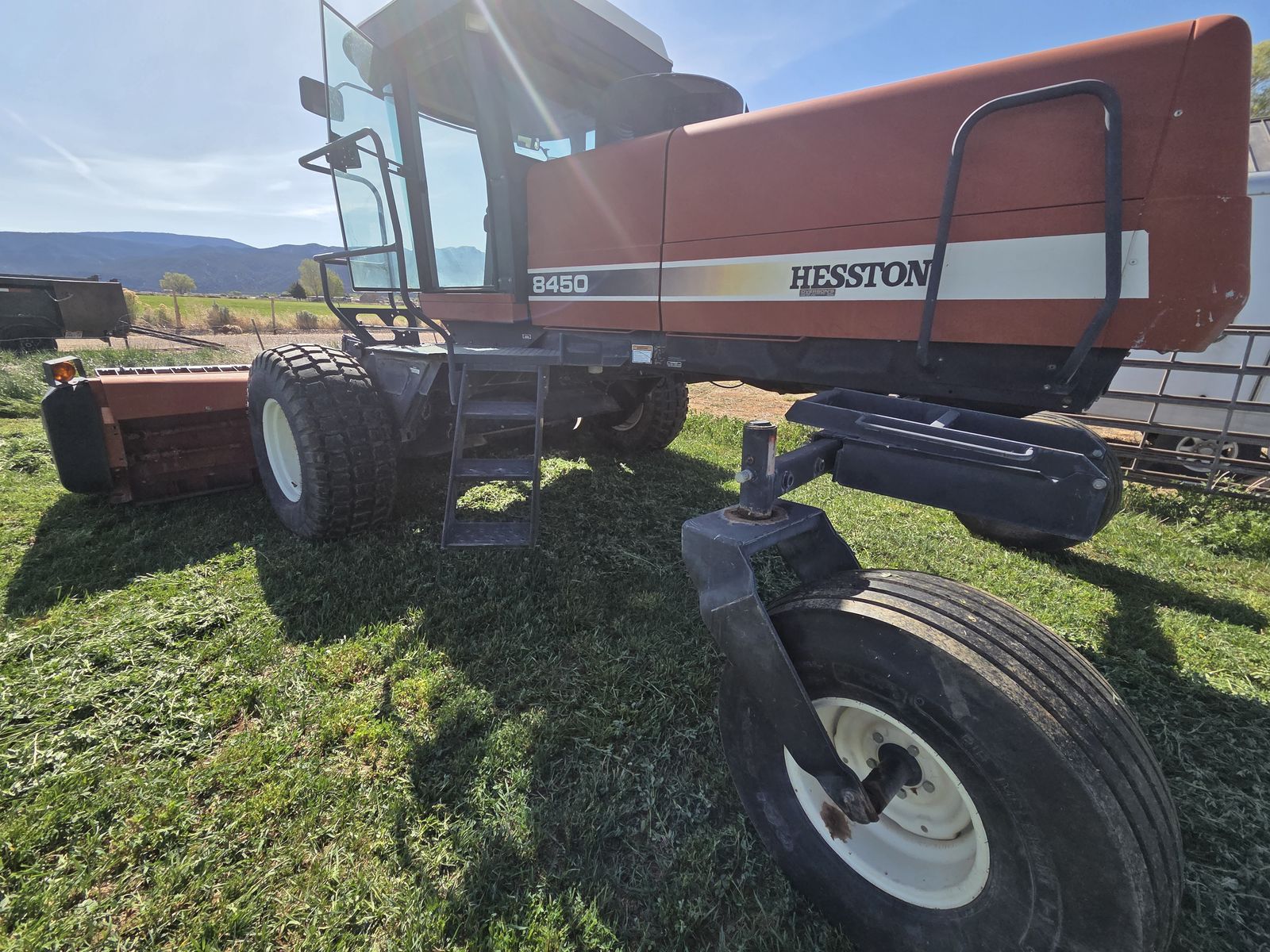 Zelle2004 Hesston 8450 swather with Cummins four cylinder motor(3200 hours). Cutting bar is 16'(about 2000 on head). Local shop went threw it and gives it a complete thumbs-up to start cutting today! Swather has brand-new set of 4 tires at $5K for the set. New roller bearings on rotor wheel. Serious inquiries only! Local p/u only.