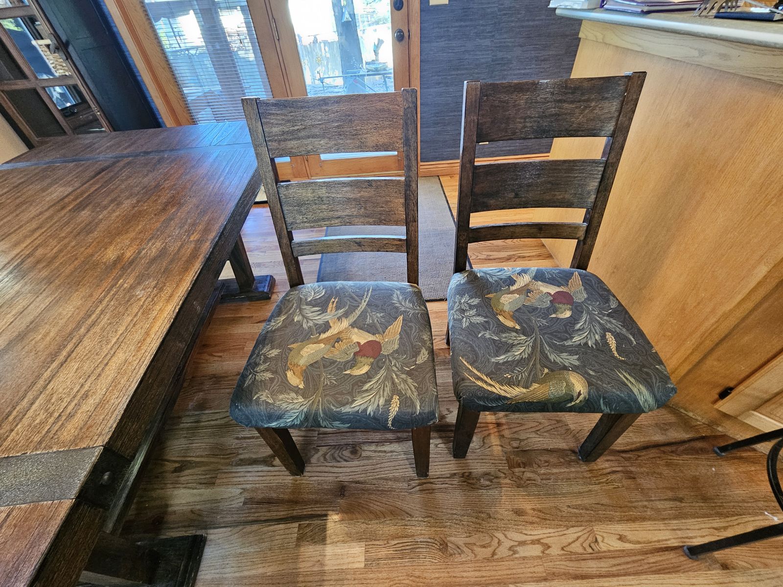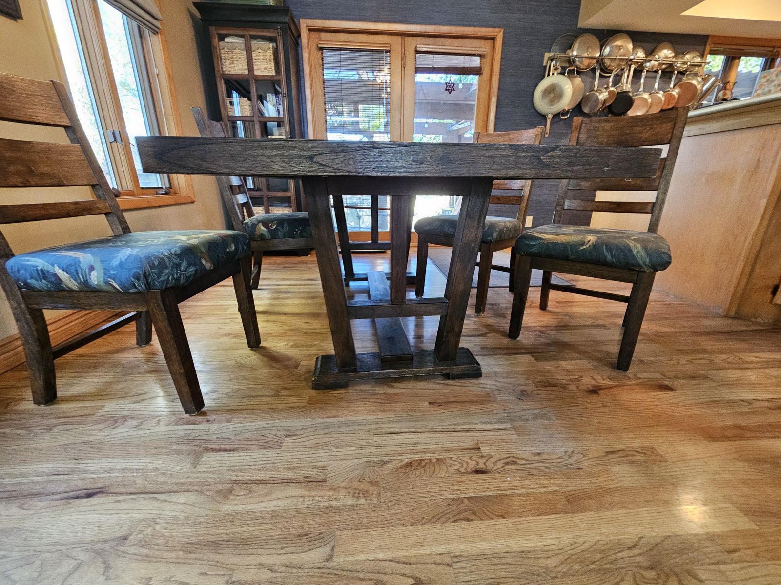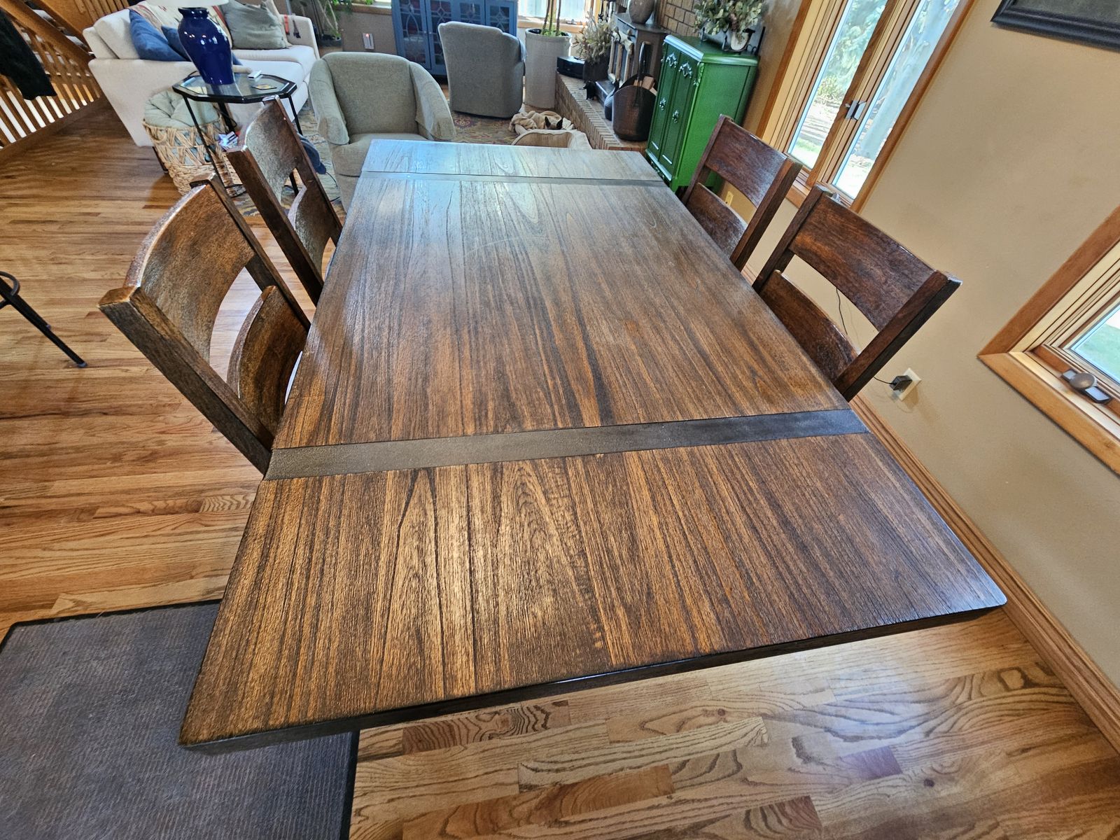 Very nice wood and composit table with 4 chairs. 76" x 42", 30" tall.