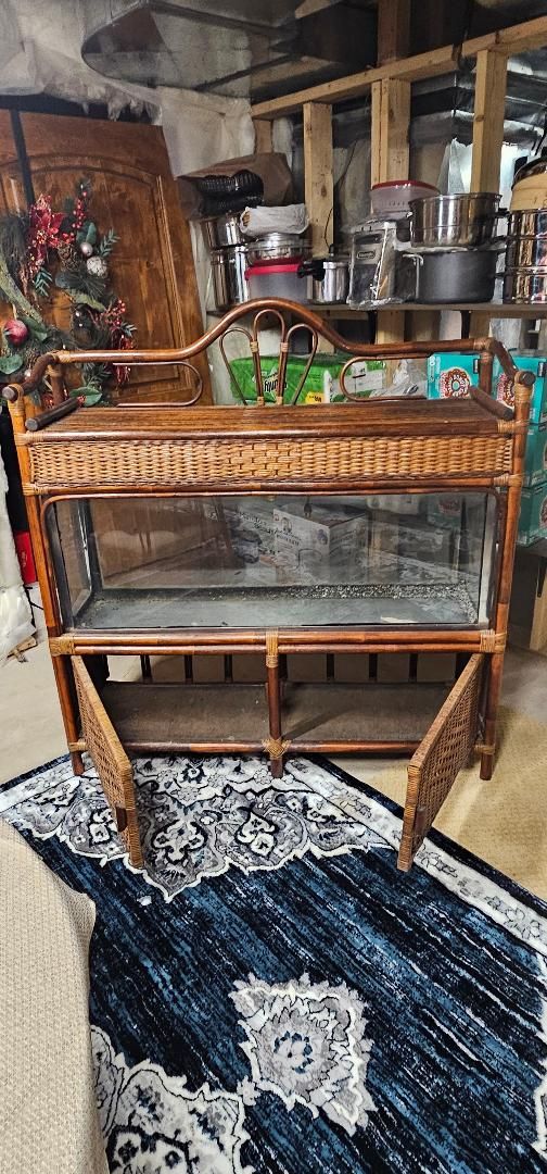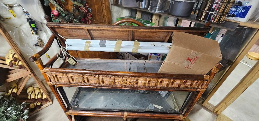 Glass and Bamboo fish tank or can be used as reptile terrarium. Glass is good but tank needs to be resealed to hold water. Has lights and screen if used as terrarium. Frame is made from heavy duty metal, and bamboo is in good shape. Dimensions are 48 inches wide by 17 inches deep by 12 wide. Tank will hold approx 42 gallons. Asking $100 or best offer. Cash only.