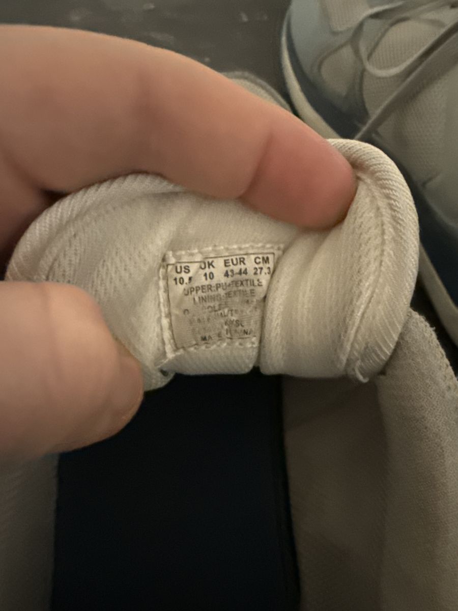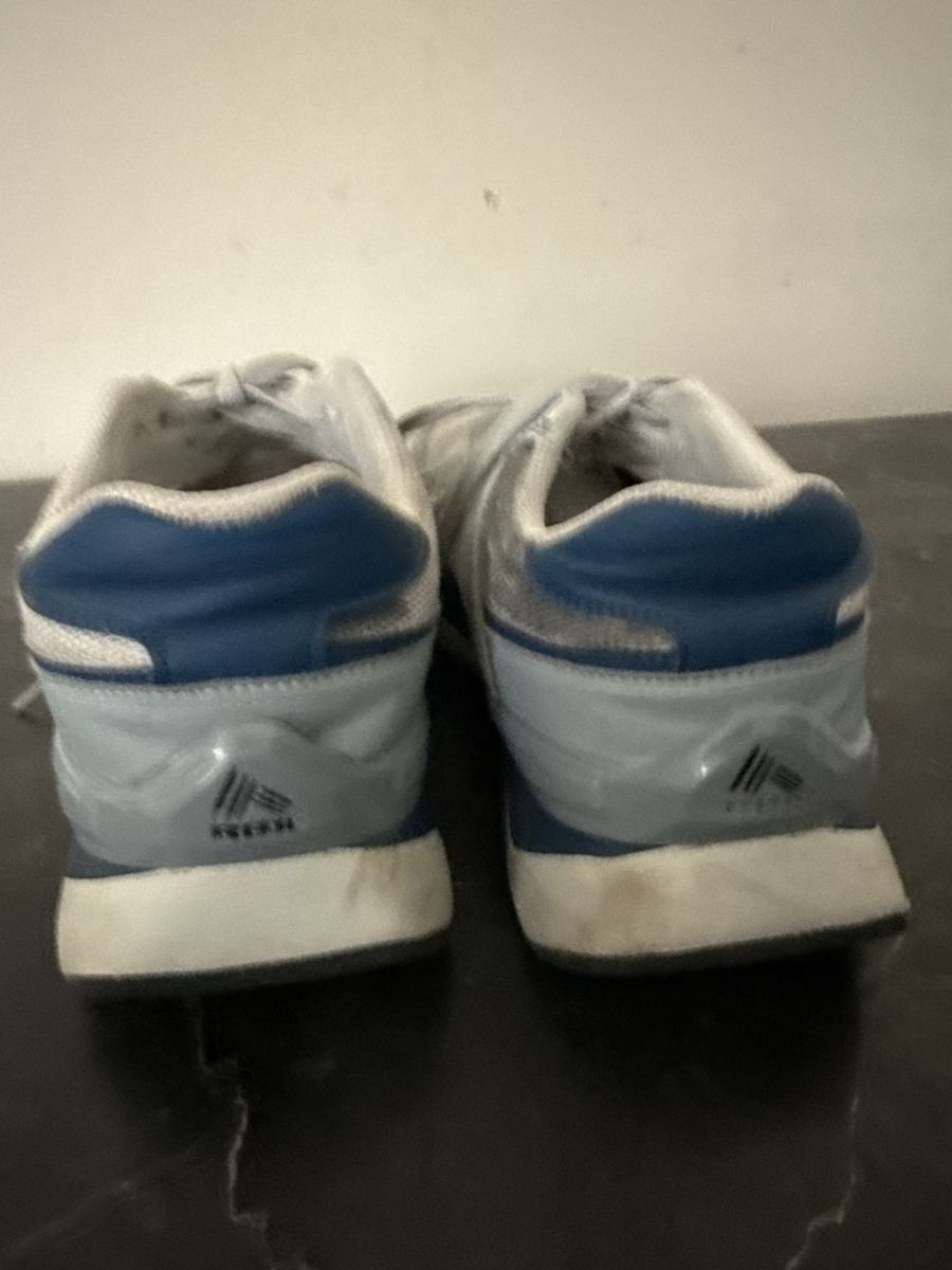 It was a good shoe for my son for a while, but he doesn’t use it anymore and it doesn’t fit him and it’s a little dirty with a little bit of expo marker in the back but hard to see, but on the other shoe for right foot it has like lines on the side, but it’s visible, but if you use the right cleaning equipment, you can buff it out