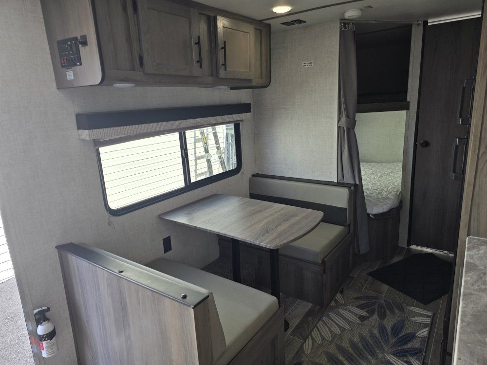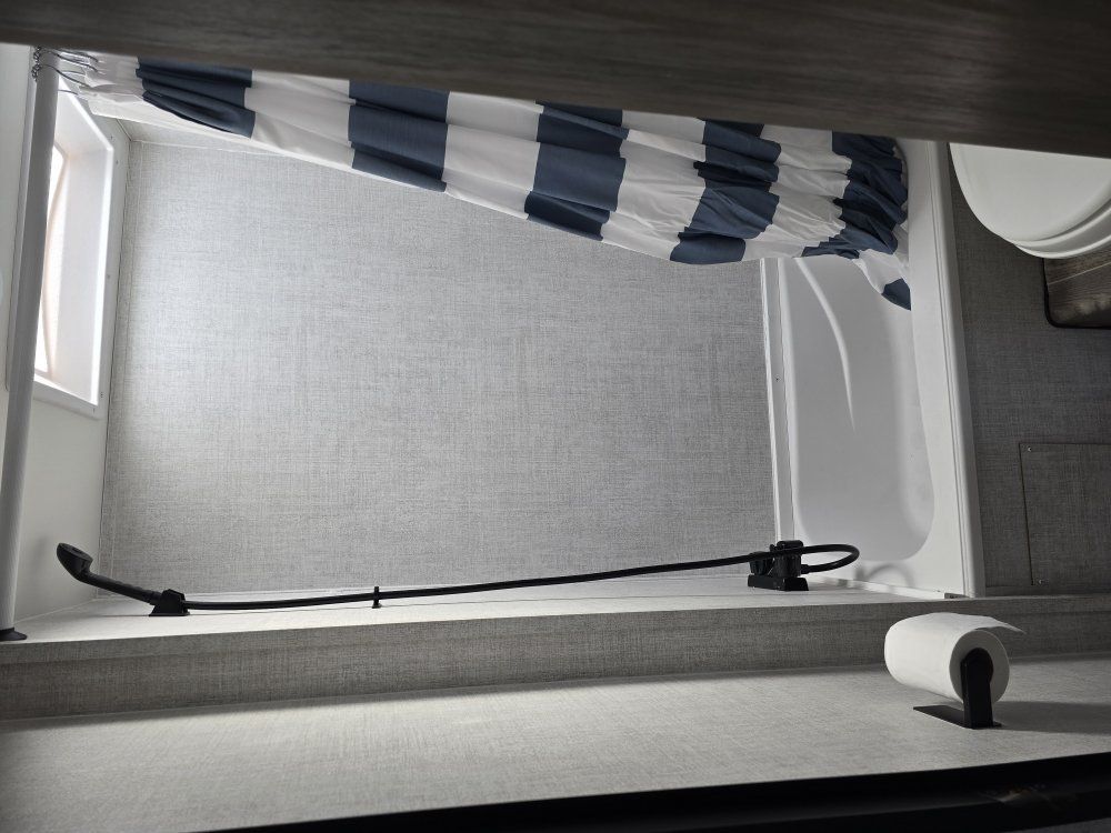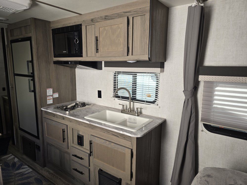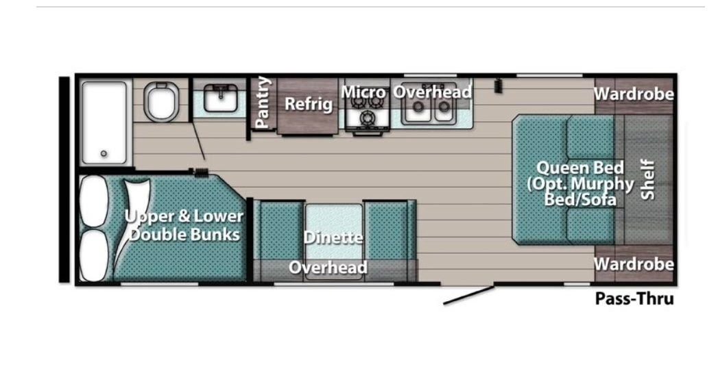 Length: 26'7". Width: 8'. Exterior height: 10'4". Interior height: 6'8". Dry weight: 3899. Hitch weight: 500. Net carrying capacity 3601. Fresh water: 23. Grey tank: 36. Black tank: 36. Furnace: 20,000 BTU. Water heater: tankless. LP tank: 2 x 20 lbs. Sleeps 6: A queen size bed, bunk beds, and a kitchen table that could sleep 2. Bat tub and shower. Air conditioner. Bath tub and shower. Refrigerator and freezer. Toilet. 3 burner stove. Microwave Dual sink. TV capability. 2 deep cycle batteries. Battery disconnect. 110 volt as well as DC power. Tandom axle. Electric jack with light. Equalizer hitch. 2 outside access storage cubbies (1 full width). Electric awning.