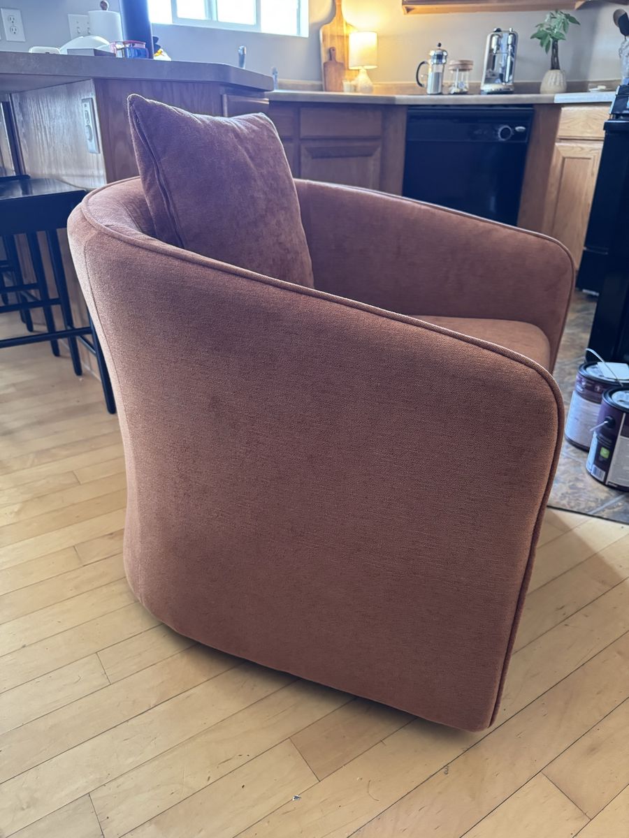 ApplePayBrown/orange velvet accent swivel chair Material Velvet Product Dimensions 28.4"D x 30.25"W x 28"H Frame Material Wood Pattern Solid 360 DEGREE SWIVEL BARREL ACCENT CHAIR