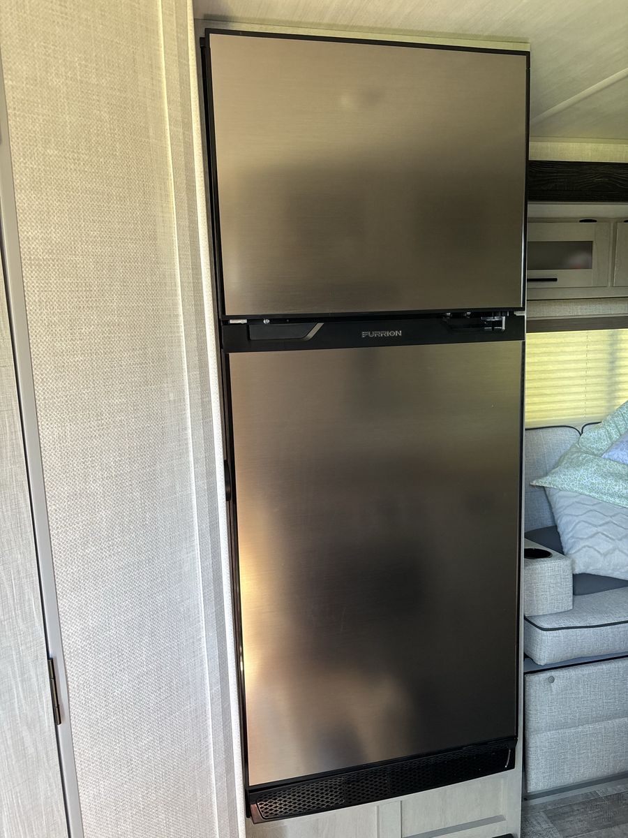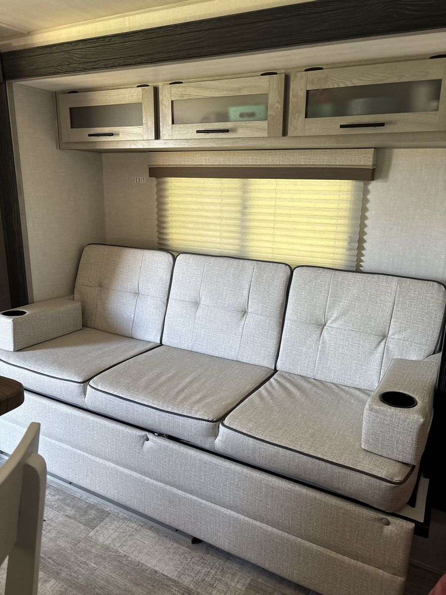 This is an off road- off grid 24 foot trailer featuring a queen Murphy bed in the rear, a full sofa that makes into another bed, an L shape kitchen counter with 2 bar stools, a very large refrigerator, stainless steel appliances including a deep round kitchen sink. 1 Slide 3 piece bathroom 2 Burner Cooktop Microwave/Convection Oven AC 2 Solar Panels Outside Cook Top 16ft Power Awning Built-in safe Central Vacuum System 32” TV This trailer has Beast Mode with Tandem Axles, Independent Suspension, All Terrain Tires, increased ground clearance, enclosed heated underbelly, heated tank pads, Husky anti sway attachment ($599.99). We have used this trailer twice and are only selling it due to health and age. It sleeps 4 but is really perfect for 2 people. You can leave the Murphy bed down if you like. There is plenty of seating with the sofa and bar stools.