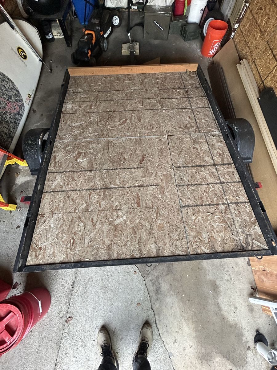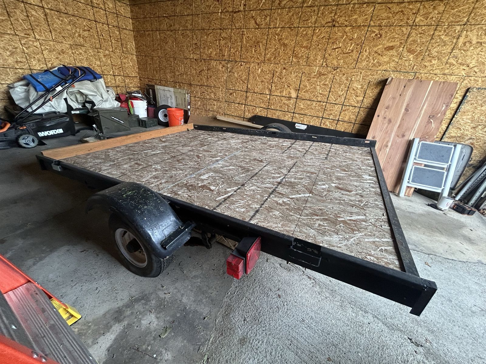 VenmoThis little trailer pulls great and measures about 8’ long by 6’ wide. It is perfect for snowmobiles, ATVs, a small raft, or just general farm utility. It’s a bit old and worn and certainly nothing fancy. The driver side tail light housing is cracked, but still works. Spare tire included. Has slots for a 2x4 fence if desired. Definitely a step up in size from the popular harbor freight option.