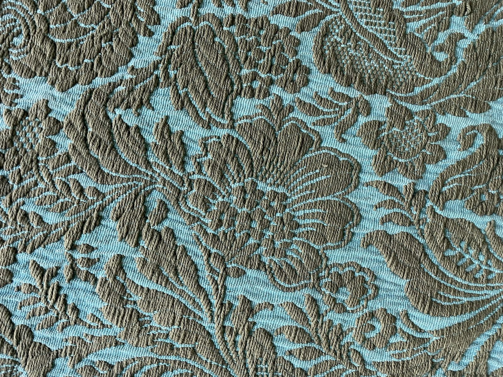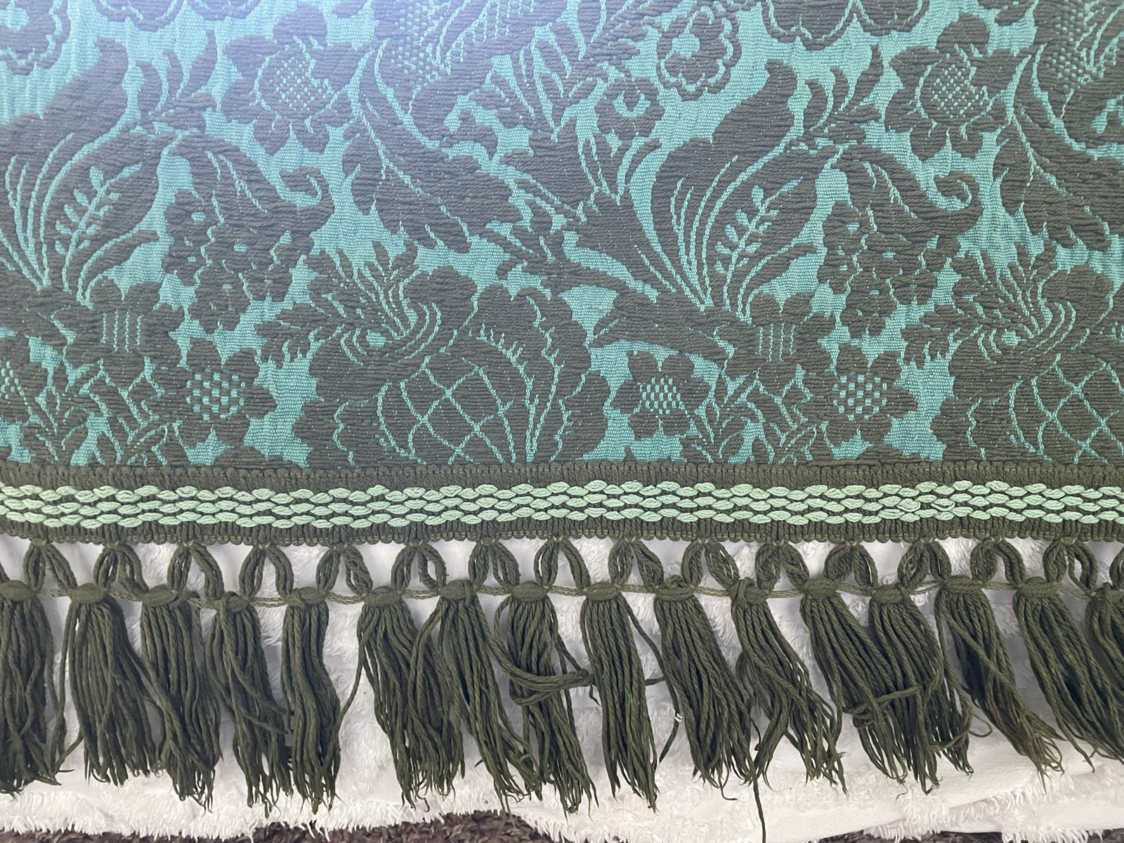 ZelleTeal and yellow-green blanket with tassels. Weighs about 8lbs. Fits over a queen bed but doesn’t touch down on the sides. Twin bed would likely touch down. In amazing shape for its age. Just missing a few tassels on the sides