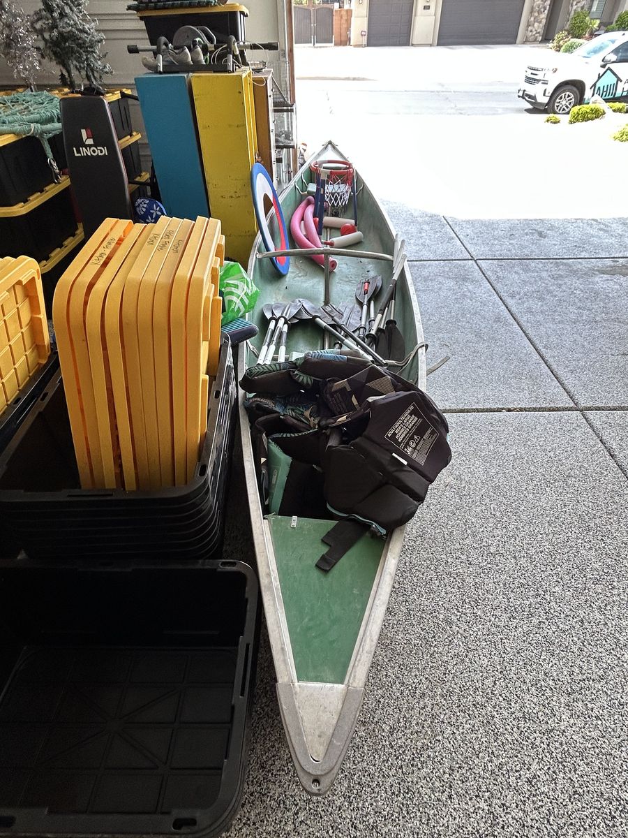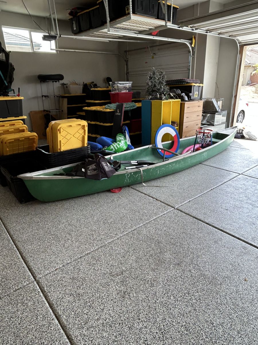 Solid older canoe that’s ready to get out and enjoy. The hull is watertight with no leaks and has been reliable for casual use. Comes with a few older paddles.
