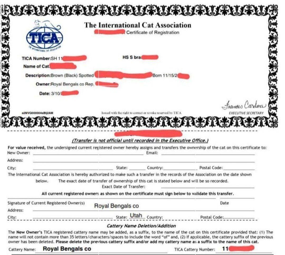 Tica Registration 12 Health Tests Company care package Royal Food Program Registration with our Dietitian Free pet classes Free Company Planner Deposit Options upon meet & greet visits/Adoption visits 50 pounds of litter Transitional food packages First round of Vaccinations 2 Rounds of Deworming Certified Company Health Guarantee Microchipped & Free Lifetime NO payments to you for your peace of mind Health Records Breeding Rights Available Royal Bengals Membership Options Congratulations Gift bags Beds & Receiving Blankets Starter Pack - the rest of their stuff in their cubby Bag of favorite toys Pet pass port good for 3 years ( upon deposit inquiry)