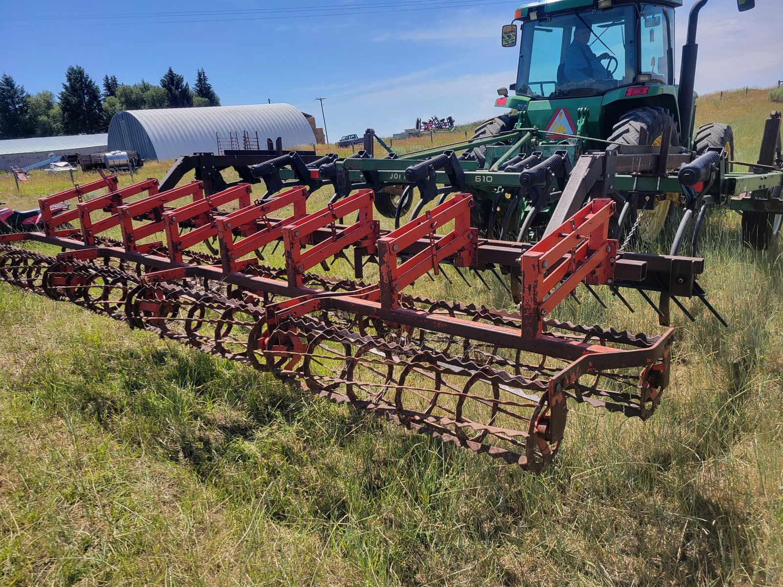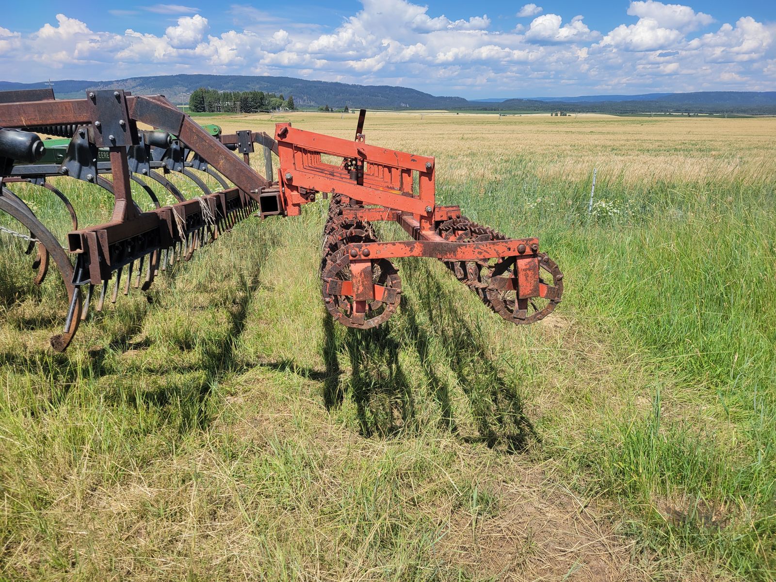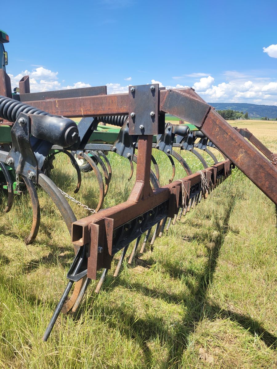 16' John Deere chisel for sale. This unit is a 3 point mount model. It has a floating harrow bar and two rows of rolling baskets behind, which can be removed if so desired. There's no points or shovels on this chisel at this time. $5000, please call or text Mark at 2o8-351-389three