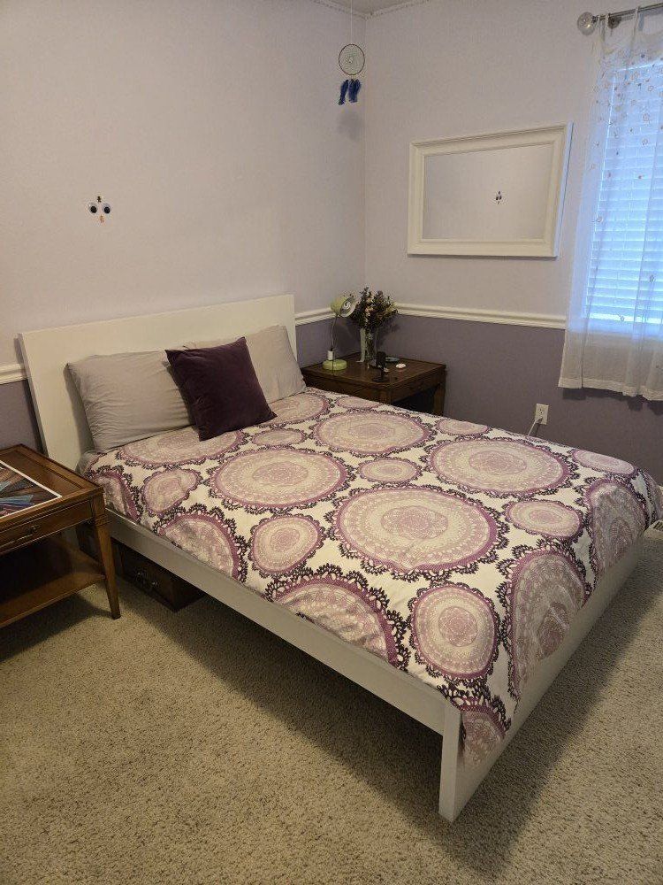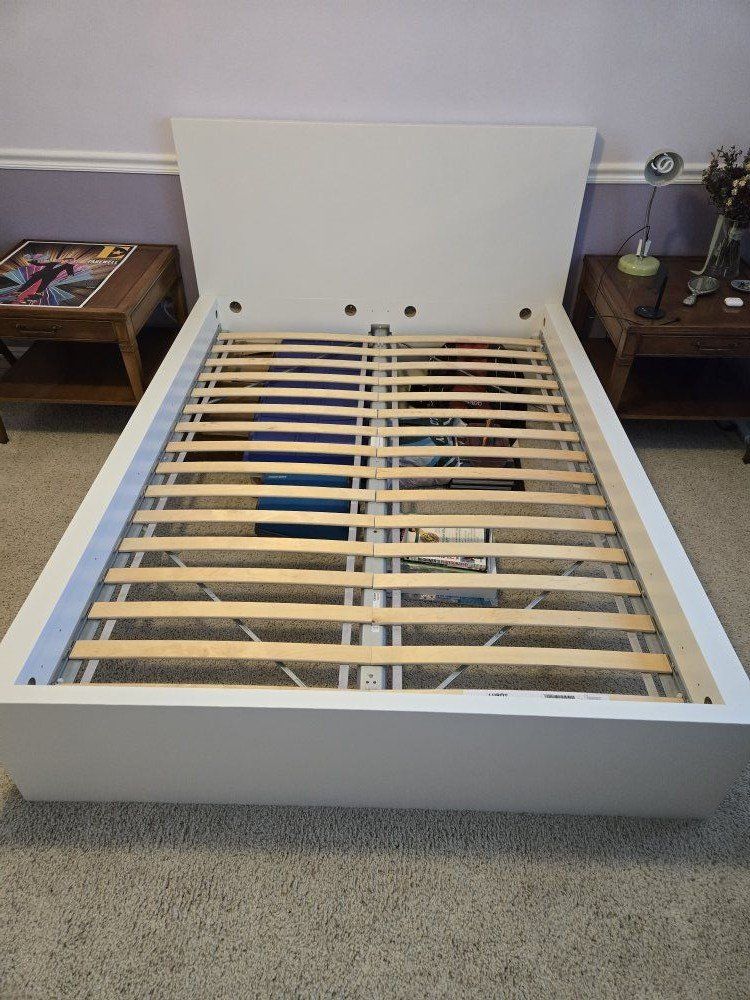VenmoFull Size IKEA bed. Malm model. White. $229 at IKEA. Extremely easy to assemble. Selling because I need a queen size bed. Mattress slats included (sold seperately at IKEA for $40). Comes with instruction book. If you want the bedding we can negotiate a price. The Mattress is FREE if you want it. Its in good shape with lots of life left in it. Cash or Venmo. No codes or scams.